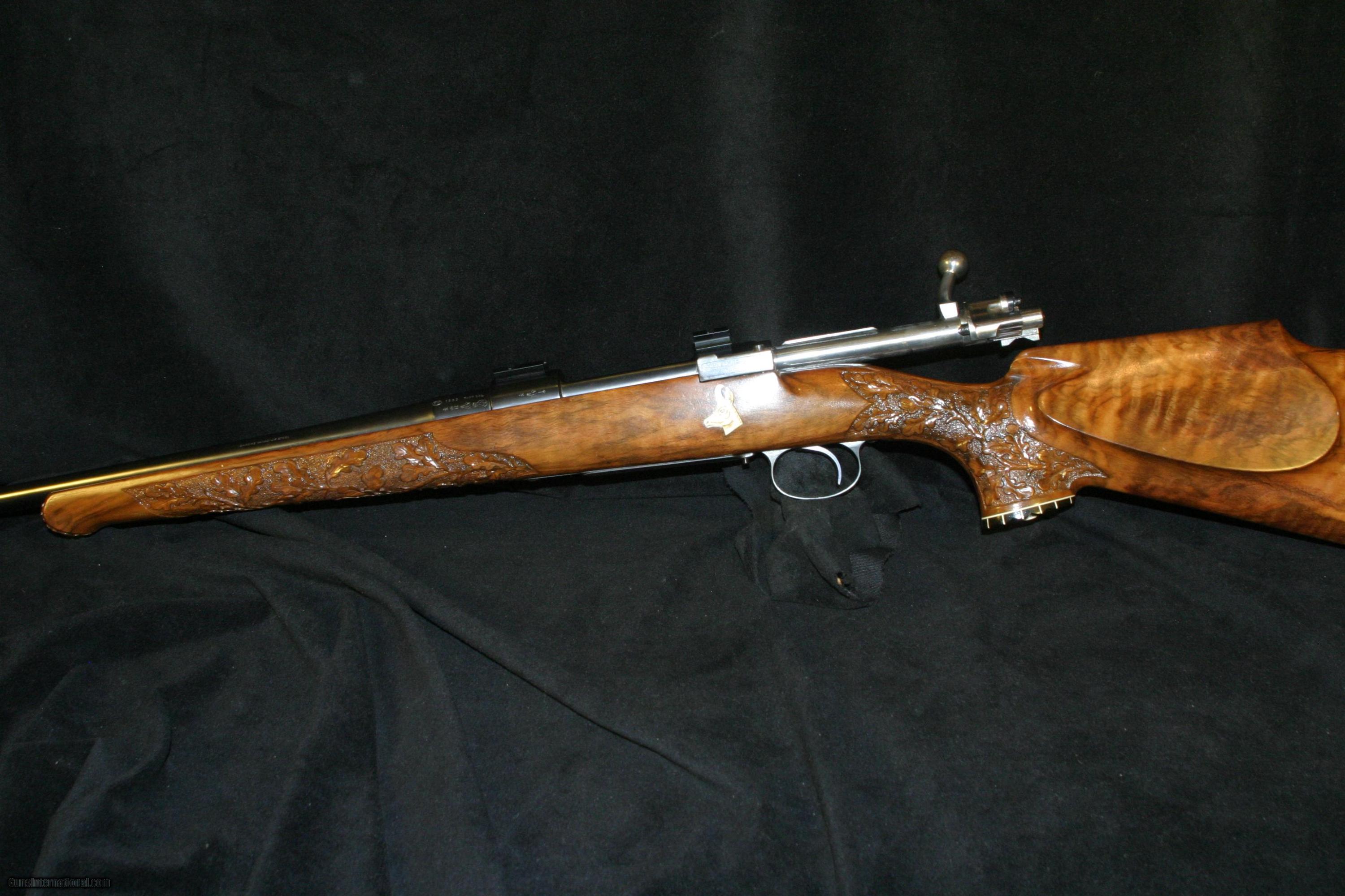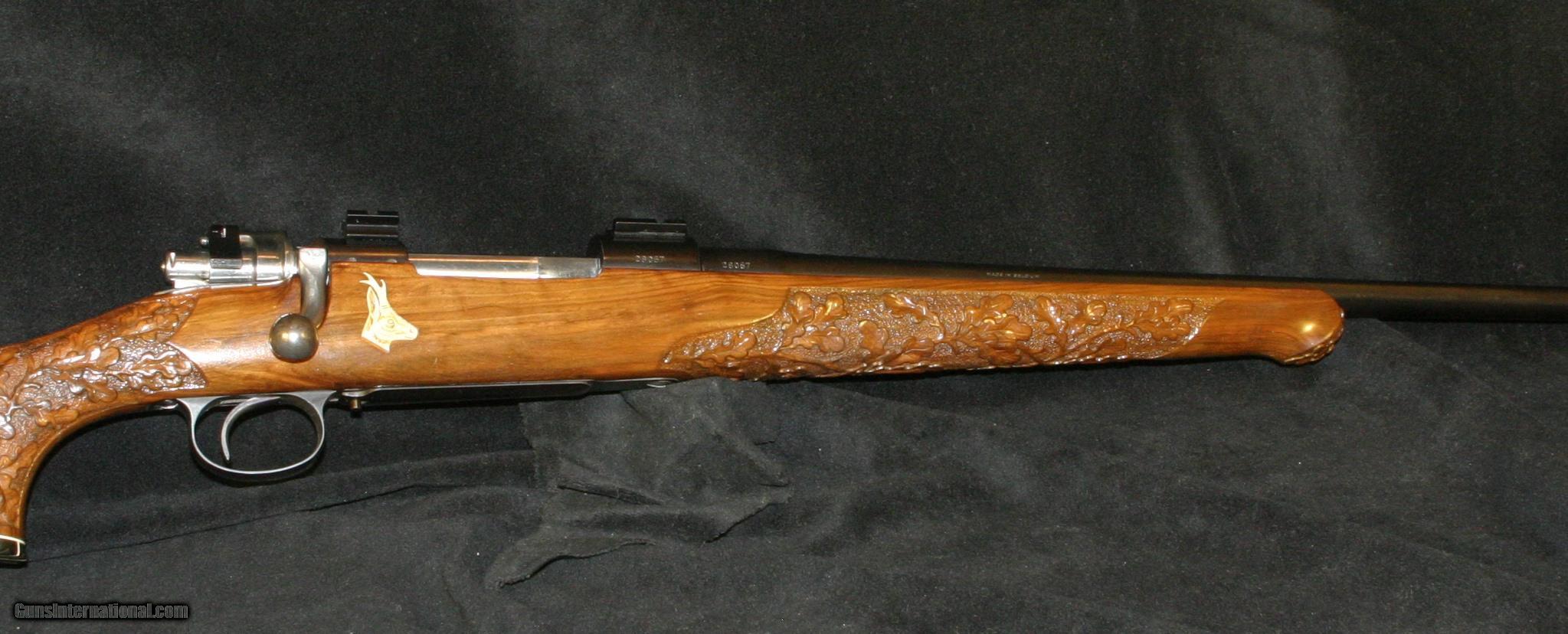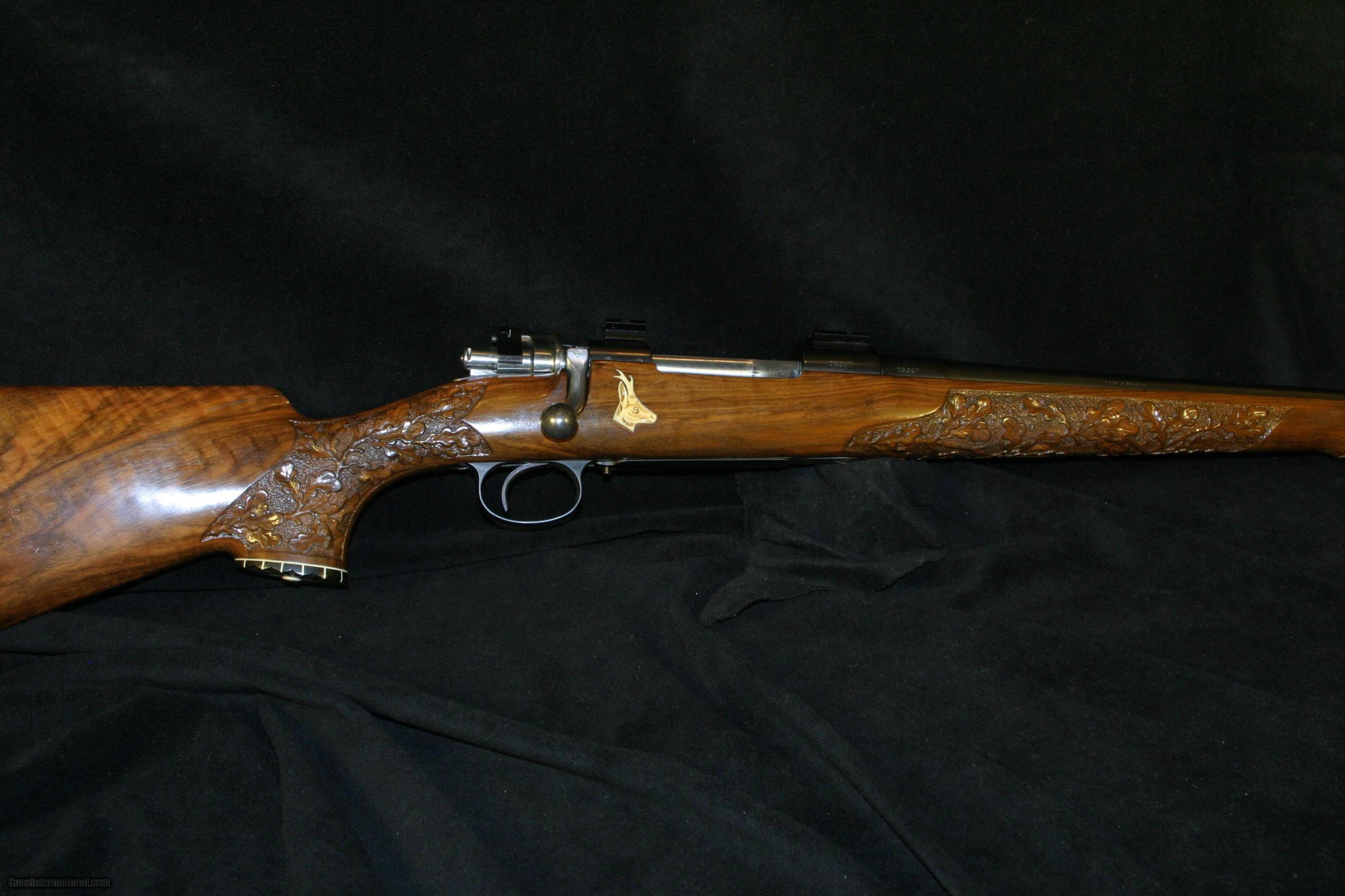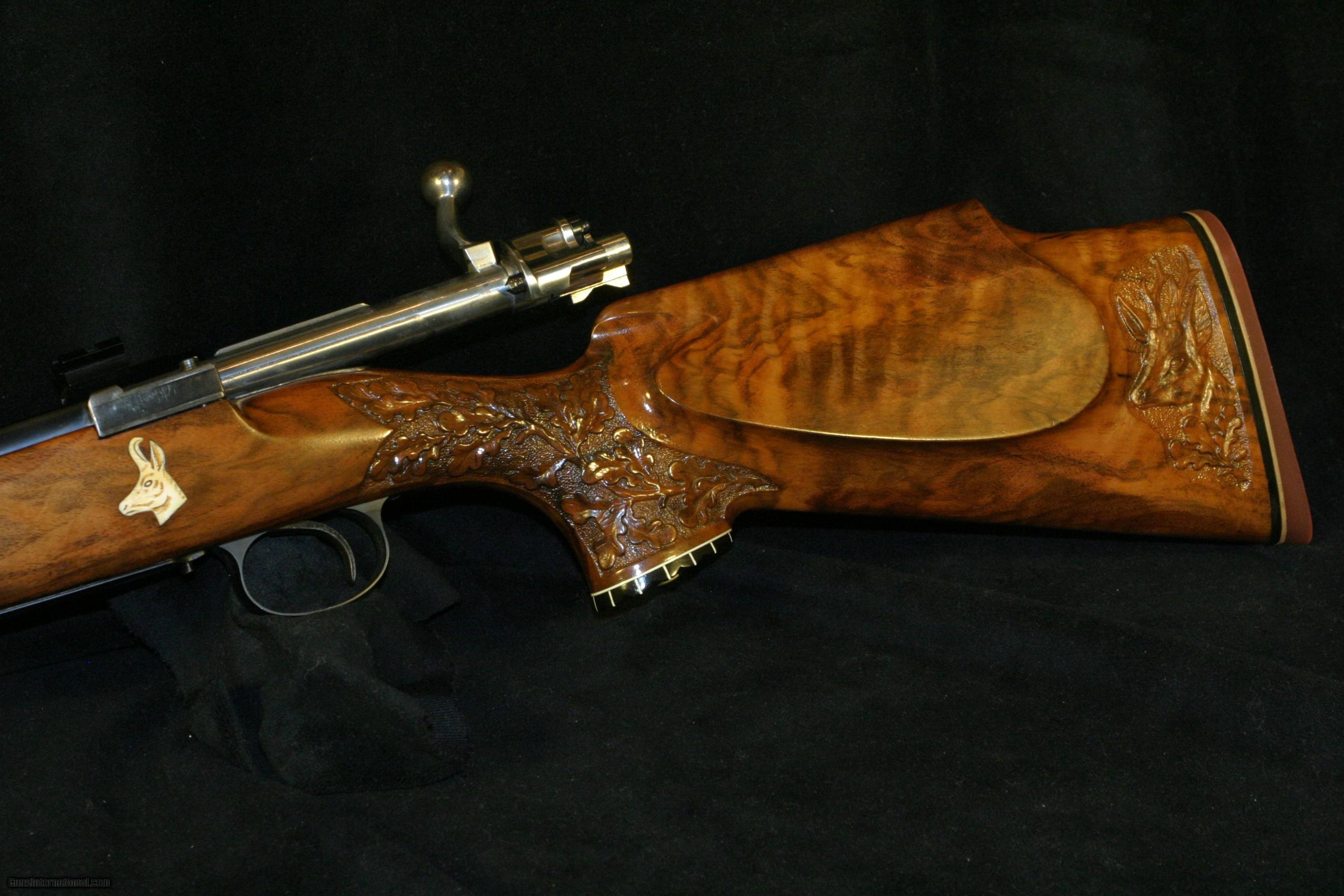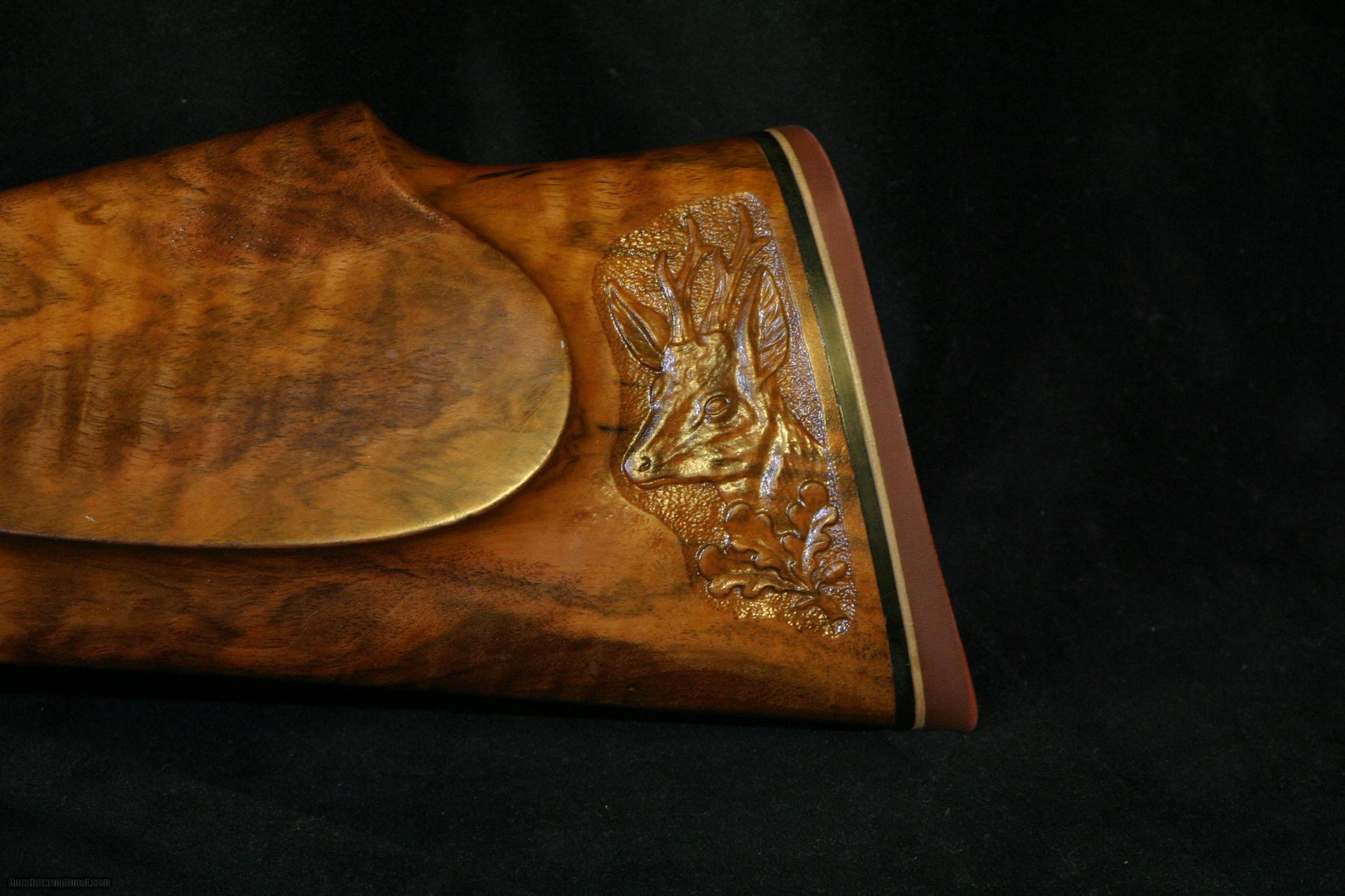 Description: A unique European sporting rifle in an all time classic cartridge, 7X57 Mauser, German stocked,carved with Roe deer, oak leaves and acorns. Ivory inlays of two Roebuks on each side of a fine European walnut stock. Using a fine 98 Mauser action and FN (Belgium) barrel suited to a Großwildjäger ( big game hunter). Commissioned at Ramstein Rod& Gun club at Ramstein Air Force base,Germany. The recoil pad is stamped with this information. Overall condition is very good,excellent bore. Weighs 7.5 lbs Barrel is 24" . Drilled for Weaver scope bases. SOLD |