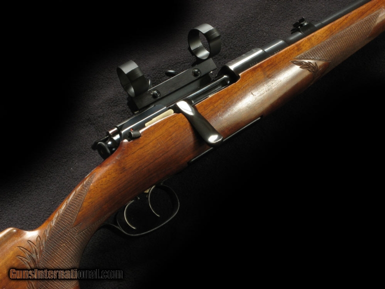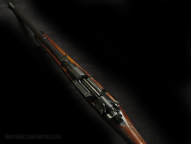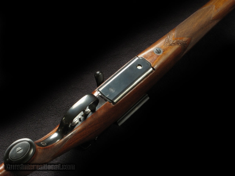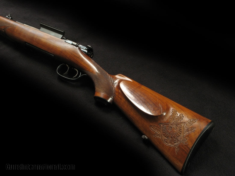 Description: Very rare factory custom carved stock on this pristine 1950 with double set triggers and expertly fitted Griffin & Howe side mount w 30mm rings. 24" barrel with original iron sights and excellent bore, 7 3/4lb. All safeties and triggers function correctly. Very high condition ... near new other than some light scratches on cheekpiece, couple of tiny handling marks, and front hood missing. Austrian coat of arms expertly carved into stock (appropriately I may add). Belly up collectors! There are plenty of 270s around but not many in this condition and this one is uniquely collectible. SOLD Curio/Relic: Yes |