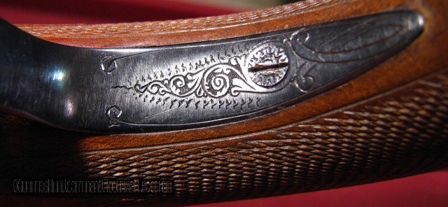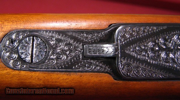 Description: Eduard Kettner, Suhl custom Mauser in 30-06 with a 24" round barrel with a full length solid rib with a quarter rib configuration and integral ramp front sight and attached sling swivel stud. One standing and two folding leaf express rear sights. Bore is as new. Built on a military Mauser 98 action with tang safety, double set triggers, and a lever release floorplate. Griffin & Howe sidemount with a Redfield 2 3/4X scope with center dot and fine crosshairs. Floorplate and trigger guyard with 70% coverage well executed and tastefull scroll engraving. Buttplate and grip cap screws also engraved. Pistol grip buttstock of nice European Walnut with Bavarian cheekpiece and schnable forend tip. Point pattern checkering with a mullered border. Eduard Kettner is a well known German maker. This appears to be a post-war piece likely built for a service member. It has light handling marks but appears to have never been hunted. The Griffin & Howe sidemount was likely added on arrival to the States. SOLD |