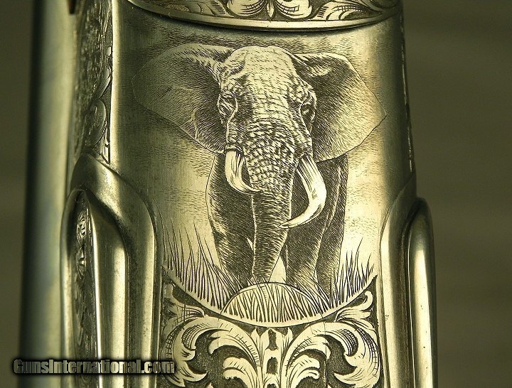 Description: #60957, Sandro Lucchini, Brescia, Italy: A Back Action Sidelock Ejector 500 3" Nitro Express with a Spare Set of Factory 20 Gauge Barrels, Made in 2000, A Sidelock Best 500 3" Nitro Express Finished at Lucchini in 2000, It has 25 1/2" Ejector Chopper Lump barrels, 1/4 rib with 1 standing & 2 folding Gold lined sight blades, Bolstered frame, Double triggers with the front articulated, Long top strap over the comb, Trap grip cap which holds a spare front sight bead, A very nice piece of wood with excellent black/brown contrast, A slight beavertail forend, Shadowline cheekpiece, 14 3/8" LOP over a 1" leather pad with plugs for removal, Sling eyes, 9 lbs. 13 Oz., The spare 20 Bore has 28" Ejector Chopper Lump barrels at .624 .006 & .011" (Imp.Cyl. & Open Mod.), Original 3" chambers, The 20 Bore barrels has it's own slight beavertail, It weights 7 lbs. 4 oz. as a 20 Bore, 98% coverage with the African Big 5 plus floral engraving on the balance of the frame, trigger guard, grip cap and toplever, Coin finished frame, The frame finish at 100%, The barrels retain 98% blue, The stock & forend remain at 97%, The checkering is at 100%, The wood remains extremely stout and as strong as when it was built, The bores are as new and retain all of their life left in them. Here is a solid Italian Sidelock in a neat cartridge. Rifle Caliber: .500 Nitro Express Shotgun Gauge: 20 Gauge Price: $39,000.00 Contact Seller |