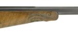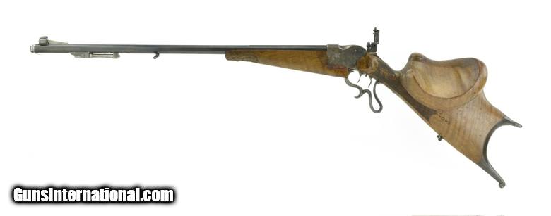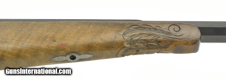 Description: German Zimmerstutzen Rifle approximately 4mm caliber. Excellent bore. Barrel is 29” long. Barrel has a milled top rail for sliding barrel sight. We do not have the barrel sight but there is a tang sight. Front sight is a thin post with dot on top of post. Gun has set triggers. Stocks are very good and well carved leaf and acorn motif. Forend has a small wood repair on both right and left sides where the forend contacts the frame. Action works perfectly. Barrel is marked “F. Scholl, Munchen” in silver. Receiver has approximately 50-60% case colors. Barrel has approximately 92-94% blue. Note: Tang sight appears to be missing a diopter or some type of eye piece. SOLD |