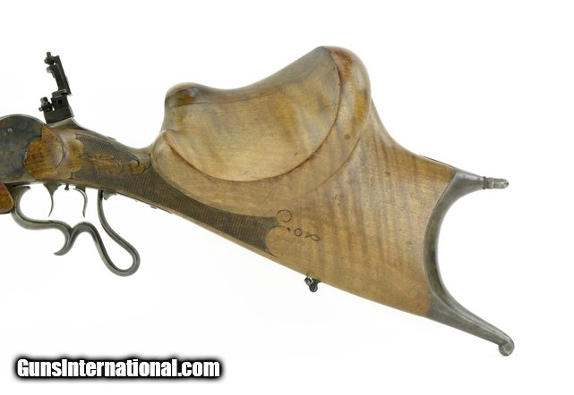 German Zimmerstutzen Rifle approximately 4mm caliber. Excellent bore. Barrel is 29” long. Barrel has a milled top rail for sliding barrel sight. We do not have the barrel sight but there is a tang sight. Front sight is a thin post with dot on top of post. Gun has set triggers. Stocks are very good and well carved leaf and acorn motif. Forend has a small wood repair on both right and left sides where the forend contacts the frame. Action works perfectly. Barrel is marked “F. Scholl, Munchen” in silver. Receiver has approximately 50-60% case colors. Barrel has approximately 92-94% blue. Note: Tang sight appears to be missing a diopter or some type of eye piece.