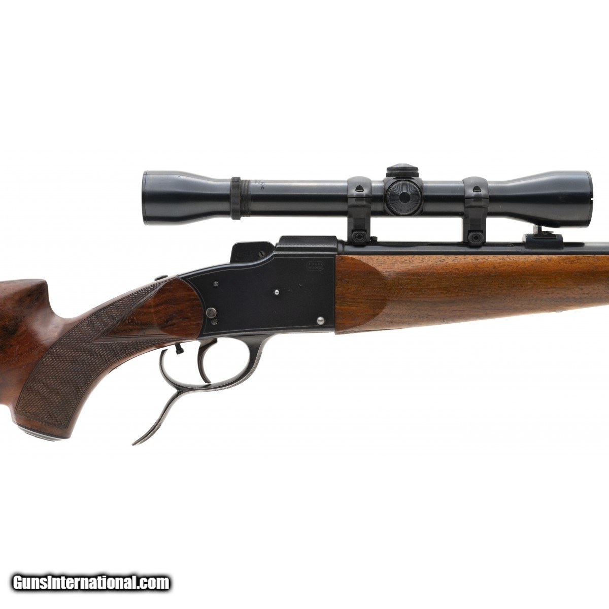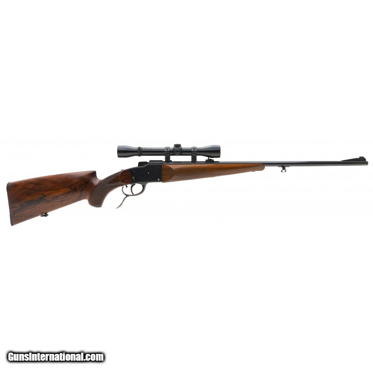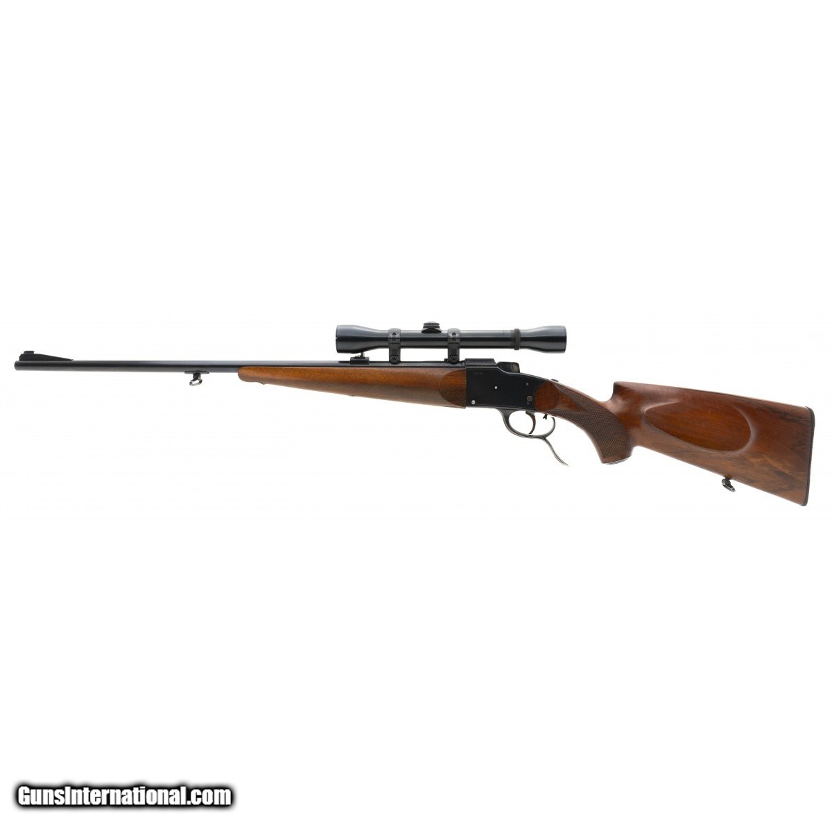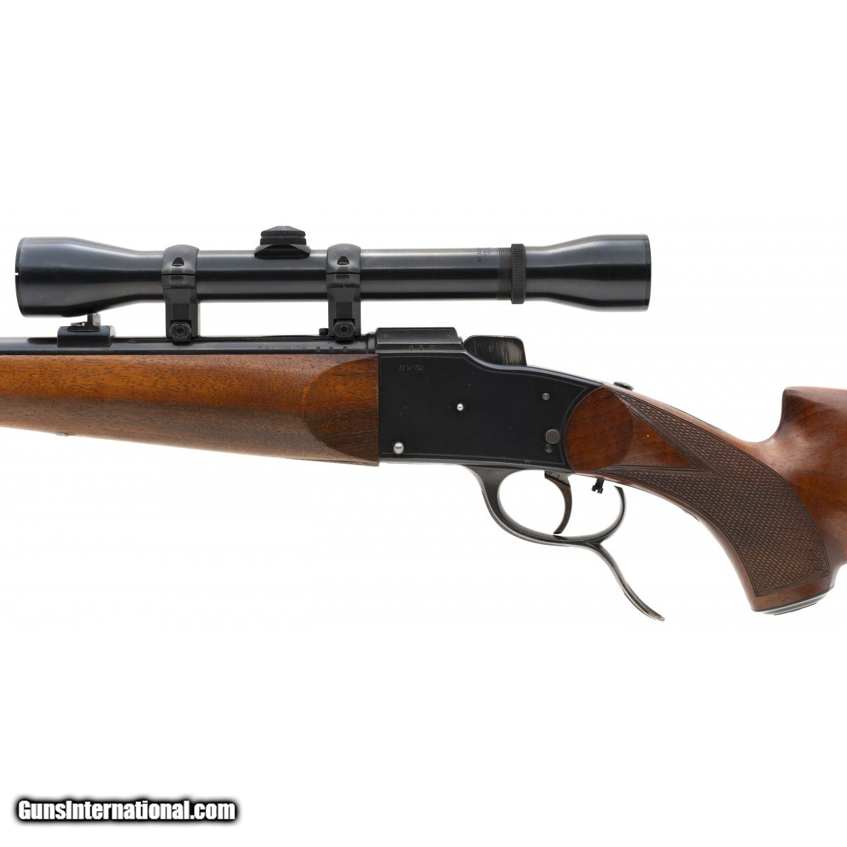 Description: " German single shot sporting rifle in popular .22 Hornet. Bore is excellent. Walnut stock is nicely checkered, and checkering is sharp. Adjustable trigger. Comes with a Weaver K-4 scope. Optics are clear. Very good plus overall condition. SOLD |