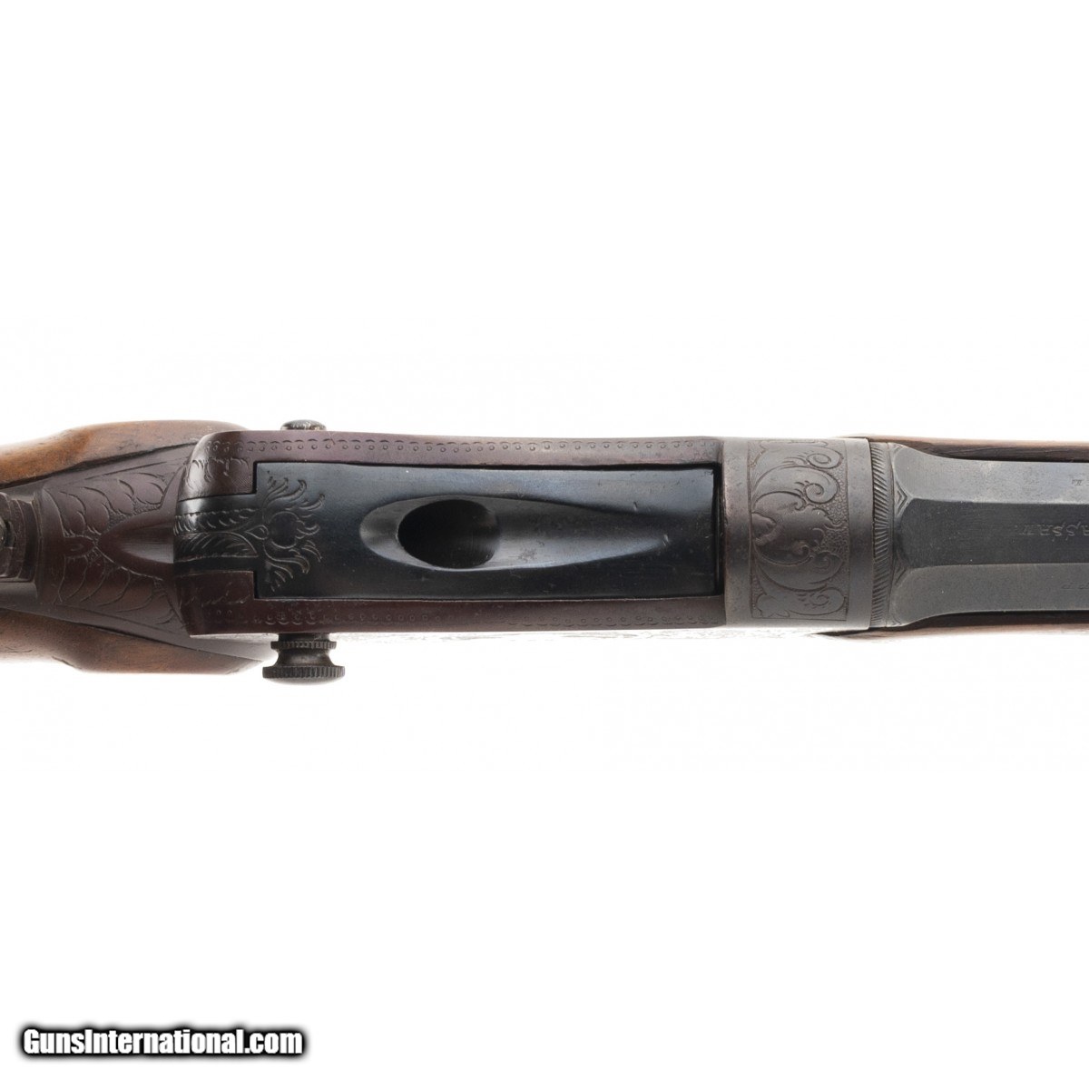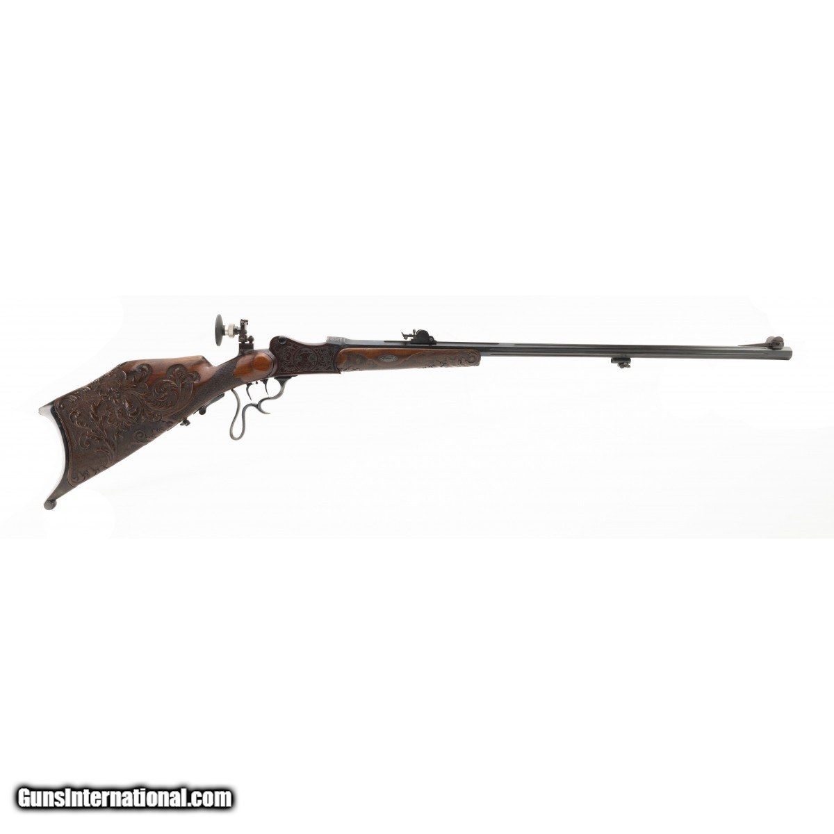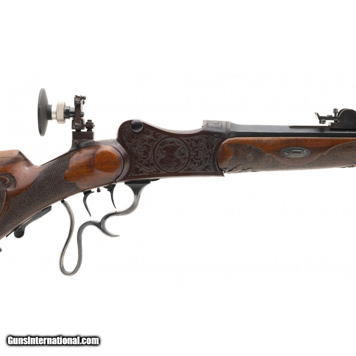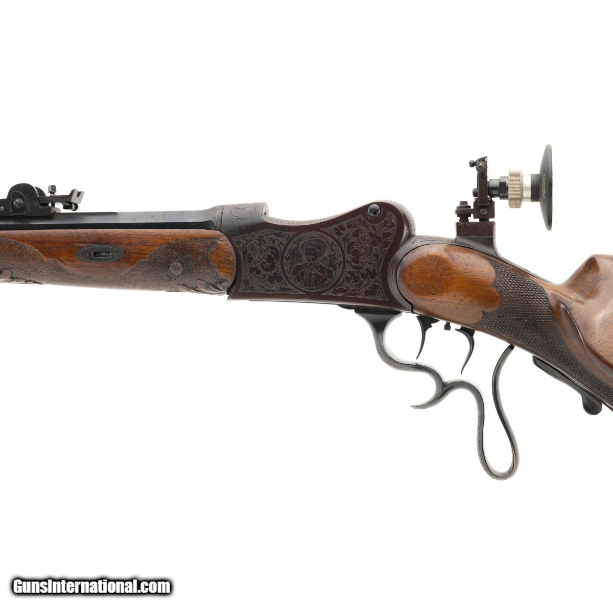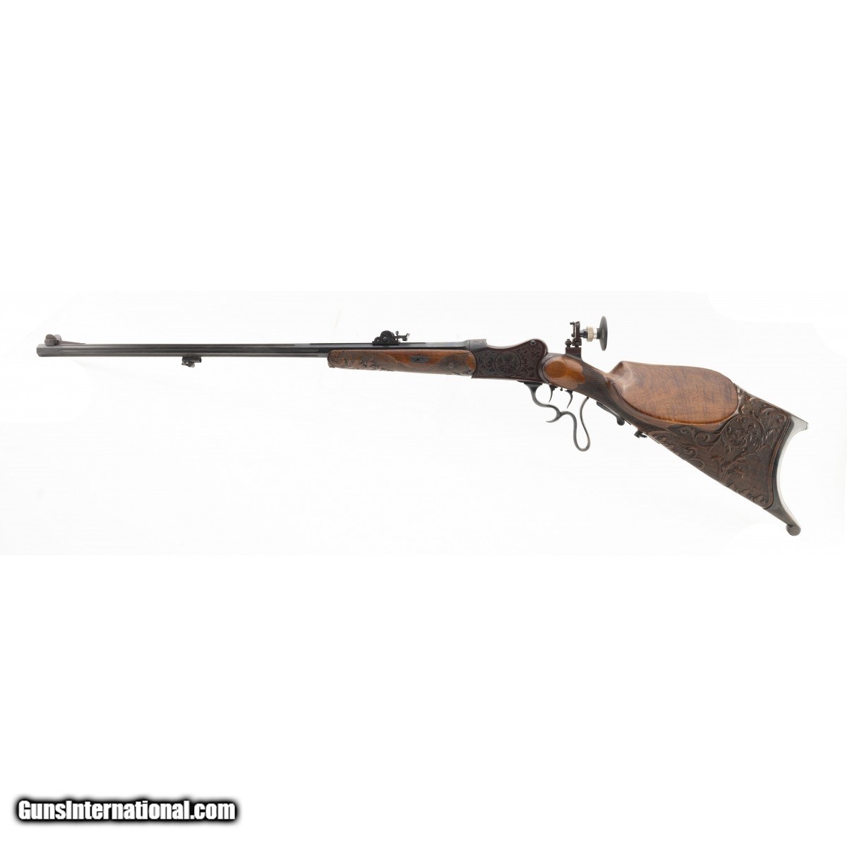 Description: " Very fine Schuetzen chambered in the traditional cartridge of target shooters in Germany. The bore is excellent with sharp rifling. The action works fine and we have test fired it. Front and rear barrel sights are fine tuned for windage and elevation. The receiver rear tang has a W. Haunz large diopter with seven adjustment posts on the base. The frame is engraved with traditional German floral and leaf motifs. The sides of the frame feature an older man smoking a long stem pipe and wearing the coat and tie of a hunter. He is wearing a tilted hat. The reverse side of the frame is a Frauline wearing a verndal and a stylish hat. The stocks are very well carved in deep floral motifs with the right side of the butt stock showing a stag amidst a profusion of deep floral carvings. The left side of the butt stock is a wild boar with similar carvings as on the right side. The forend is carved en suite with the butt stock carvings. The rifle has 98% of its' blue. The barrel is fluted and 28"". The triggers are adjustable double set. Overall a very fine Schuetzen in a very desirable caliber with high quality wood and metal work. Overall length is 46"" over a Schuetzen butt plate. SOLD |