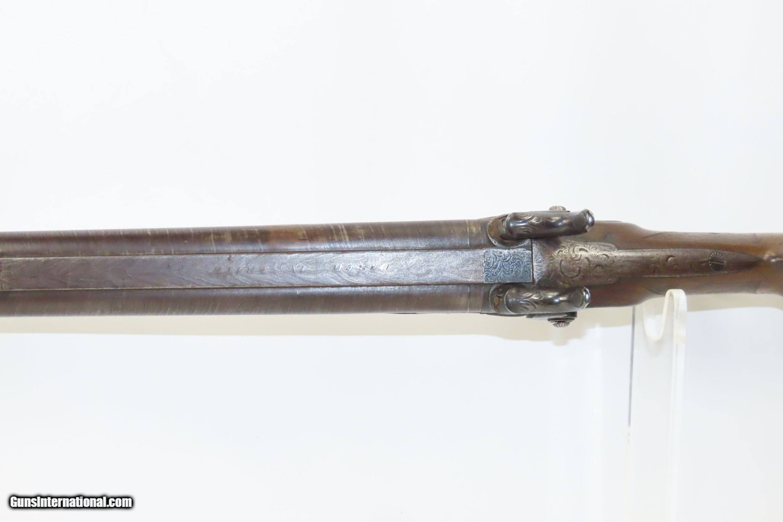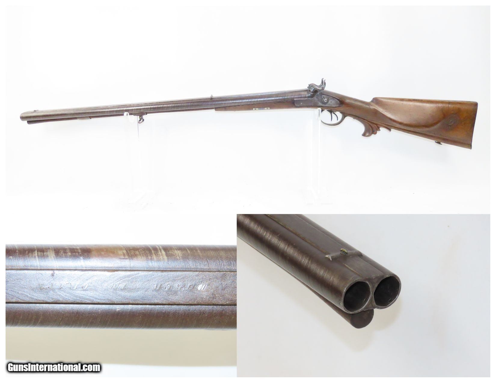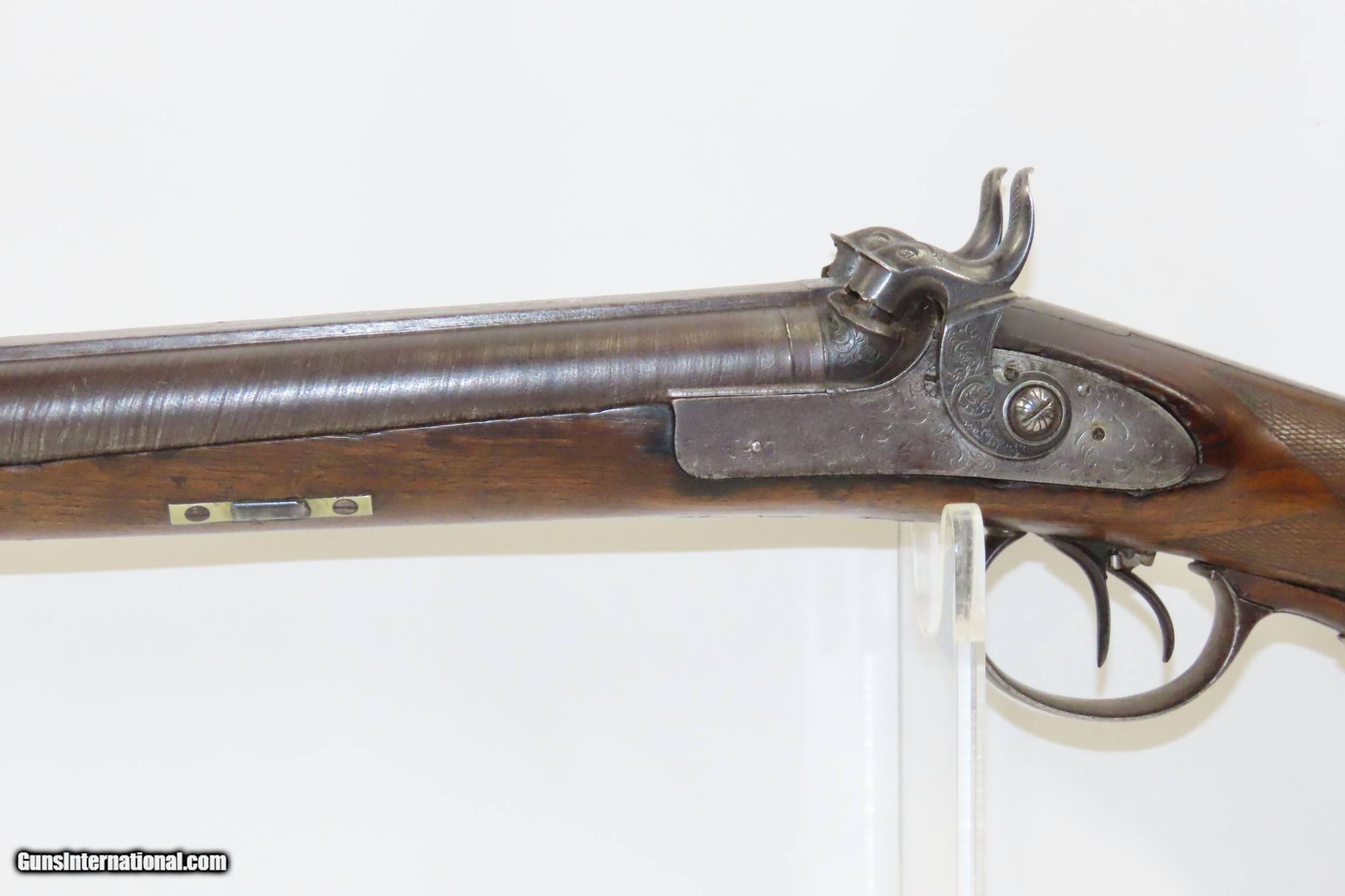 Description: AUSTRIAN Antique “DASCH IN GRATZ” DOUBLE Rifle .65 Caliber PERCUSSION SxS EUROPEAN Hunting Rifle Made Circa the Mid-1800s Here we present an antique Austrian Percussion Double Rifle, made circa the 1830s in Graz, Austria. Cajetan Dasch was a maker of firearms from approximately 1800 until his death in 1840. His wife is said to have carried on the business another 8 or so years. While alive, he was known for his work and made rifles to order for clients as far as Paris, London, Rome, and Naples. This rifle features side by side barrels with a shared front and rear sight. The rear sight is set further forward and makes for quick sight acquisition. The barrels are Damascus twist and there is a Liege proof mark on the underside. Interestingly, the left barrel has twisted rifling while the right barrel has virtually straight rifling. Each bore has its own lock and trigger. The double triggers seem to be set up for a left-handed individual as they are in opposite order to most other guns. The left (front) trigger has a single set feature for a more precision shot, which makes sense as that barrel has twist. The other bore with the straight rifling is probably like that for faster loading (ie. it is easier not to fight against twisted rifling), straight rifling is by some accounts more accurate than a smooth bore, and it could be loaded with shot and perhaps have less effect on patterning versus a twisted rifling. This rifle also showcases Germanic styling to include the blockish, fluted butt stock with the sliding wooden patchbox, the carved wooden trigger guard, sling attachments, and engraved touches on the trigger guard, barrel tang, butt plate tang, etc. The maker’s mark “DASCH IN GRATZ” is marked in silver on the top of the barrel rib. The overall condition is good+. The actions are strong. The bores are in good shape for age with deep, sharp rifling. The stock is solid. An attractive Austro-German double rifle! Own the original! This is a legitimate antique and not a reproduction. Barrels are 27-1/2 inches. Caliber: .65 Overall condition as seen in photos. Very Fast. Very Safe. FREE SHIPPING WORLDWIDE. Delivered directly to your door by express mail! Guaranteed AUTHENTIC & Includes CERTIFICATE OF AUTHENTICITY. ancestryguns $1800 #220343 SOLD Antique: Yes |