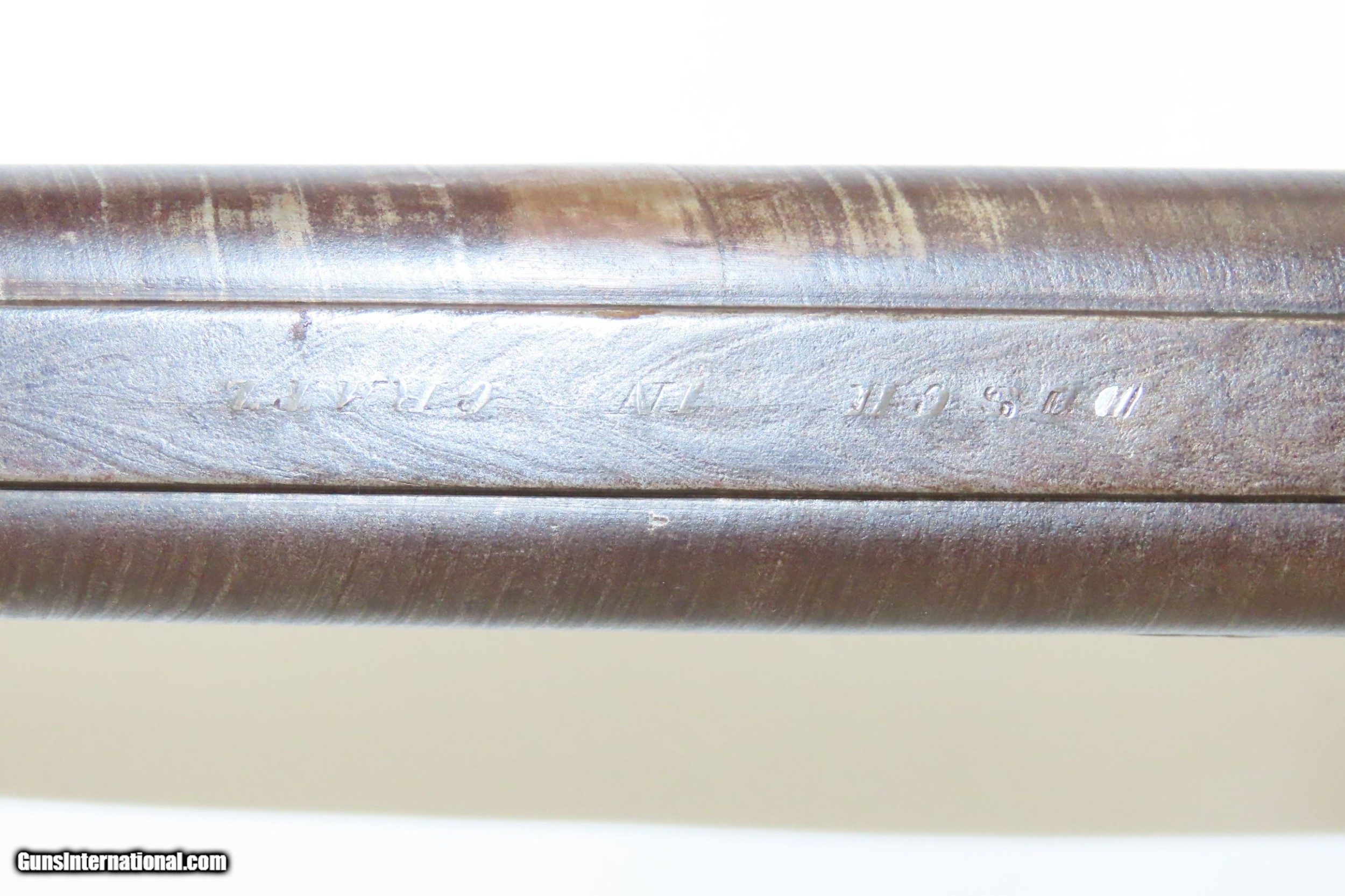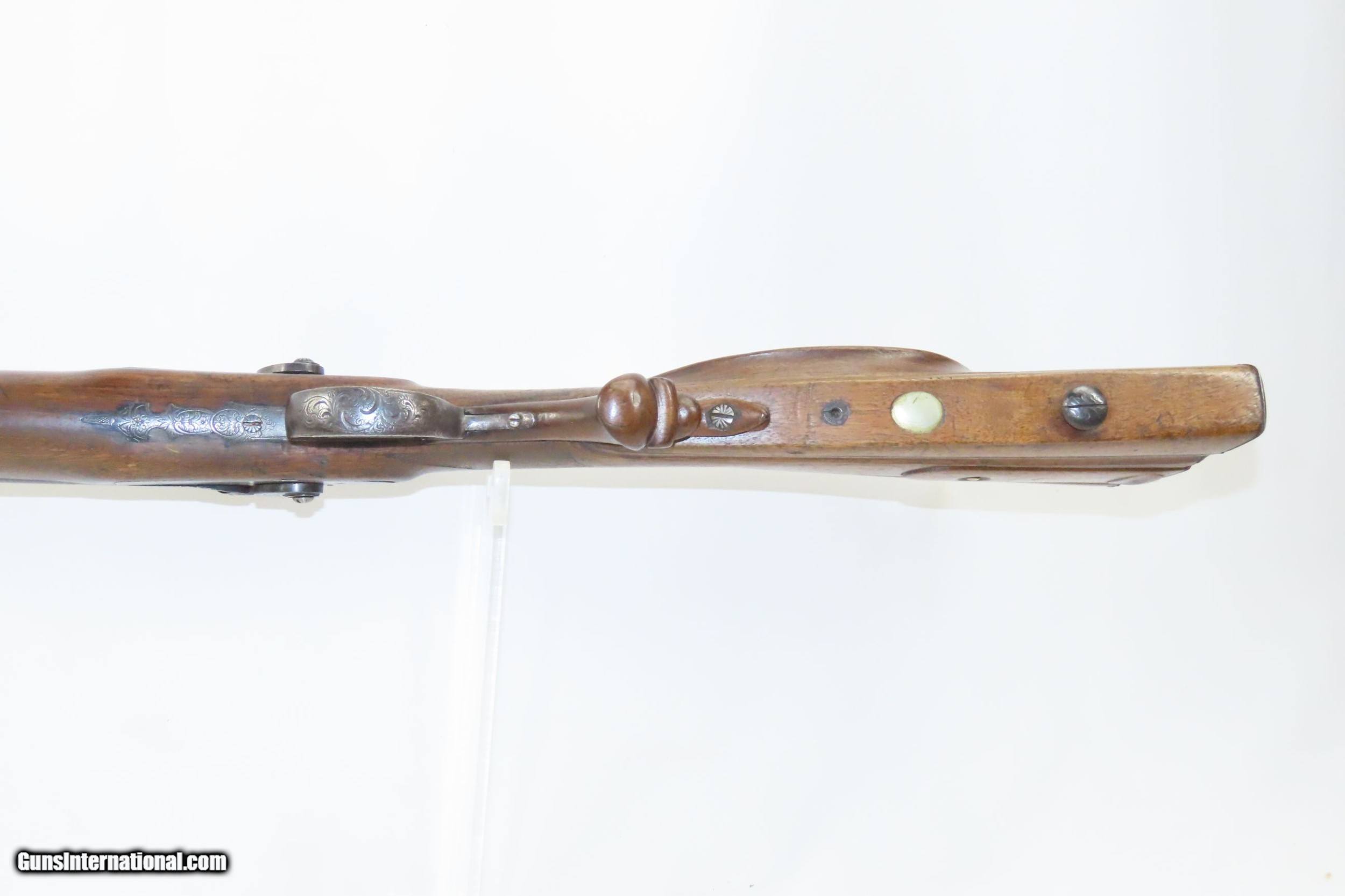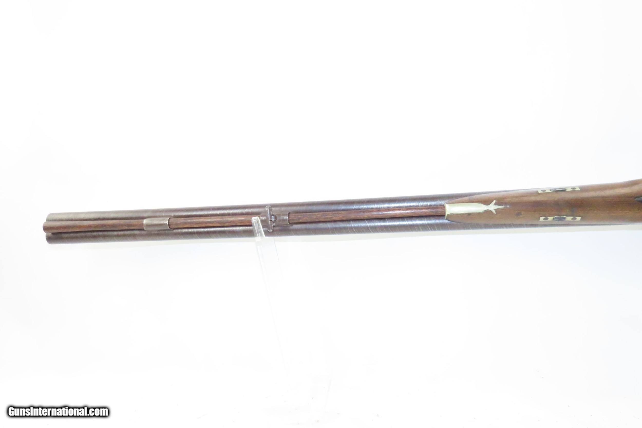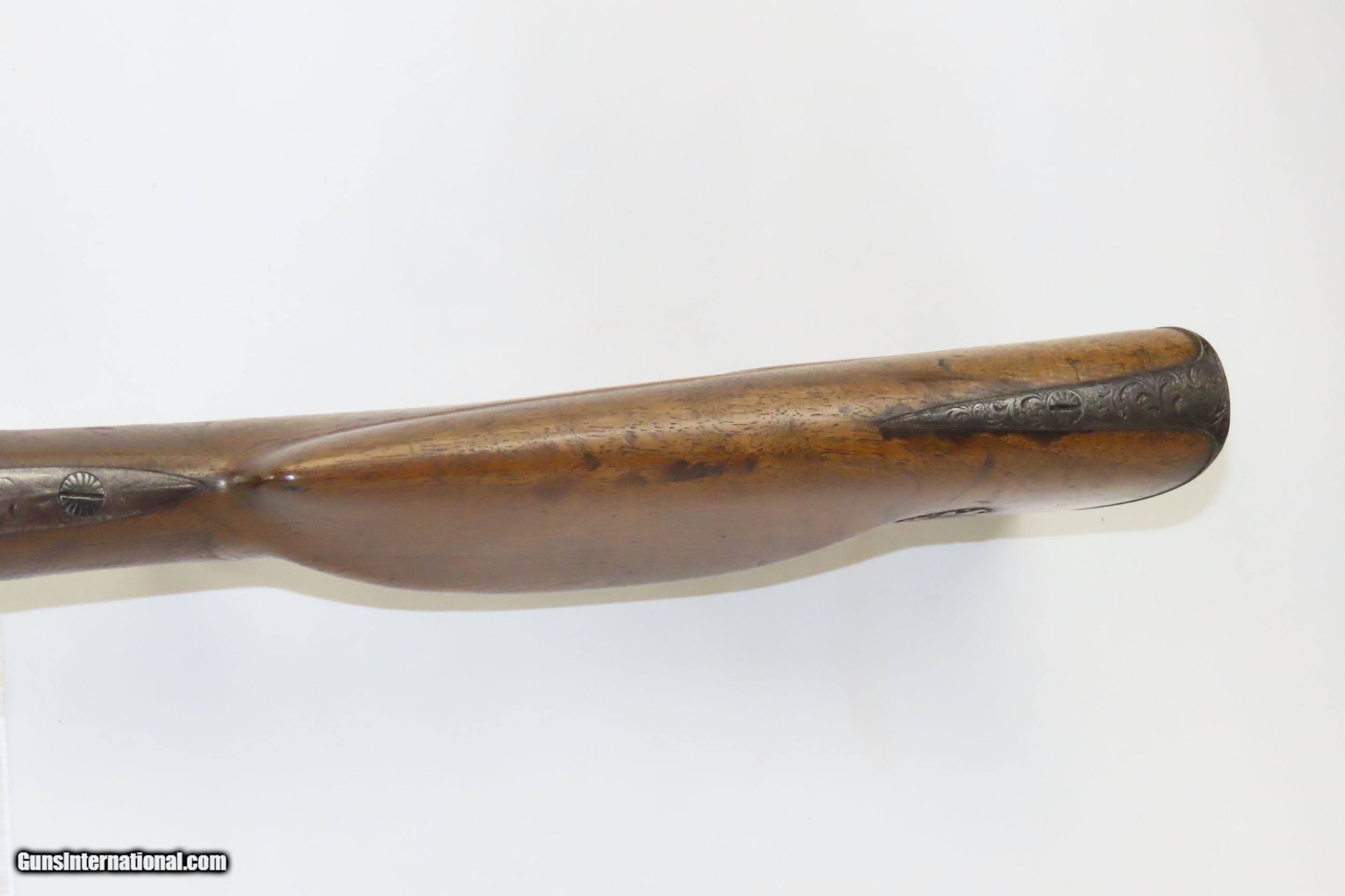 Description: AUSTRIAN Antique “DASCH IN GRATZ” DOUBLE Rifle .65 Caliber PERCUSSION SxS EUROPEAN Hunting Rifle Made Circa the Mid-1800s Here we present an antique Austrian Percussion Double Rifle, made circa the 1830s in Graz, Austria. Cajetan Dasch was a maker of firearms from approximately 1800 until his death in 1840. His wife is said to have carried on the business another 8 or so years. While alive, he was known for his work and made rifles to order for clients as far as Paris, London, Rome, and Naples. This rifle features side by side barrels with a shared front and rear sight. The rear sight is set further forward and makes for quick sight acquisition. The barrels are Damascus twist and there is a Liege proof mark on the underside. Interestingly, the left barrel has twisted rifling while the right barrel has virtually straight rifling. Each bore has its own lock and trigger. The double triggers seem to be set up for a left-handed individual as they are in opposite order to most other guns. The left (front) trigger has a single set feature for a more precision shot, which makes sense as that barrel has twist. The other bore with the straight rifling is probably like that for faster loading (ie. it is easier not to fight against twisted rifling), straight rifling is by some accounts more accurate than a smooth bore, and it could be loaded with shot and perhaps have less effect on patterning versus a twisted rifling. This rifle also showcases Germanic styling to include the blockish, fluted butt stock with the sliding wooden patchbox, the carved wooden trigger guard, sling attachments, and engraved touches on the trigger guard, barrel tang, butt plate tang, etc. The maker’s mark “DASCH IN GRATZ” is marked in silver on the top of the barrel rib. The overall condition is good+. The actions are strong. The bores are in good shape for age with deep, sharp rifling. The stock is solid. An attractive Austro-German double rifle! Own the original! This is a legitimate antique and not a reproduction. Barrels are 27-1/2 inches. Caliber: .65 Overall condition as seen in photos. Very Fast. Very Safe. FREE SHIPPING WORLDWIDE. Delivered directly to your door by express mail! Guaranteed AUTHENTIC & Includes CERTIFICATE OF AUTHENTICITY. ancestryguns $1800 #220343 SOLD Antique: Yes |