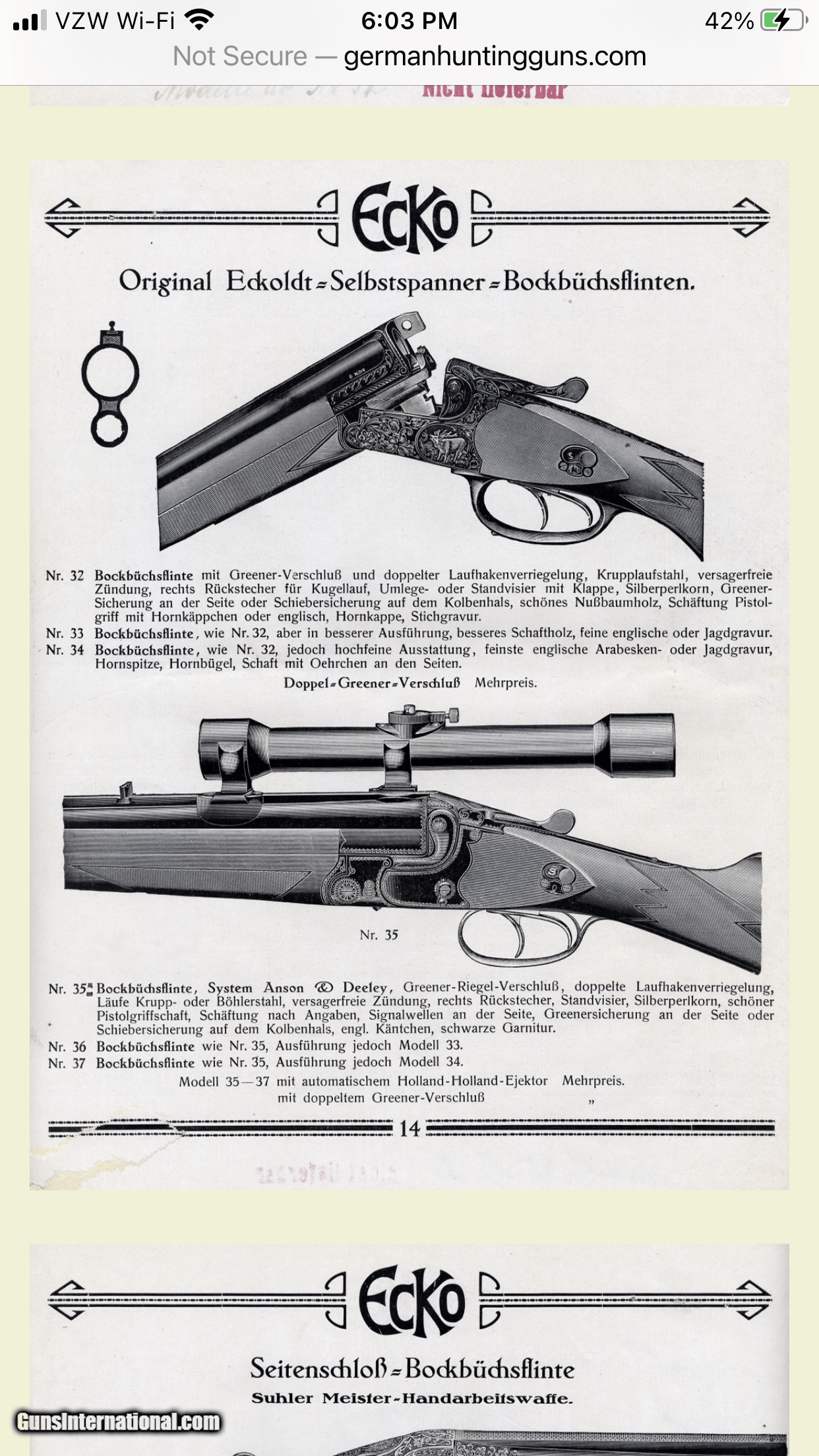 Description: This is the most beautiful rifle I've ever held in my hands. Highly engraved. Made by Emil Eckholdt of suhl, Germany. 16 gauge top barrel and 9.3 x 72R on the bottom. Push safety, triple flip up sight, engraved rib, ivory bead front sight, engraved stock and forearm, elk/stag scene on the left side and pheasants on the right side. Just an amazing piece. Please email with questions. Shipping and insurance included. Cards add 3% SOLD Manufacturer: Emil Eckholdt Model: Rifle/ Shotgun Condition: Used Metal Condition: Excellent Wood Condition: Excellent Bore Condition: Excellent Triggers: Double Rib: Solid Finish: Blue Sights: Triple flip up Engraving: Highly Item Location: 37075 |