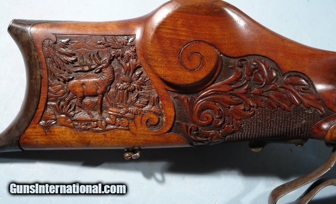 Description: EXCEPTIONAL GERMAN SYSTEM AYDT .22LR CAL. SCHUETZEN RIFLE SIGNED CARL GROSS OF ESSLINGEN. CIRCA LATE 1920’S. 49” overall with 32” octagon/fluted blued barrel signed in panel “CARL GROSS ESSLINGEN”. Original case hardened Schutzen tang sight and ramp front sight. Ornate game scene relief engraving on the case hardened frame and loading lever. Lever bow inlaid with inlaid silver scroll monogram “SA”. Relief game scene and oak leaf engraved and checkered walnut stock and forend. All original and excellent plus with approximately 95% the original blue and case hardening. Stock and forend with all the original finish. Perfect working order and near mint bore. Extra nice pre WW2 Schutzen in very desirable .22 Long Rifle caliber. "5,3mm" stamped under forend along with "SS" and "S" in shield and eagle proof. "B" under crown on right side of receiver. SOLD Curio/Relic: Yes |