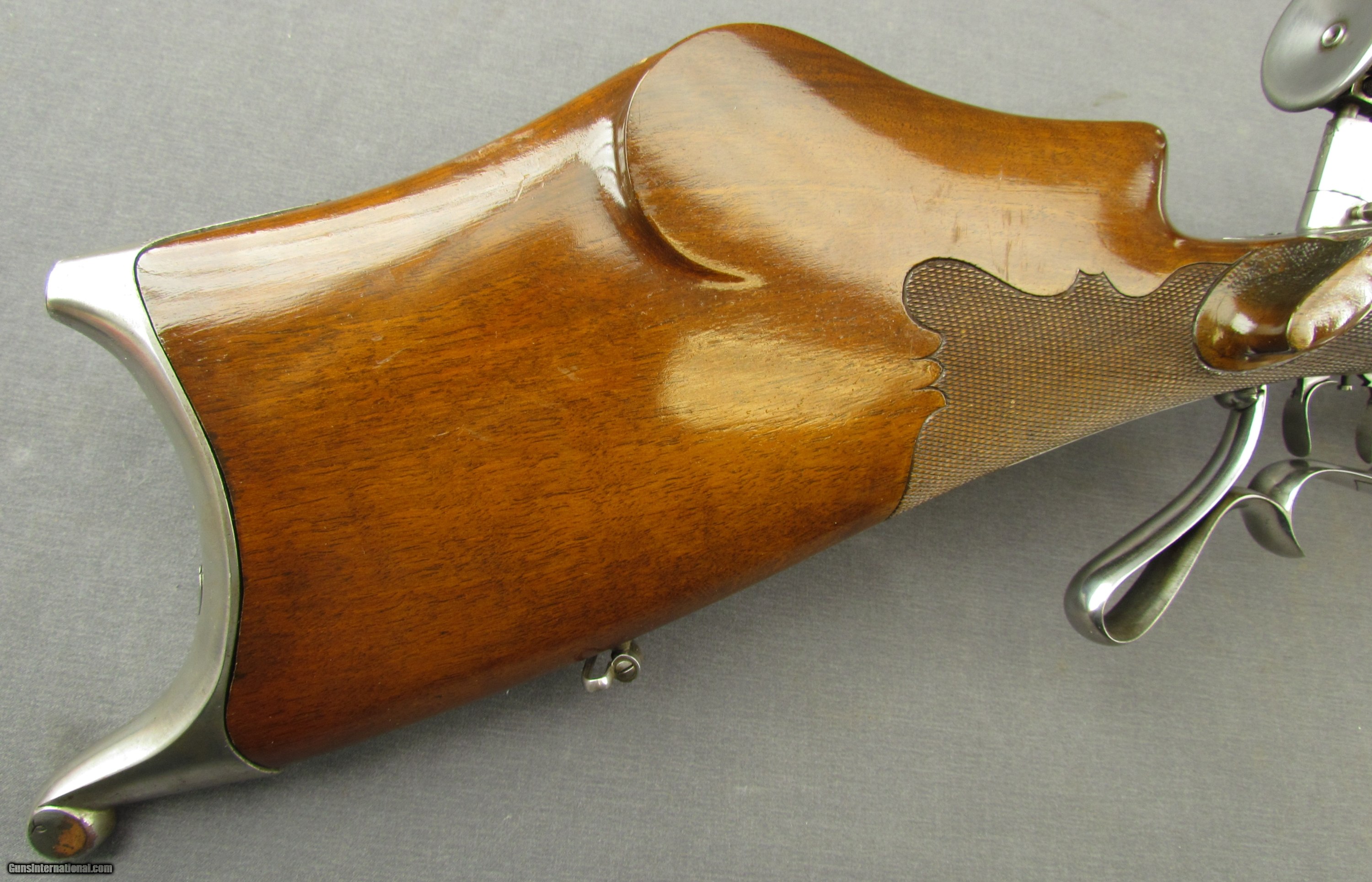 Description: Serial #1198, 4mm RF, 29" octagon barrel with an excellent, bright bore (actual bore length is approximately 8"). This is a well-made rifle that has been polished to bright, and now has some areas of mild plum-brown freckling at the muzzle, as well as scattered about the frame and lever. The rifle has the original target front sight fitted, as well as the original rear aperture sight with wide disk (also polished bright). A very small and unobtrusive import mark is present on the underside of the barrel just ahead of the forend tip. The forend is wedge-fastened with minor handling marks and blemishes scattered throughout. The buttstock is typically complex with thumb-rest, cheek-piece, and long, hooked butt, and the wood has a commensurate amount of minor handling marks and blemishes in the slightly glossy varnish finish. Unlike most Zimmerstutsen, this example has the short bore located at the breech-end of the false “barrel" rather than at the muzzle, so the rifle can be loaded in the conventional way by opening the breech. The action is smooth, and the double-set triggers are smooth with a crisp let-off when set. This is a neat Zimmerstutzen variation, and rates very good overall. FFL or C&R SOLD Curio/Relic: Yes Manufacturer: Aydt Model: Zimmerstutzen Serial Number: 1198 Caliber Info: 4mm Gauge Info: 4mm |