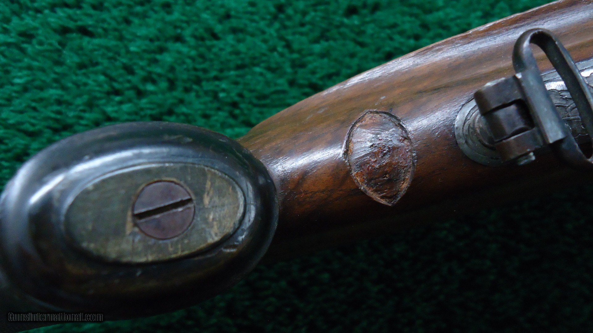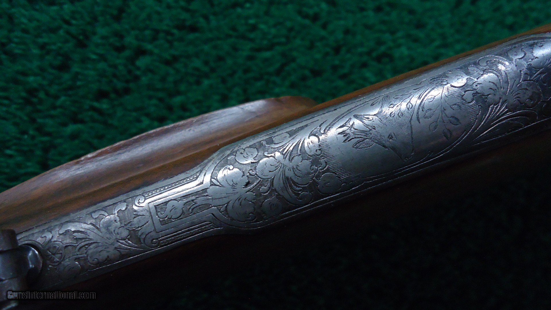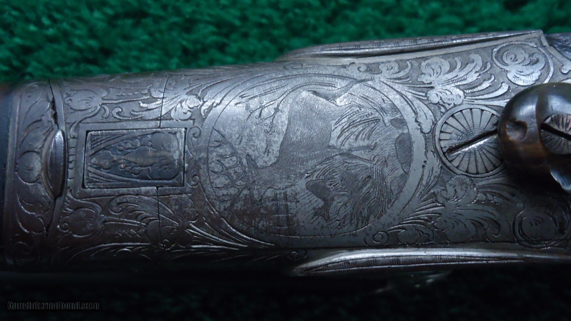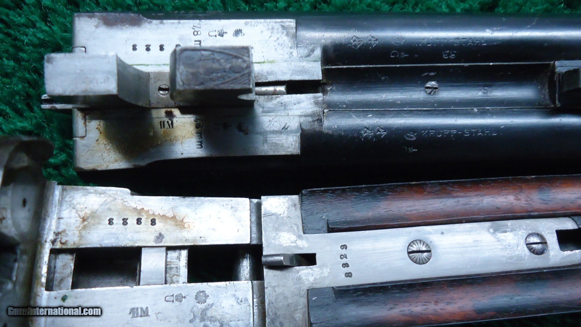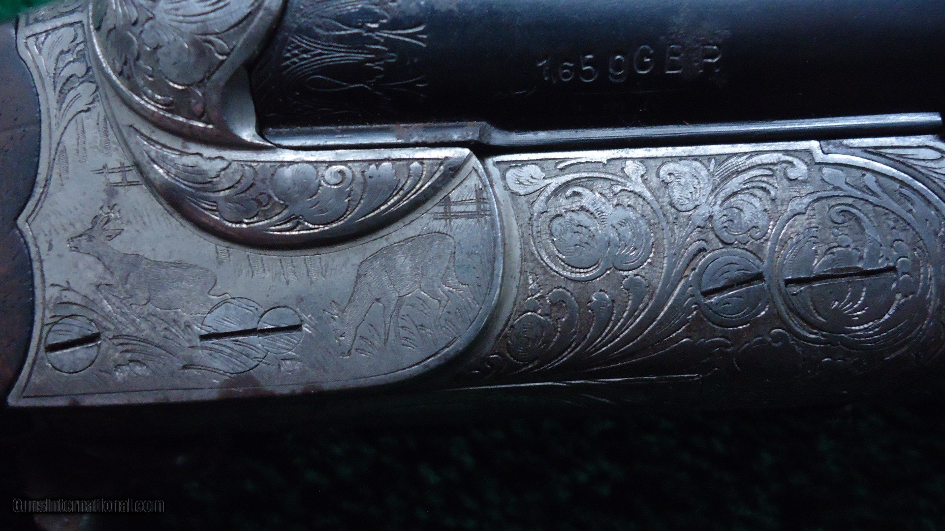 Description: 23-3/4 inch barrels of Krupp Fluid Steel. Nicely engraved with game scenes. Bore is fair with some light pitting. Original sights include a bead front sight, flip up rear sight and claw mounted scope blocks with no scope. Wood shows some use but generally very good with a cheek piece and checkered pistol grip. There is an added extension making the LOP 16-1/8 inches. Top opener. Double triggers and horned trigger guard. Leroy Merz Antique Firearms specializes in antique and vintage Winchesters and other fine American firearms. Since 1965 Mr. Merz has taken part in the world of firearms and has been a contributor to many well known reference books. We have hundreds of additional guns in every price range at our home online. Search for Merz Antiques in google. SOLD Curio/Relic: Yes |