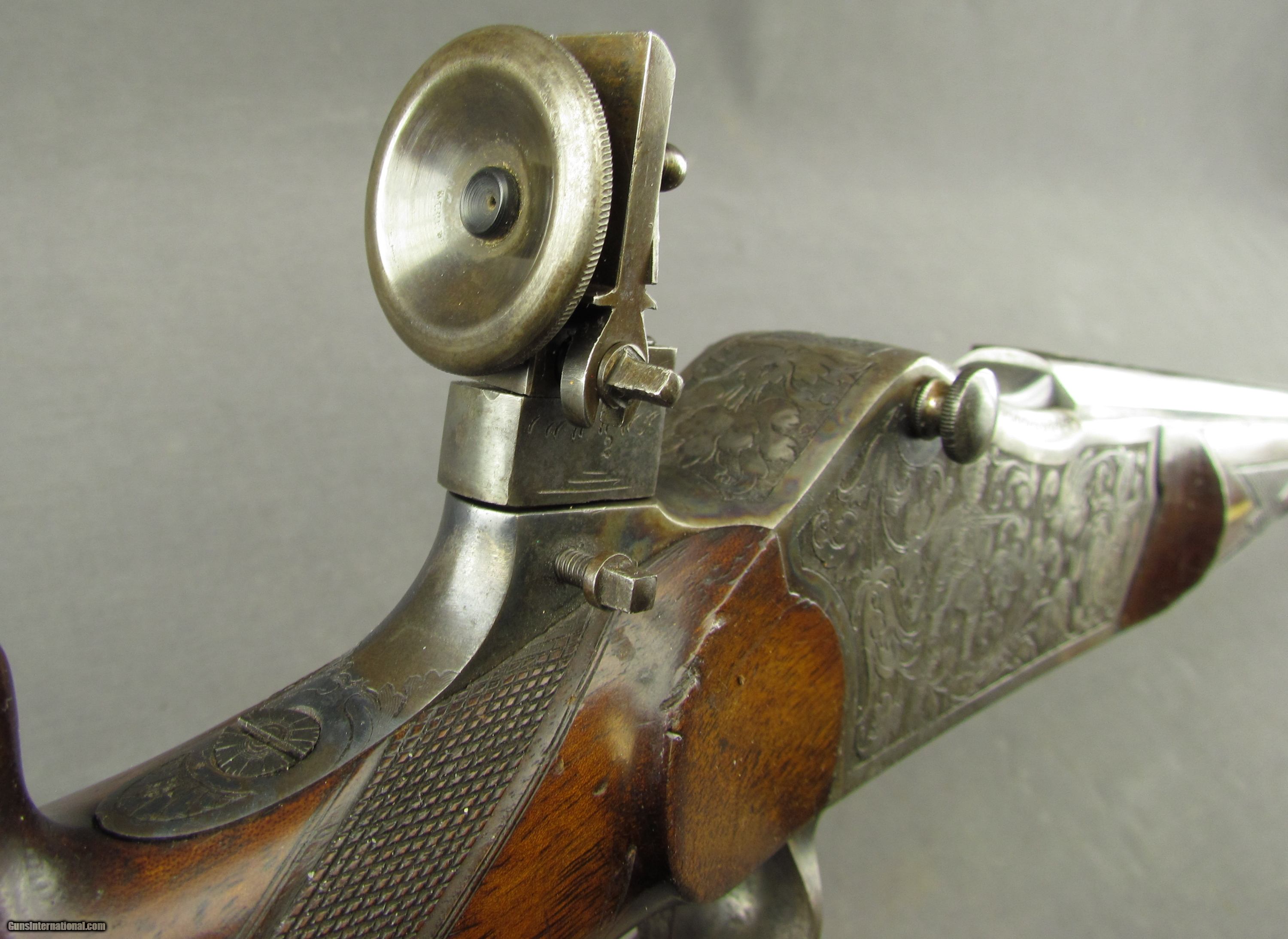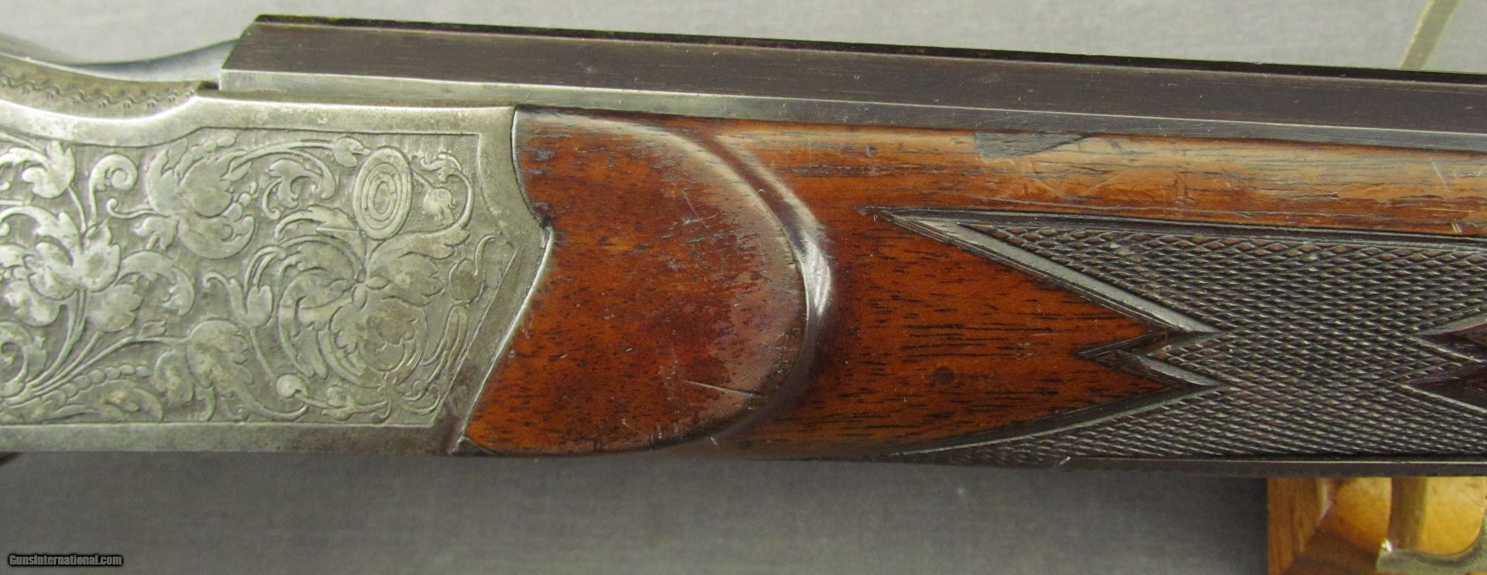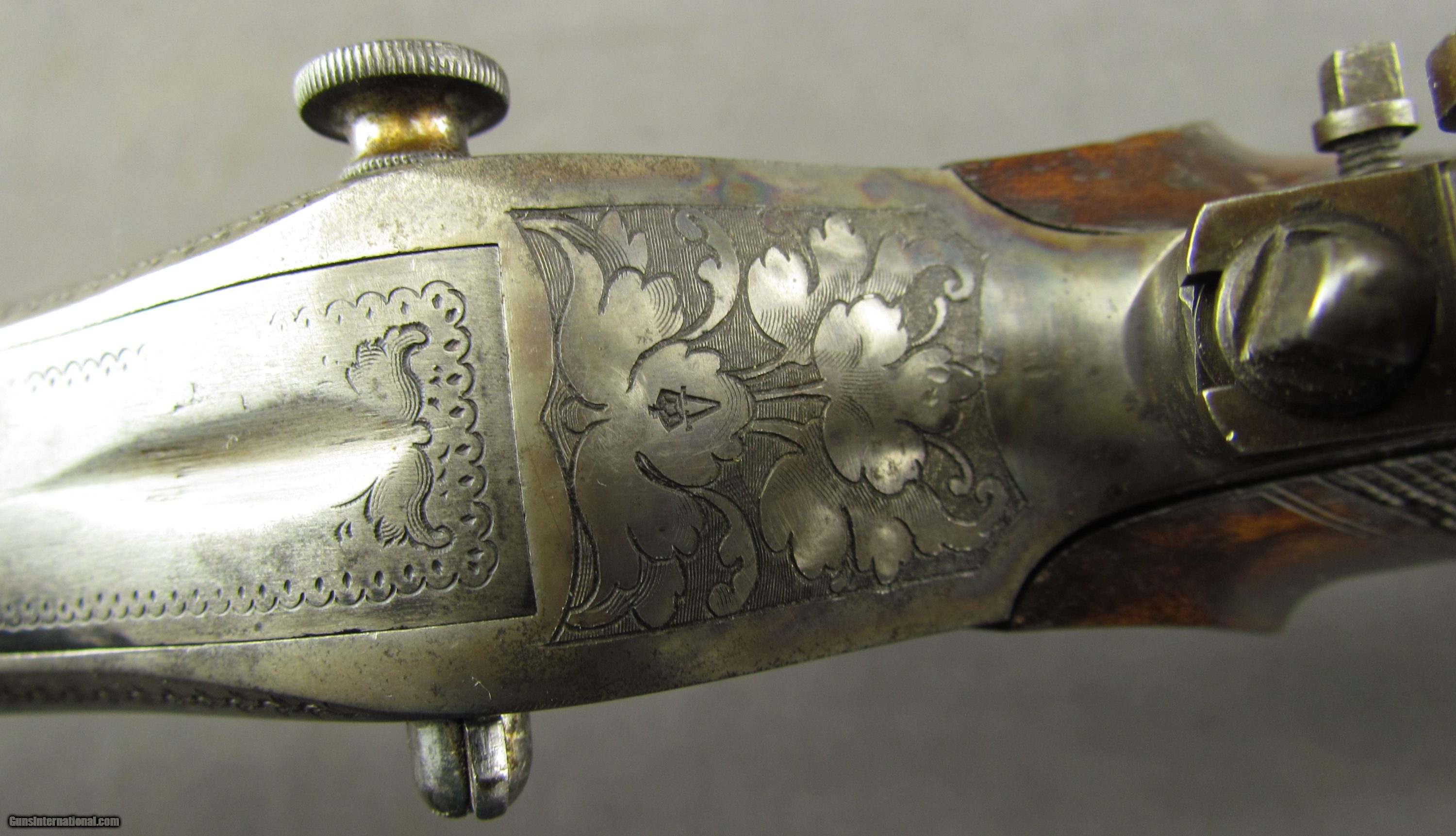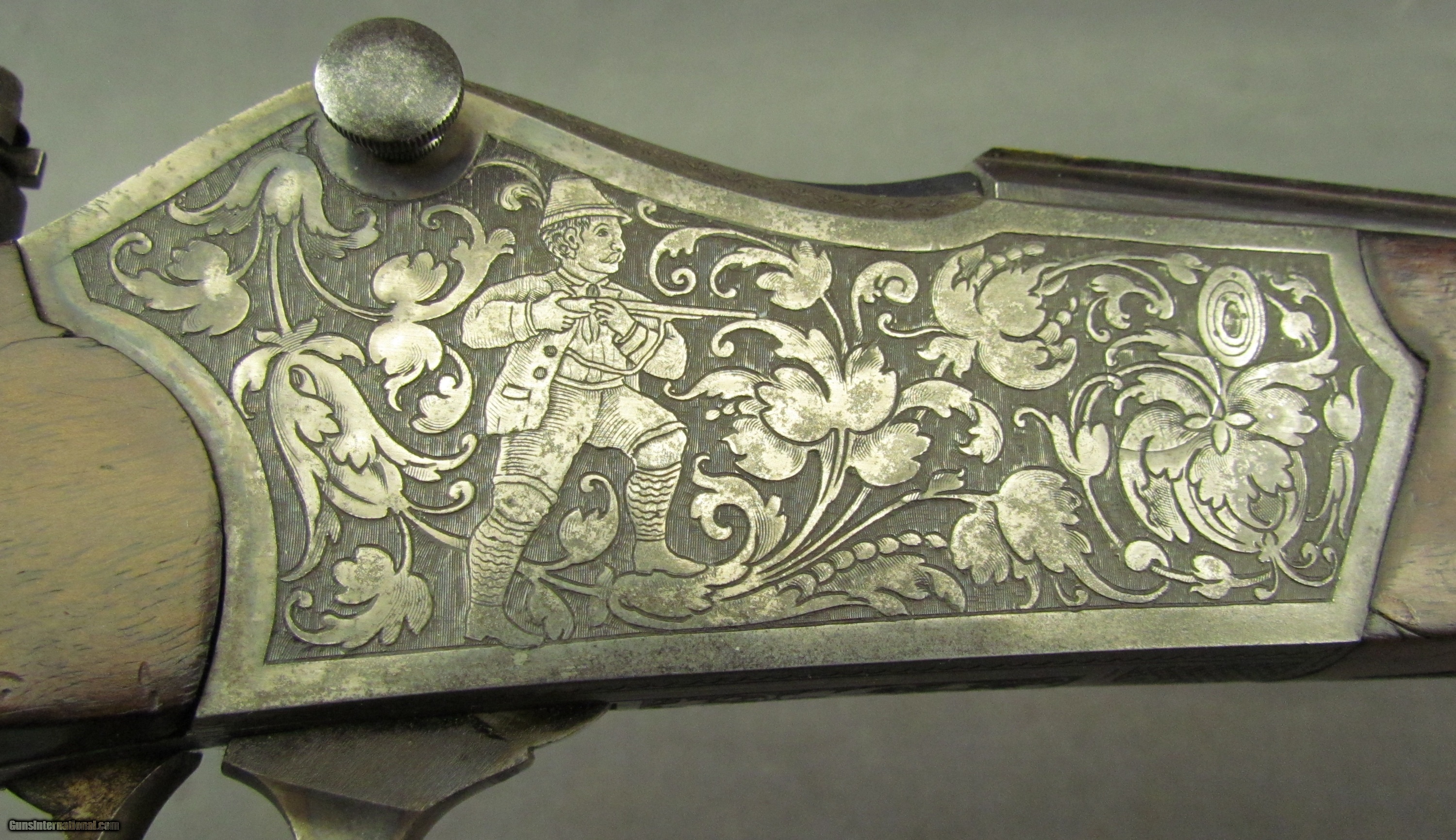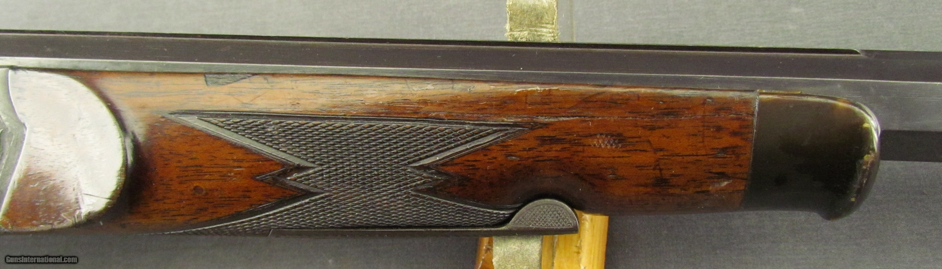 Description: Serial #13378, 8.15 x 46R, 32" octagon barrel with an excellent, bright bore. This is a splendid, Immanuel Meffert-made rifle that retains 80-85% of the original blue finish on the barrel with only mild freckling, some plum-brown fading, and some trace silvering along the high edges. The frame has extensive floral scroll and target shooting vignettes in which both men and women in Tyrolean shooting garb fire at small circular targets. Some original color case-hardening can be seen, however the majority of the metal has turned to a dark, pewter gray patina. The complicated lever has darkened over time, but hints of the original color case-hardening can still be seen, and a very small and unobtrusive import mark is present on the underside of the barrel just ahead of the proof stamps. The forend is lever-fastened, and the buttstock has a deeply contoured cheek-piece, and long, hooked butt. The wood has some light handling marks scattered throughout the old varnish finish. The rifle retains the original rear peep sight, but only the front sight base is installed currently; there is no front sight included. This is a handsome German target rifle, in very good-fine condition, made by one of the great names in German gunmaking, and chambered in the quintessential German target cartridge. It would make a wonderful addition to any collection. FFL or C&R SOLD Curio/Relic: Yes Manufacturer: Meffert Model: Martini Serial Number: 13378 Caliber Info: 8.15mm Gauge Info: 8.15mm |