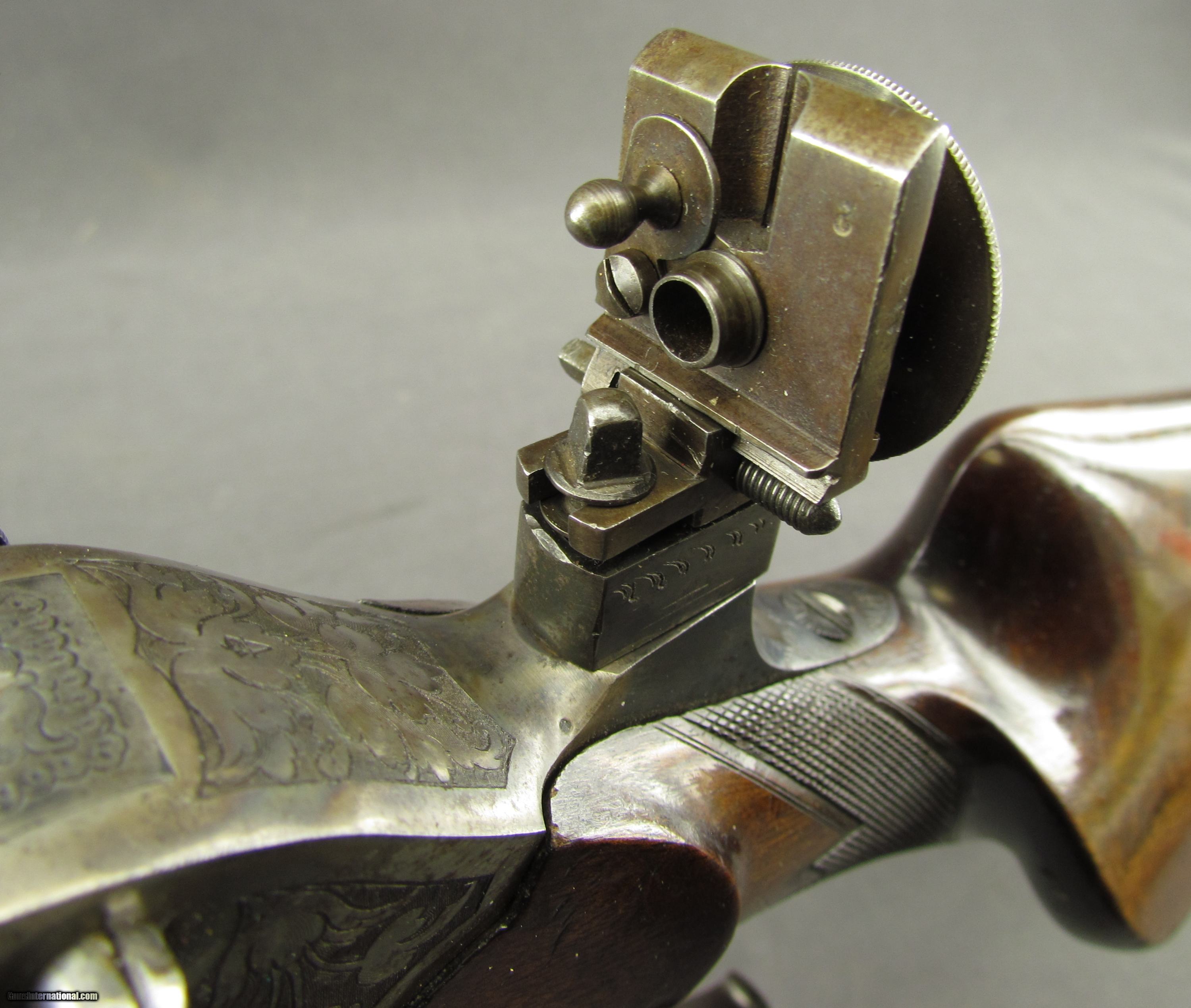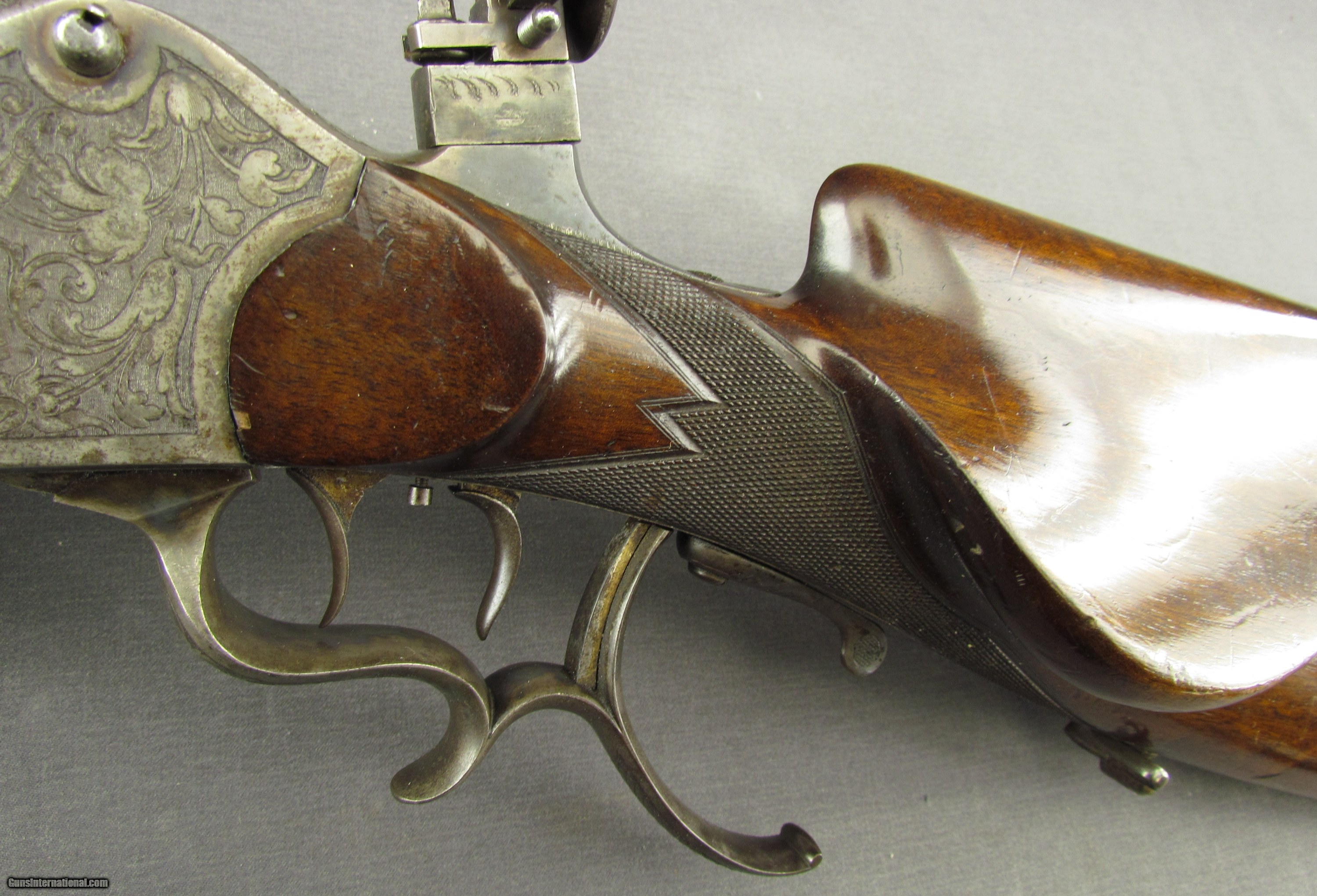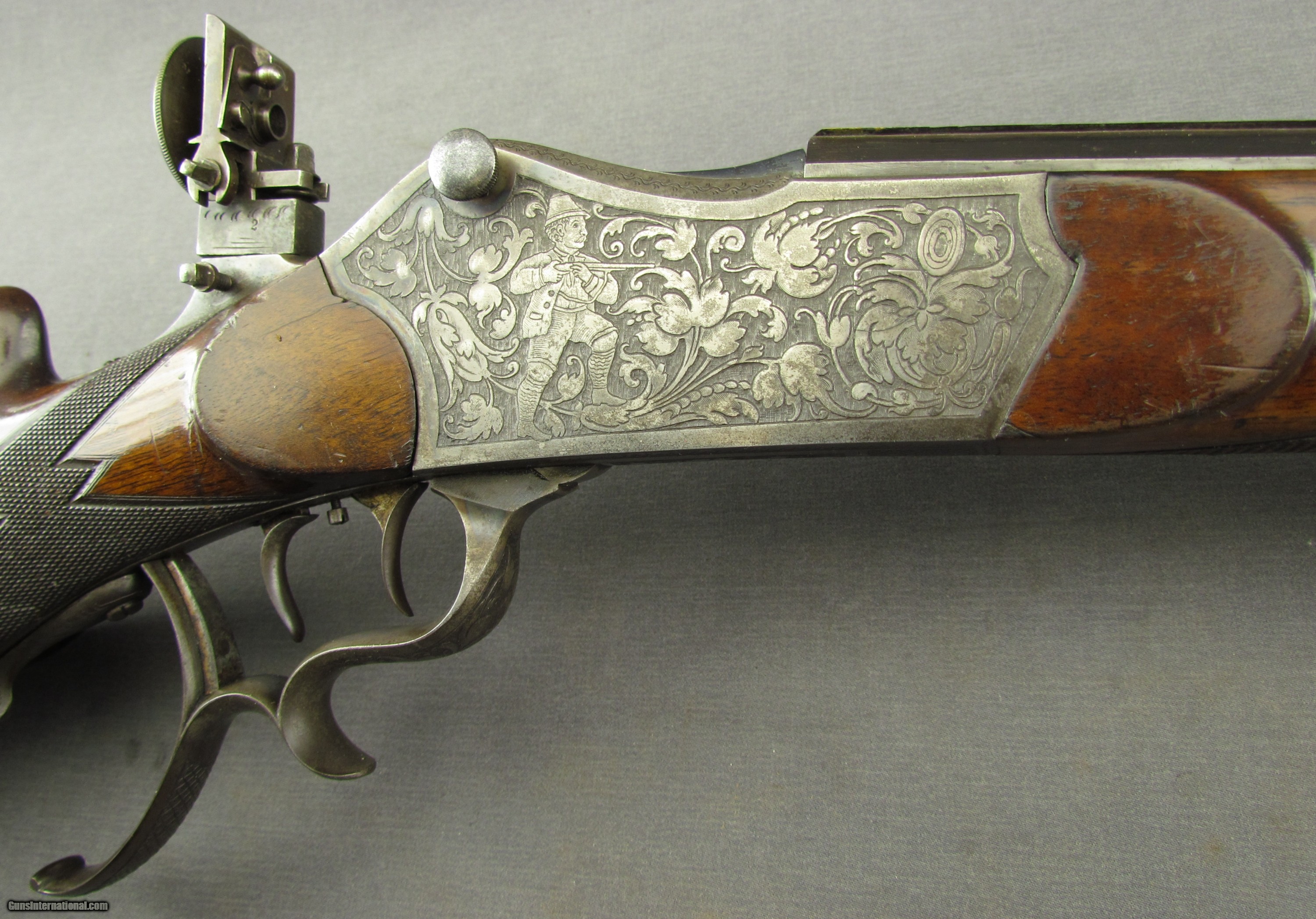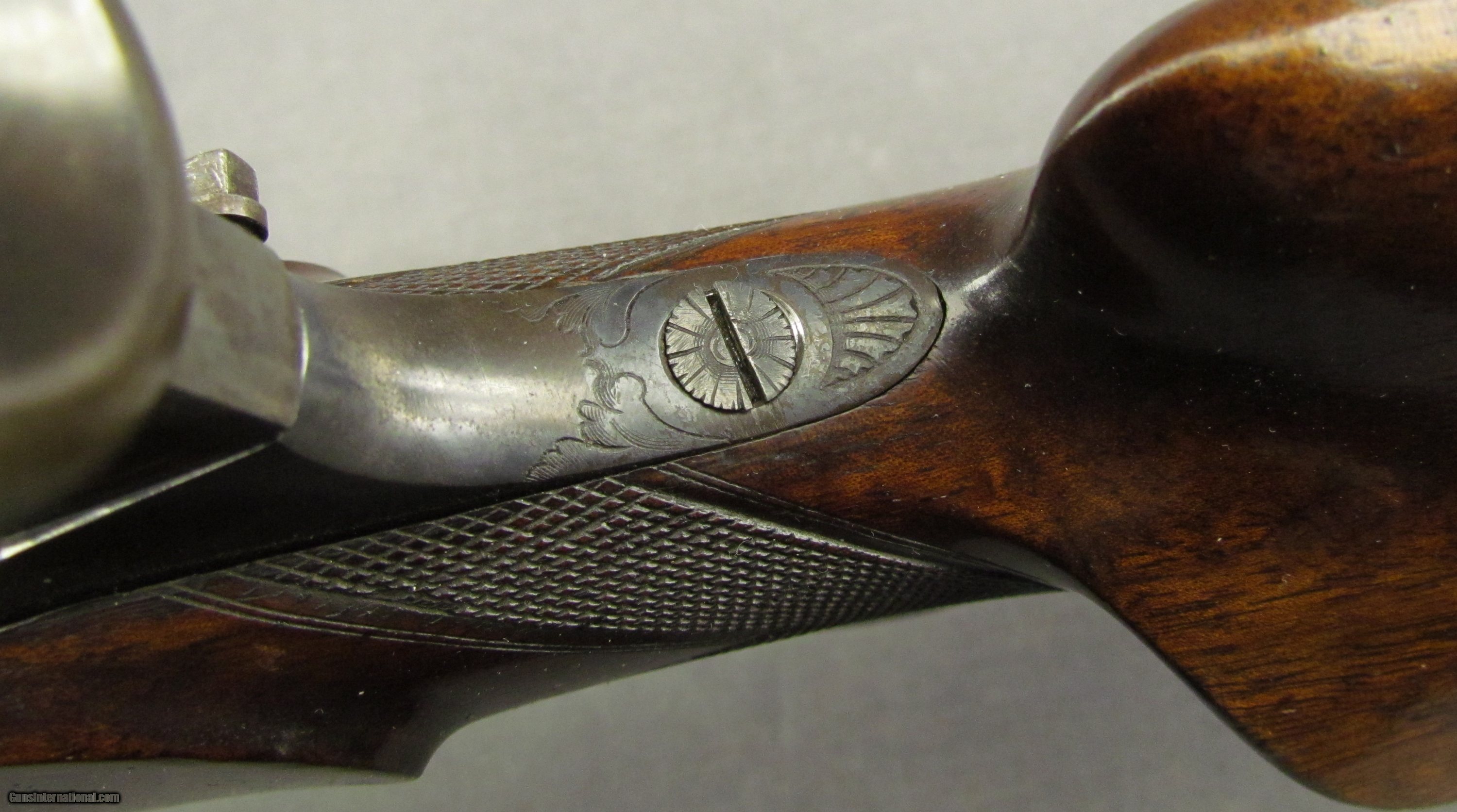 Description: Serial #13378, 8.15 x 46R, 32" octagon barrel with an excellent, bright bore. This is a splendid, Immanuel Meffert-made rifle that retains 80-85% of the original blue finish on the barrel with only mild freckling, some plum-brown fading, and some trace silvering along the high edges. The frame has extensive floral scroll and target shooting vignettes in which both men and women in Tyrolean shooting garb fire at small circular targets. Some original color case-hardening can be seen, however the majority of the metal has turned to a dark, pewter gray patina. The complicated lever has darkened over time, but hints of the original color case-hardening can still be seen, and a very small and unobtrusive import mark is present on the underside of the barrel just ahead of the proof stamps. The forend is lever-fastened, and the buttstock has a deeply contoured cheek-piece, and long, hooked butt. The wood has some light handling marks scattered throughout the old varnish finish. The rifle retains the original rear peep sight, but only the front sight base is installed currently; there is no front sight included. This is a handsome German target rifle, in very good-fine condition, made by one of the great names in German gunmaking, and chambered in the quintessential German target cartridge. It would make a wonderful addition to any collection. FFL or C&R SOLD Curio/Relic: Yes Manufacturer: Meffert Model: Martini Serial Number: 13378 Caliber Info: 8.15mm Gauge Info: 8.15mm |