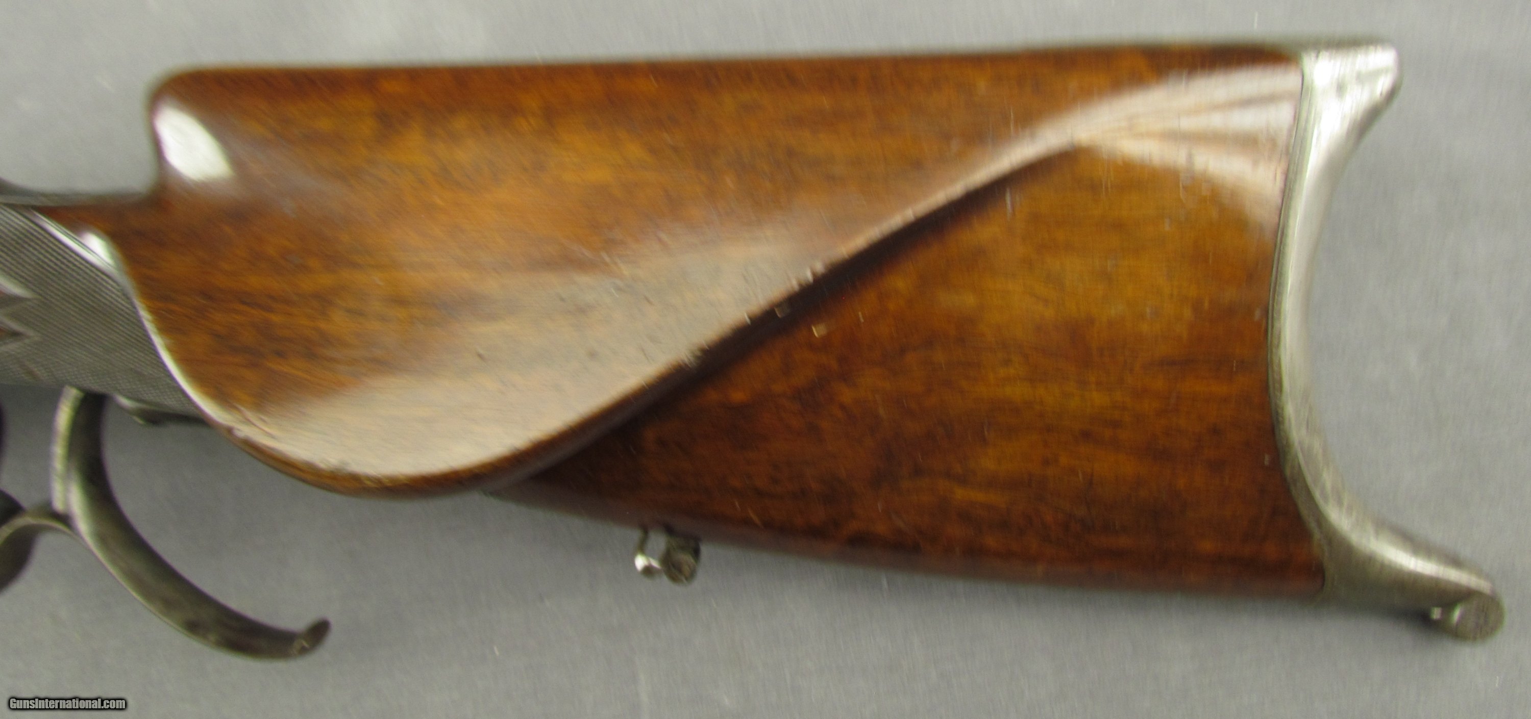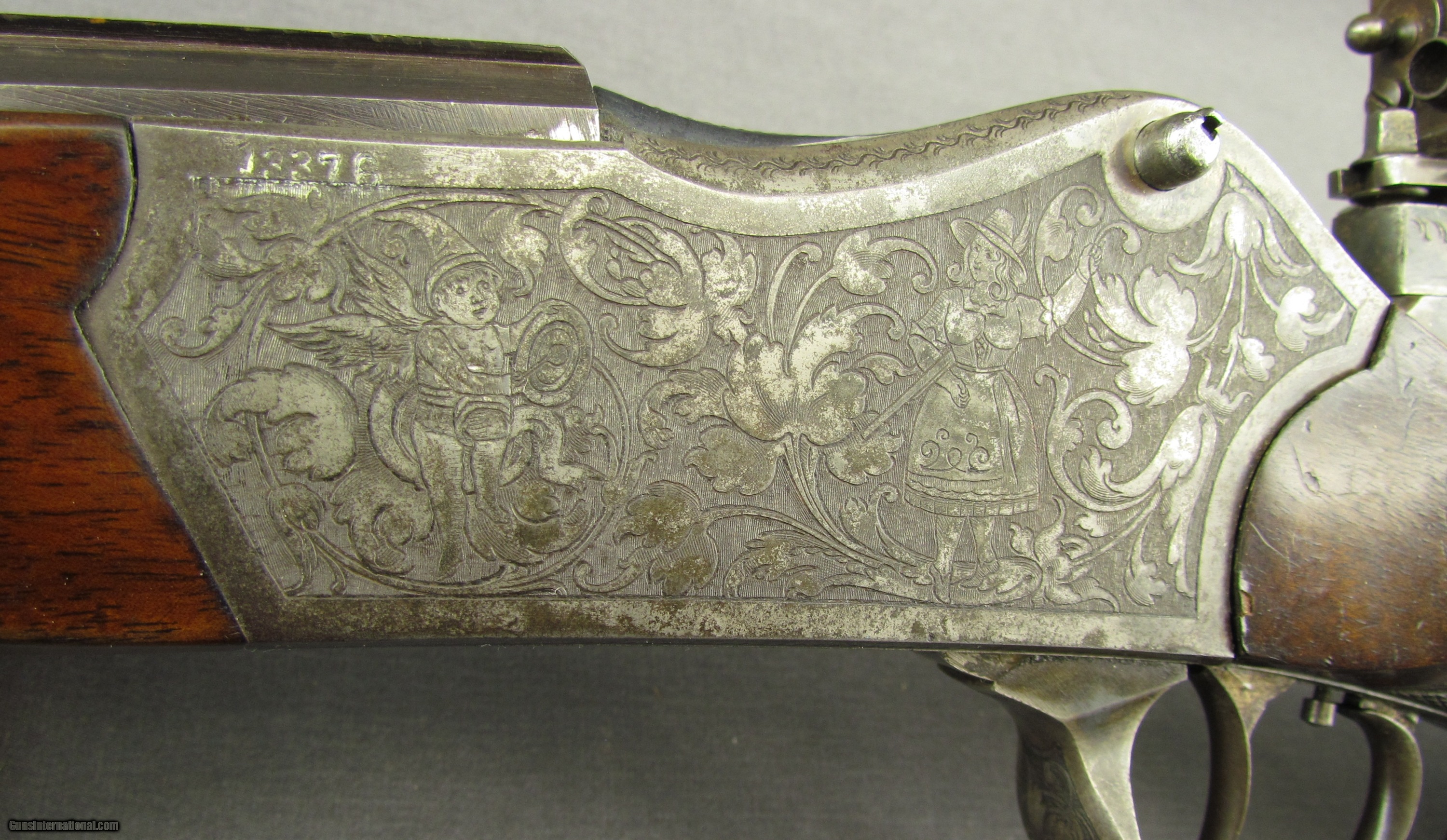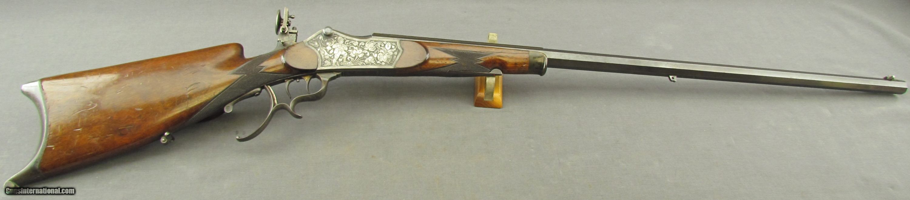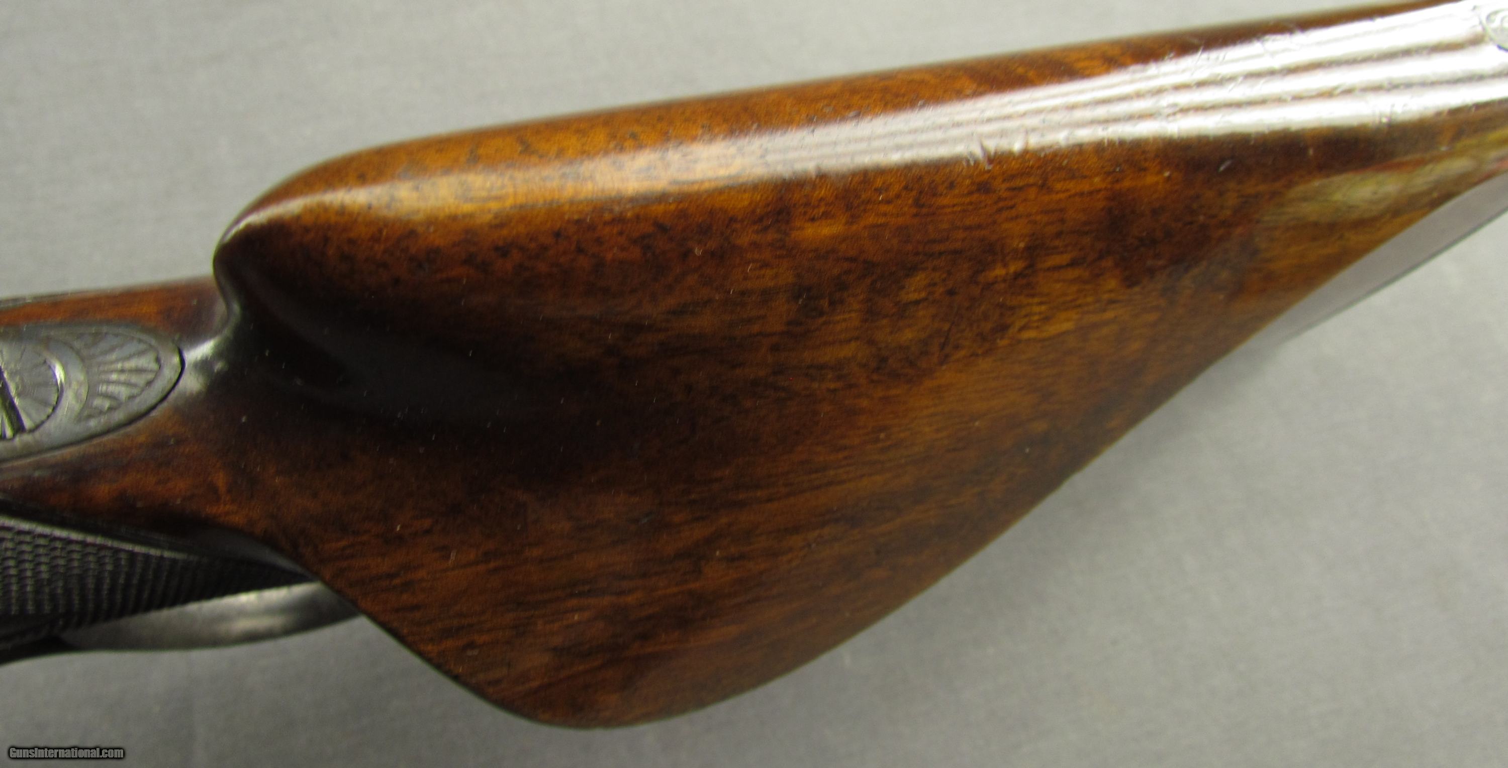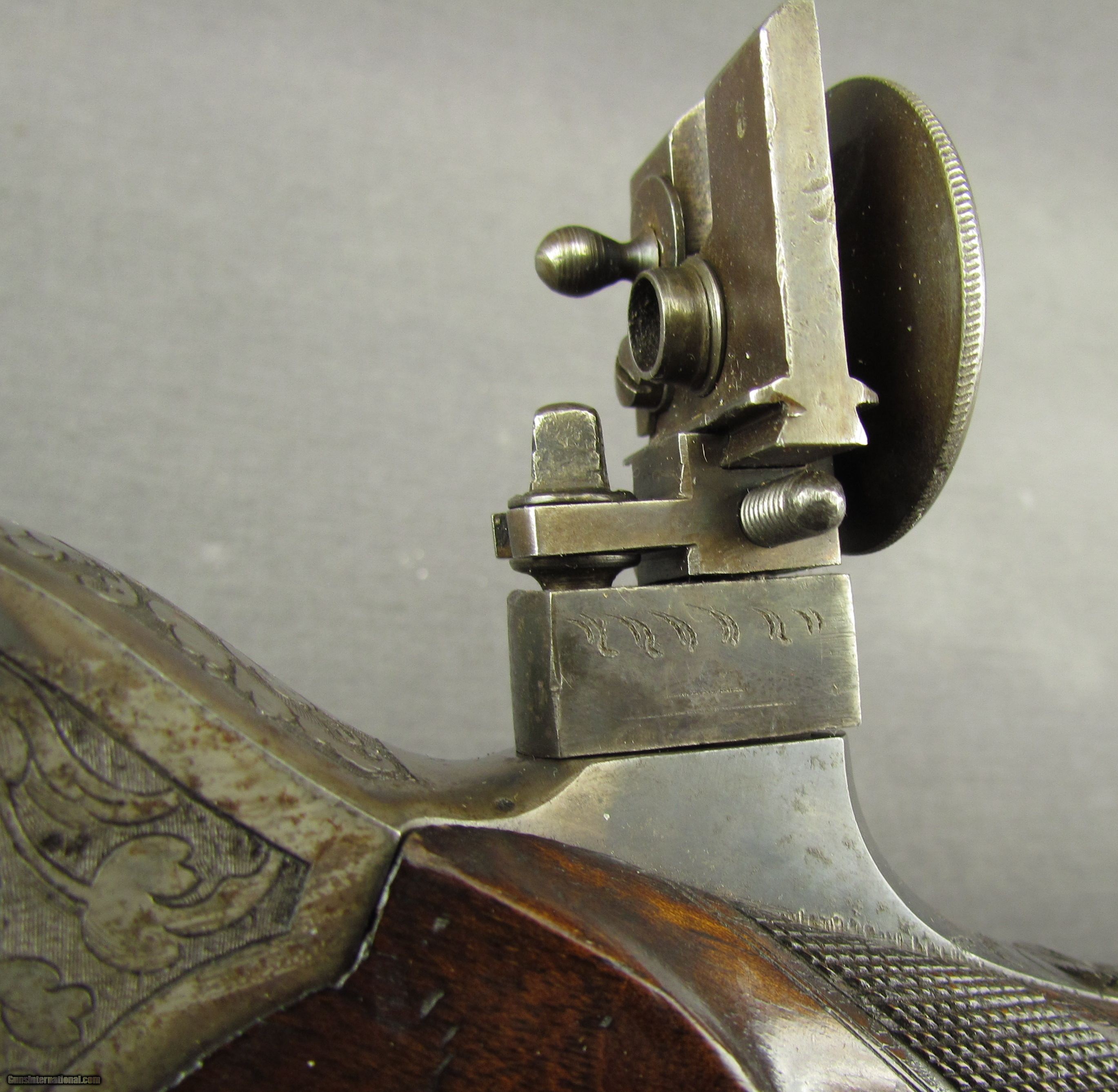 Description: Serial #13378, 8.15 x 46R, 32" octagon barrel with an excellent, bright bore. This is a splendid, Immanuel Meffert-made rifle that retains 80-85% of the original blue finish on the barrel with only mild freckling, some plum-brown fading, and some trace silvering along the high edges. The frame has extensive floral scroll and target shooting vignettes in which both men and women in Tyrolean shooting garb fire at small circular targets. Some original color case-hardening can be seen, however the majority of the metal has turned to a dark, pewter gray patina. The complicated lever has darkened over time, but hints of the original color case-hardening can still be seen, and a very small and unobtrusive import mark is present on the underside of the barrel just ahead of the proof stamps. The forend is lever-fastened, and the buttstock has a deeply contoured cheek-piece, and long, hooked butt. The wood has some light handling marks scattered throughout the old varnish finish. The rifle retains the original rear peep sight, but only the front sight base is installed currently; there is no front sight included. This is a handsome German target rifle, in very good-fine condition, made by one of the great names in German gunmaking, and chambered in the quintessential German target cartridge. It would make a wonderful addition to any collection. FFL or C&R SOLD Curio/Relic: Yes Manufacturer: Meffert Model: Martini Serial Number: 13378 Caliber Info: 8.15mm Gauge Info: 8.15mm |