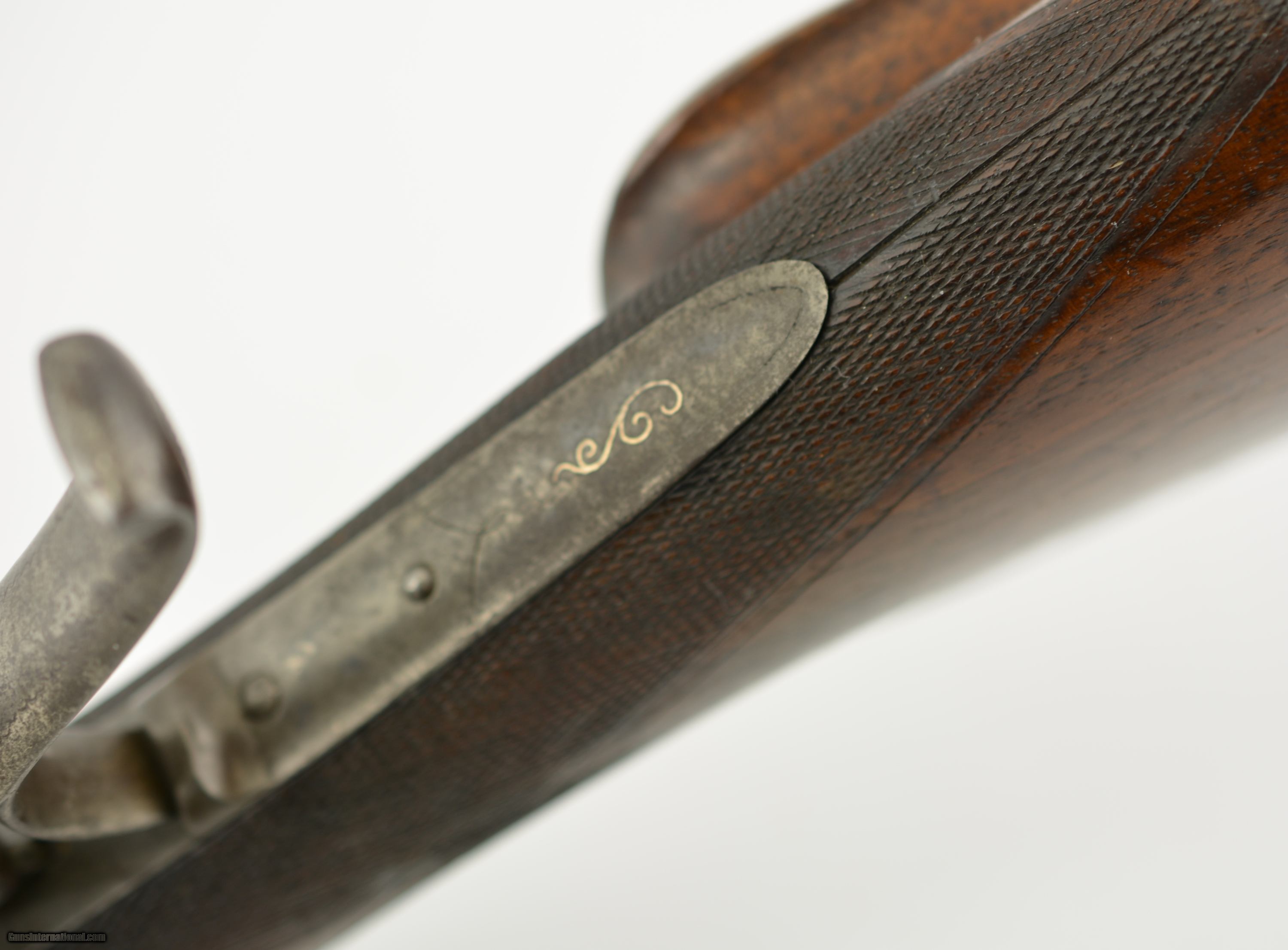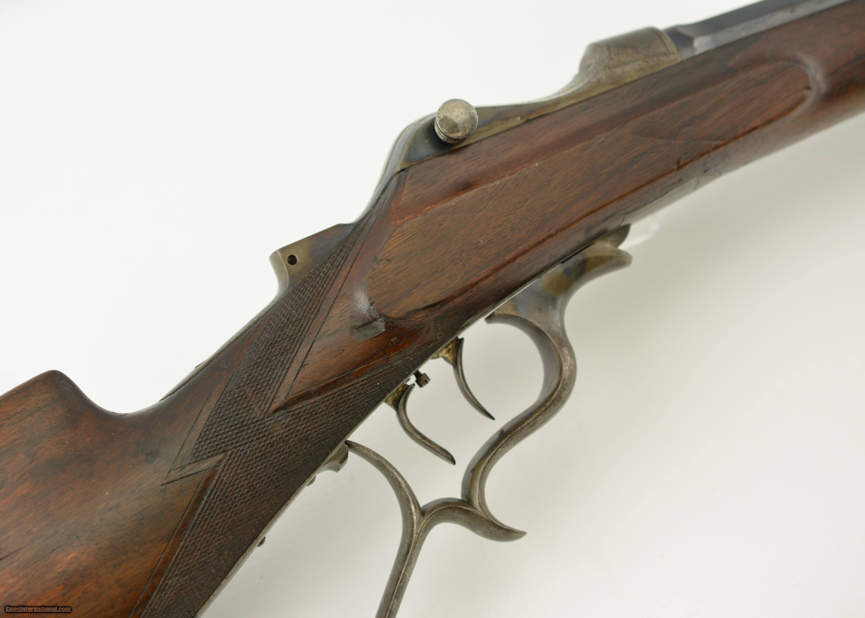 Description: Serial #520, 8.15 x 46R, 30" octagon barrel with an excellent, bright bore. This unmarked rifle has a 1910 proof date, and uses a Kessler type Martini action with typical one-piece walnut stock. The barrel retains about 75-80% of the original blue finish with spots of mild brown freckling along its length, as well as some thin silvering along the edges of the facets. The original front sight are no longer present, instead a pair of Weaver rings and mounts have been added to the rear sight rail on the barrel breech, and a small, unobtrusive import stamp is present on the underside of the barrel, just ahead of the forend tip. The frame and lever retain traces of the original color case-hardening with spots of plum-brown freckling throughout, and a mellow, dark gray patina on the balance. The walnut stock is wedge-fastened (although the included wedge is a bit too short, and is probably a later replacement), and has numerous small handling marks and minor blemishes scattered about the old oil finish. There is a repaired chip on the right side of the forend, and deeper bruises and marks on the wrist, sides of the receiver area, and on the buttstock. The stock itself has an angular, shadow-line cheek-piece, and typical hooked buttplate. Neither the rear barrel sight, nor the tang sight are still present, but the action is crisp and fully functional. This is a very well-made rife, in an unusual one-piece stock configuration, and rates very good condition overall. FFL or C&R SOLD Curio/Relic: Yes Manufacturer: Kessler Model: Schuetzen Serial Number: 520 Caliber Info: 8.15 Gauge Info: 8.15 |