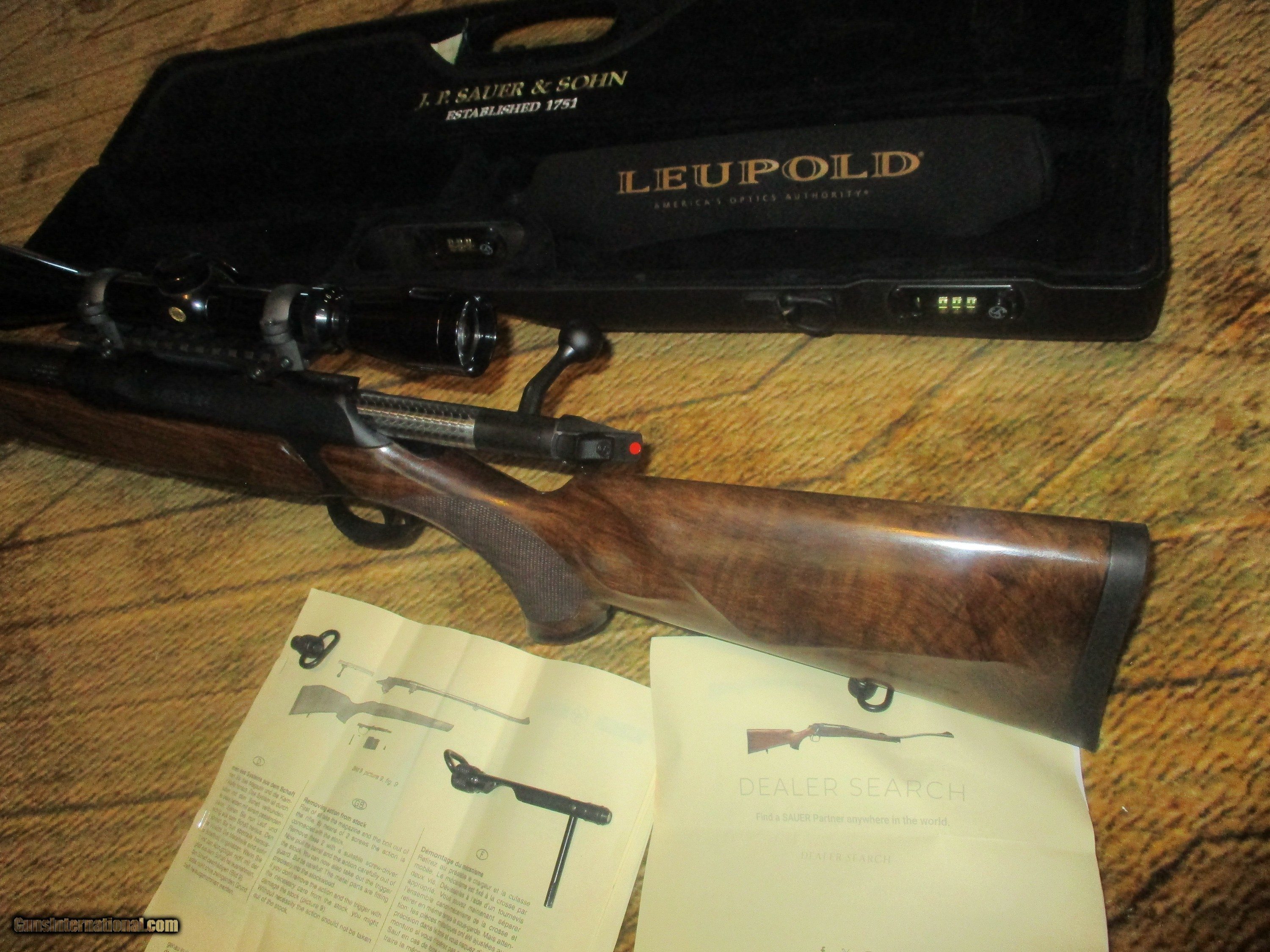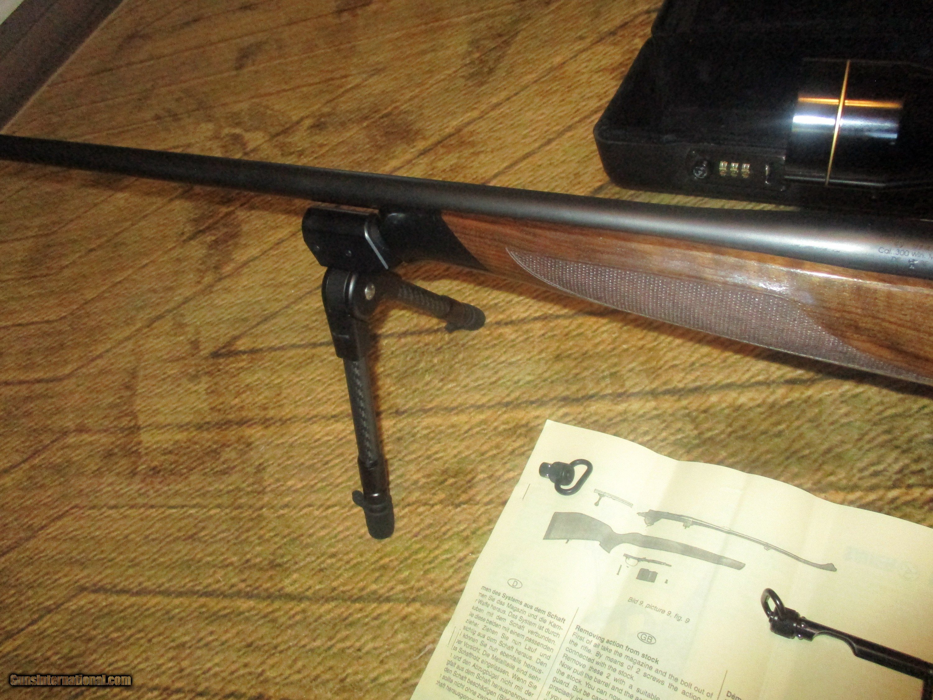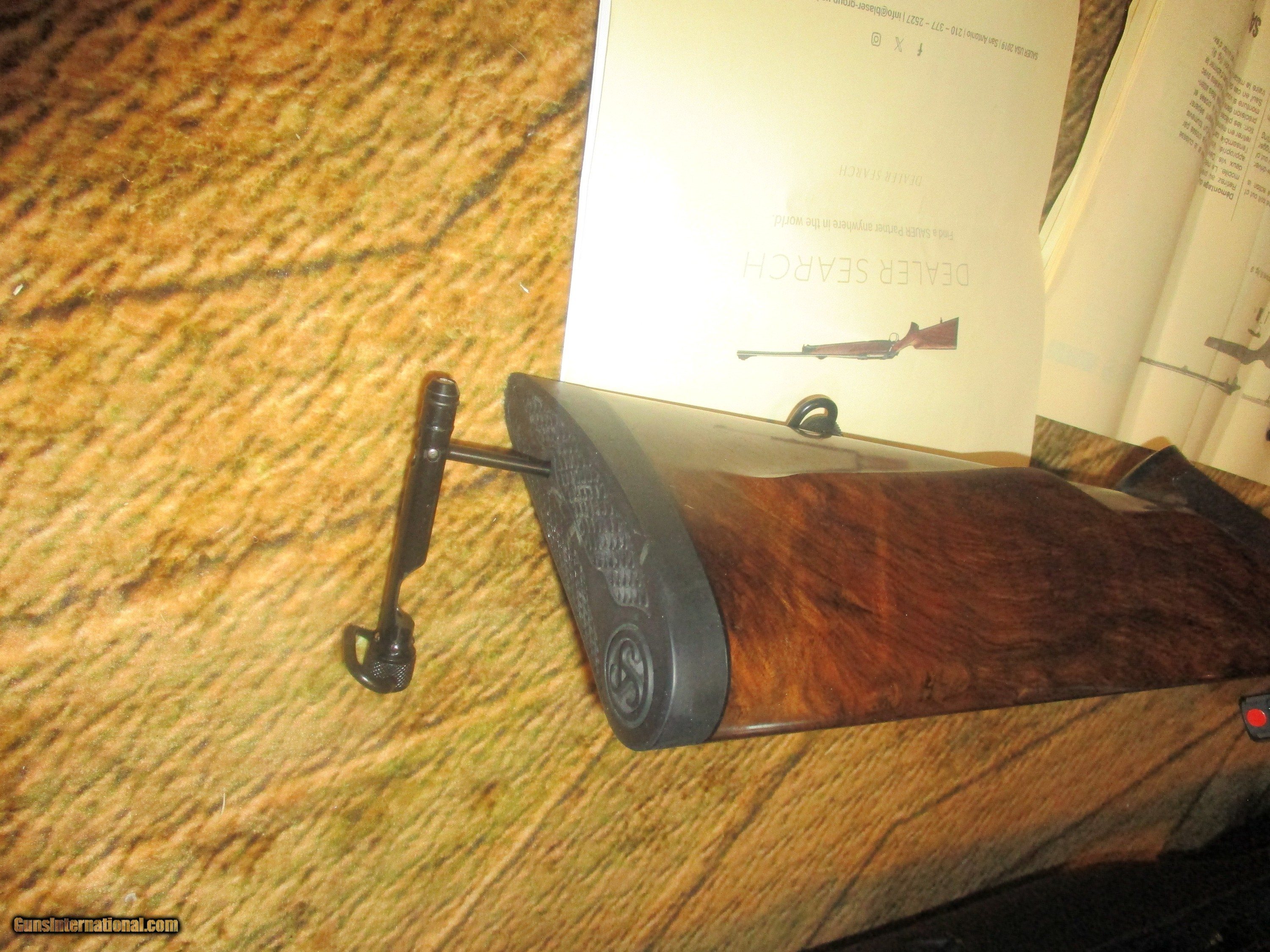 Description: 20" bbl. with threaded end for accessories ( flash supressor/ muzzlebrake etc.), no sights bbl., Sauer mounts w/ 1" steel rings, new Leupold 3X x 9X x 40mm WA scope, front single set trigger, smoothest jewelled bolt action imaginable, cocking slide on bolt, twin ejectors, 6 lug bolt lock, Quattro pull trigger with 1.2lbs., 1.7lbs., 2.2lbs., & 2,7lbs.,m 21 line checkering, 4X Grade detatchable stock & forearm , ebony schnoble forend, Sauer assembly & disassembly hexnut key intregrated into front sling swivel forend & buttstock removal, bbl. removal or replacement, & trigger pull selection, detatchable Sauer bipod, all this packed in small elegant motor case with all accessories enclosed within, this takedown carbine is timelessy beautiful, serene & masterfully artistic, 98%-99% as new mith minor handling only looks as new, multitudes of info., pictured assembly instructions, lotsa provanance!! special order only several selected dealers in Texas or Sauer directly from Germany, lis $10,000 special order only by customer, will sell with NEW Leupold scope included for: Price: $5,995.00 Contact Seller |