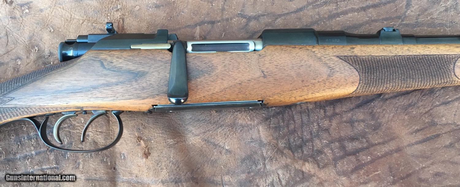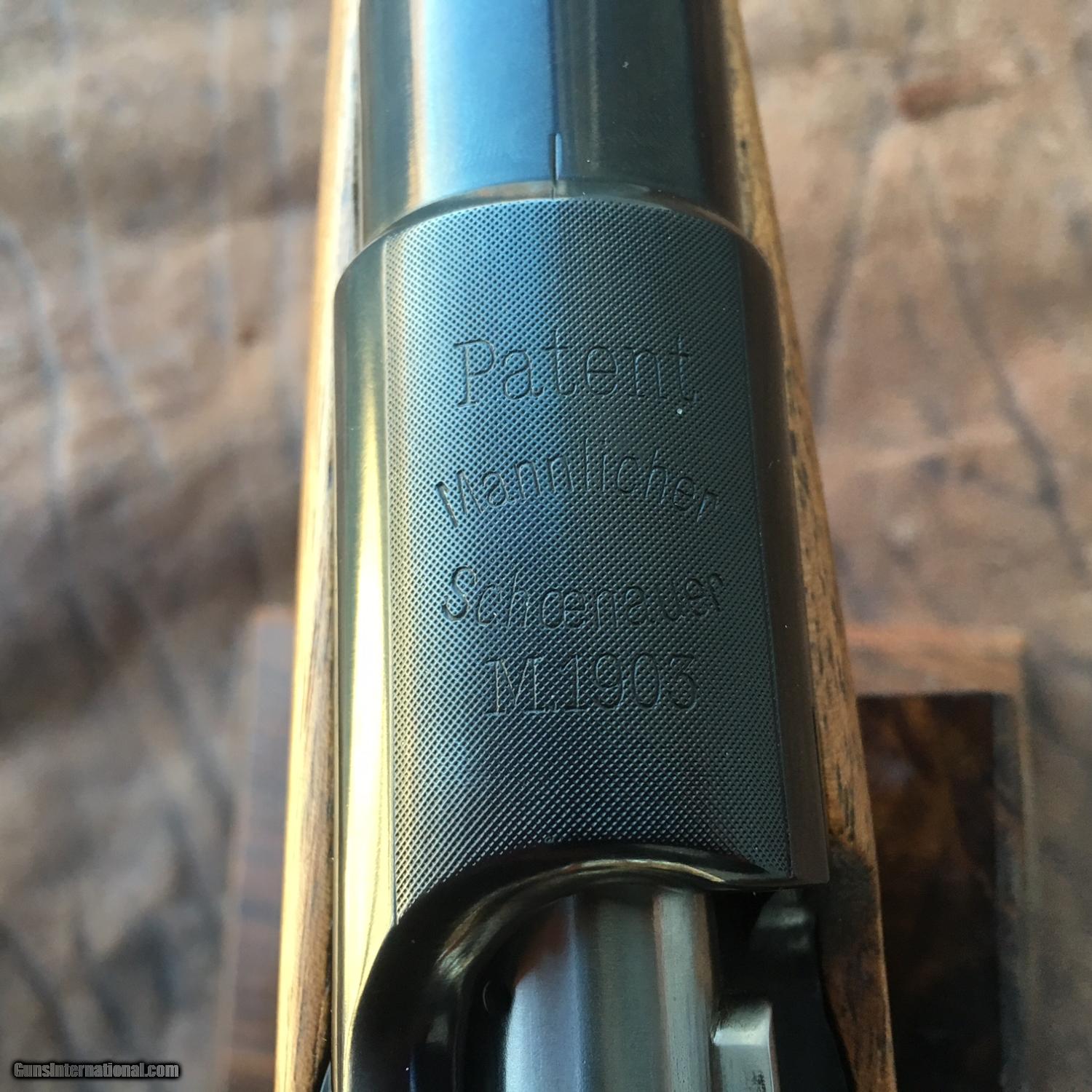 Description: !!! Sale pending !!! #11589 , Mannlicher Schoenauer M 1903 , 6.5x54 M 18” barrel with bore and rifling in great condition. Barrel , action and bolt have been reblued and are in 99% condition, trigger guard appear reblued but in a more satin finish. Floor plate appears original in 80% condition. Lyman hinged peep sight , double set triggers, butterknife bolt handle. The stock is in great shape inside and out, finish is 90% condition, checkering 90% condition . LOP is 13 ¾” over the steel plate with cartridge trap . Unmolested 1903’s are getting scarce. SOLD Manufacturer: Mannlicher Schoenauer Model: M 1903 Serial Number: 11589 Caliber Info: 6.5x54 M |