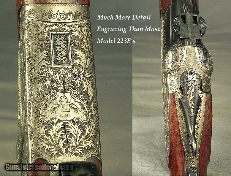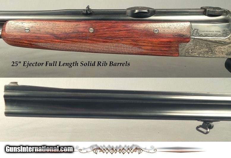 Description: #90761, Gebruder Merkel - Suhl: A 1977 Merkel O/U 9.3 x 74R Hand Detachable Sidelock Ejector Model 223E on their Kersten Double Crossbolt Action Body, It is with 25" Ejector barrels with a full length solid rib, 1 standing rear sight, Nitro Proofed in Suhl, Original claw mount bases, A Kahles 1.1-4.5 x 20 Helia S scope with a duplex crosshair with heavy bars except at 12 o'clock, Kersten crossbolt double top lock, Bolstered frame, Hand detachable locks, Double triggers with the front trigger a set trigger, Cocking indicators, 3 piece forend, Pistol grip stock at 14 3/16" over a 1/2" pad, It will go 14 3/4" with a 1" pad installed, Steel trigger guard with very nice engraving, Sling eyes, European style cheekpiece, 7 lbs. 15 oz. without the scope & 9 lbs. 1 oz. with it mounted, 98% engraving coverage of well-cut game scene with Stag and Alpine Chamois on the lockplates, Then all the balance is very well cut with thistle leaves that is very attractive and quite unusual, It has locking screws on 3 key screws, The locks are jeweled on the inside, The original barrel blue at 97%, The original frame finish at 99%, The original wood finish at 96% with very slight handling marks, The checkering is sharp & crisp and remains at 99%, The bores are excellent plus and they look like they did in March of 1977. This piece is not one of the modern Merkel's and is a Suhl made gun. Compare this Suhl made Merkel to a current gun for the same price and this Gebruder Merkel from 1977 looks like a pretty strong value to me. Most current guns depth is a backyard wading pool; this Merkel's depth is the ocean. The difference in liking a gun or loving a gun is in the details. SOLD Rifle Caliber: 9.3x74mmR |