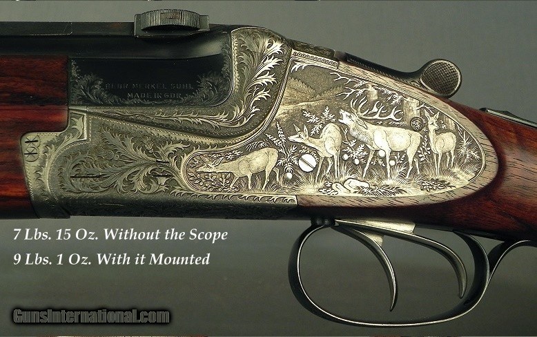 MERKEL 9.3 x 74R SIDELOCK SUHL MADE in 1977- EXC GAME SCENE ENGRAVING- FACTORY CLAW MOUNTS w/ KAHLES 1.1 x 4.5- MODEL 223E- OVERALL 96%- 98% ENGRAVED