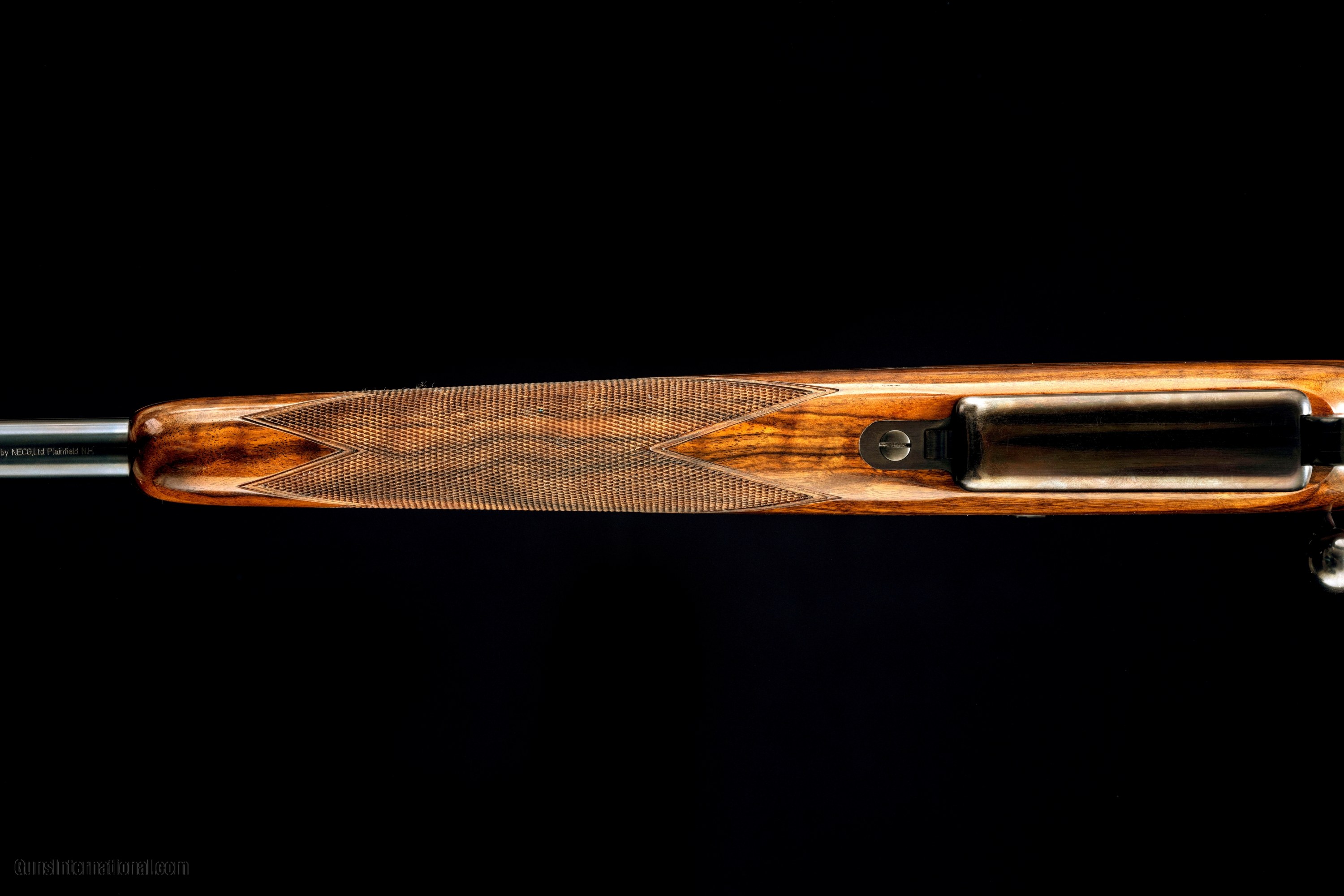 Description: The Reimer Johannsen Safari rifle in a .416 rigby features a 22" barrel with a island style front sight with a flip up white bead and island style rear sight with express leafs. Also comes with a Ziess Diavari 1.25-4x24 and custom quick detachable scope rings and bases. Includes a coffin style hinged floor plate, a grip cap, and has cheek piece with a shadow line. The barrel has barrel banded front sling swivel stud and an enletted rear swing swivel stud. The wood has a very straight grain in order to handle to recoil of the .416 rigby. SOLD Manufacturer: Reimer Johannsen Caliber Info: 416 Rigby Action: Bolt-Action Gauge Info: 416 Rigby Weight: 10.11 |