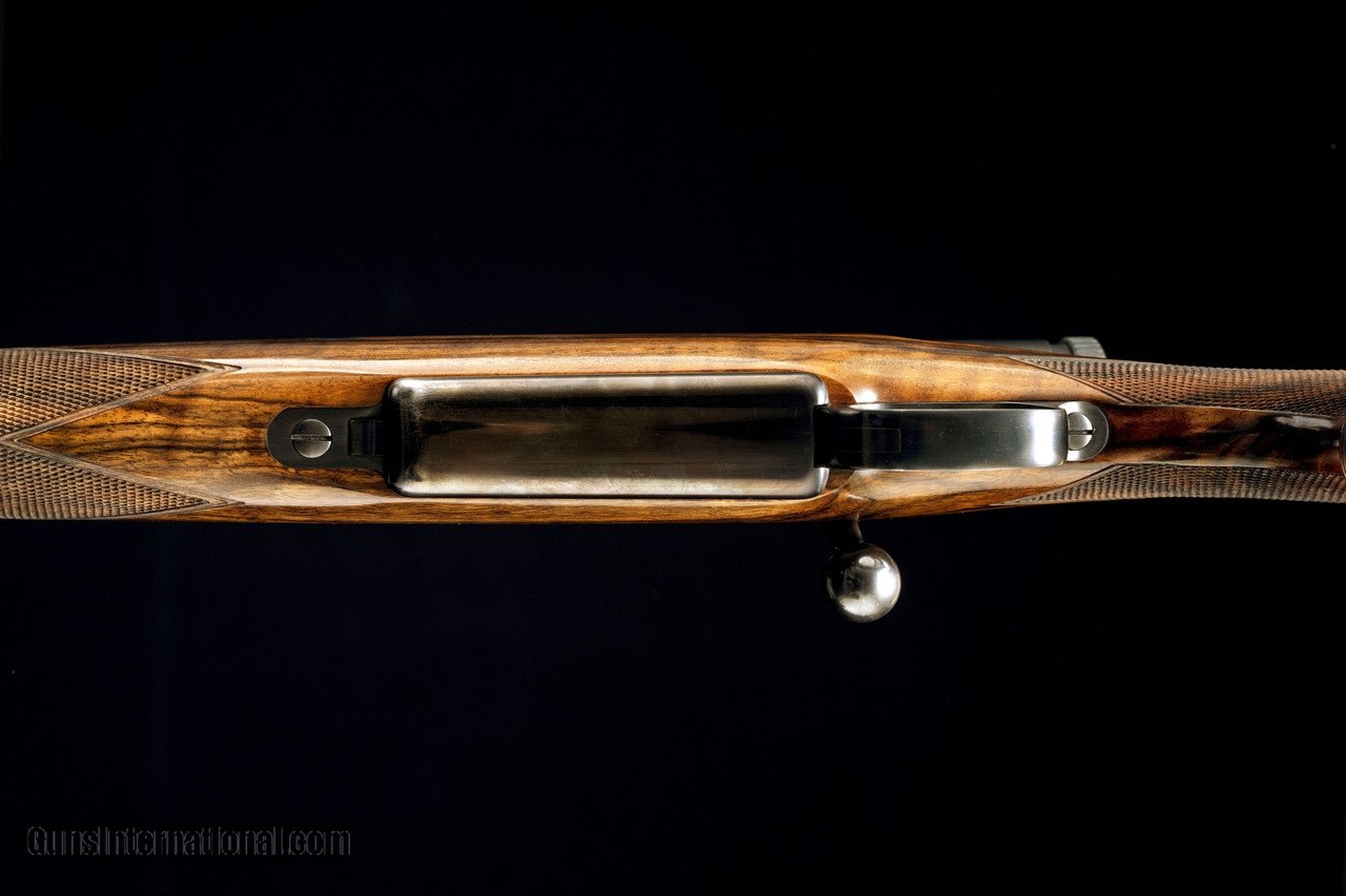 Description: The Reimer Johannsen Safari rifle in a .416 rigby features a 22" barrel with a island style front sight with a flip up white bead and island style rear sight with express leafs. Also comes with a Ziess Diavari 1.25-4x24 and custom quick detachable scope rings and bases. Includes a coffin style hinged floor plate, a grip cap, and has cheek piece with a shadow line. The barrel has barrel banded front sling swivel stud and an enletted rear swing swivel stud. The wood has a very straight grain in order to handle to recoil of the .416 rigby. SOLD Manufacturer: Reimer Johannsen Caliber Info: 416 Rigby Action: Bolt-Action Gauge Info: 416 Rigby Weight: 10.11 |