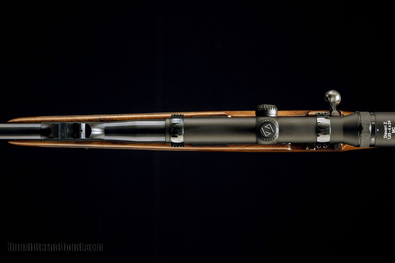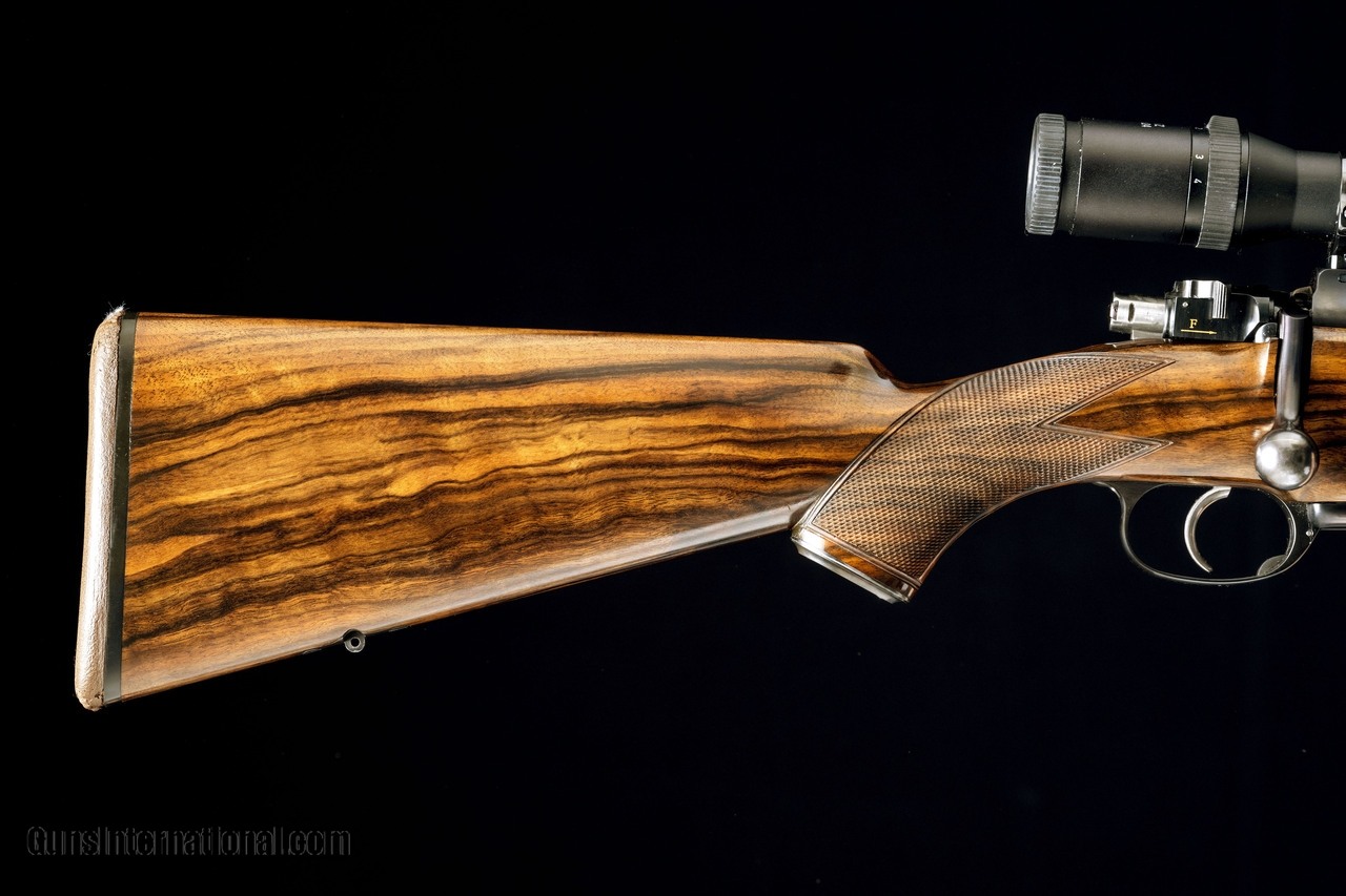 Description: The Reimer Johannsen Safari rifle in a .416 rigby features a 22" barrel with a island style front sight with a flip up white bead and island style rear sight with express leafs. Also comes with a Ziess Diavari 1.25-4x24 and custom quick detachable scope rings and bases. Includes a coffin style hinged floor plate, a grip cap, and has cheek piece with a shadow line. The barrel has barrel banded front sling swivel stud and an enletted rear swing swivel stud. The wood has a very straight grain in order to handle to recoil of the .416 rigby. SOLD Manufacturer: Reimer Johannsen Caliber Info: 416 Rigby Action: Bolt-Action Gauge Info: 416 Rigby Weight: 10.11 |