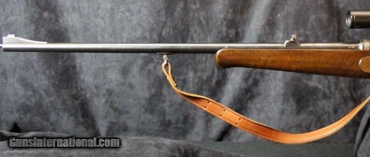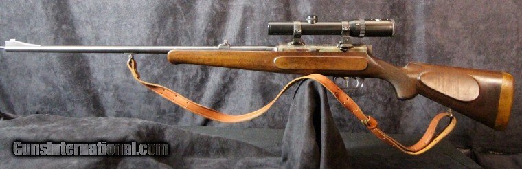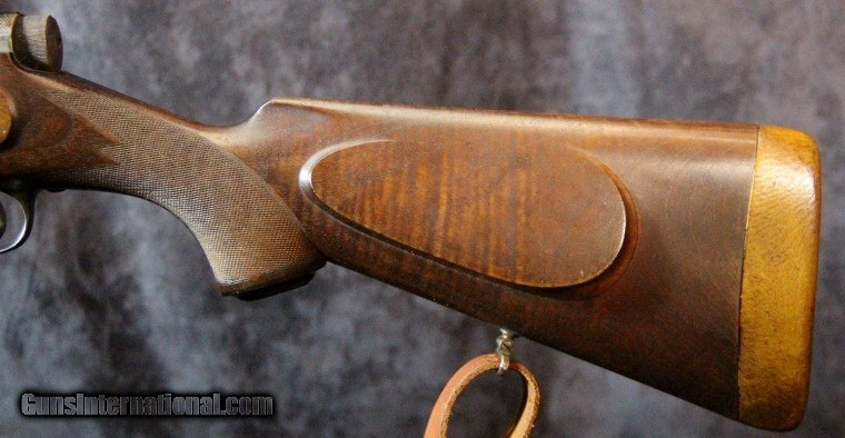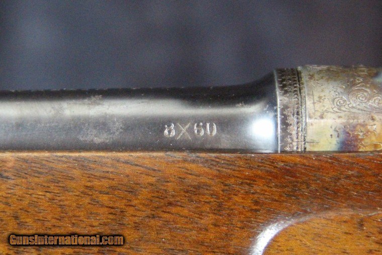 Description: 8X60mm, #33434, 23 inch barrel, blue and case color finish, checkered pistol grip stock with leather butt pad, double set triggers, engraved receiver, original barrel sights, Schmidt & Bender 1.25-4X20 scope, pre war. Condition: excellent bore, 97% blue, 99% case color on receiver, excellent wood, butt pad excellent, excellent mechanically, excellent marks. SOLD Curio/Relic: Yes |