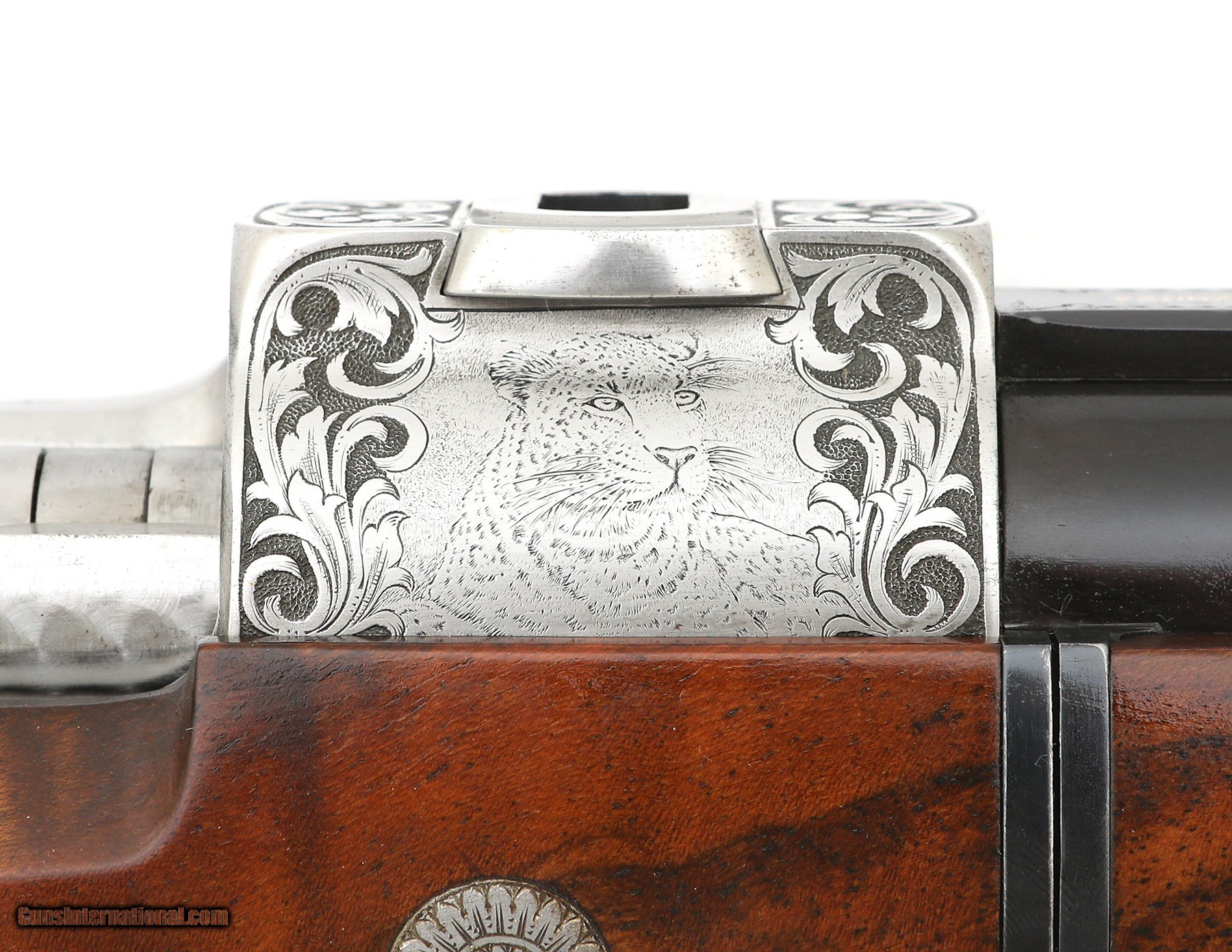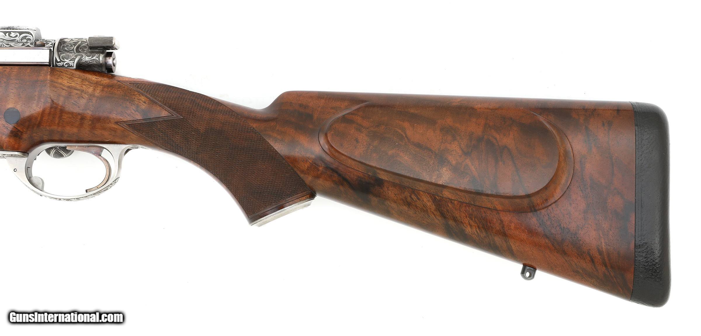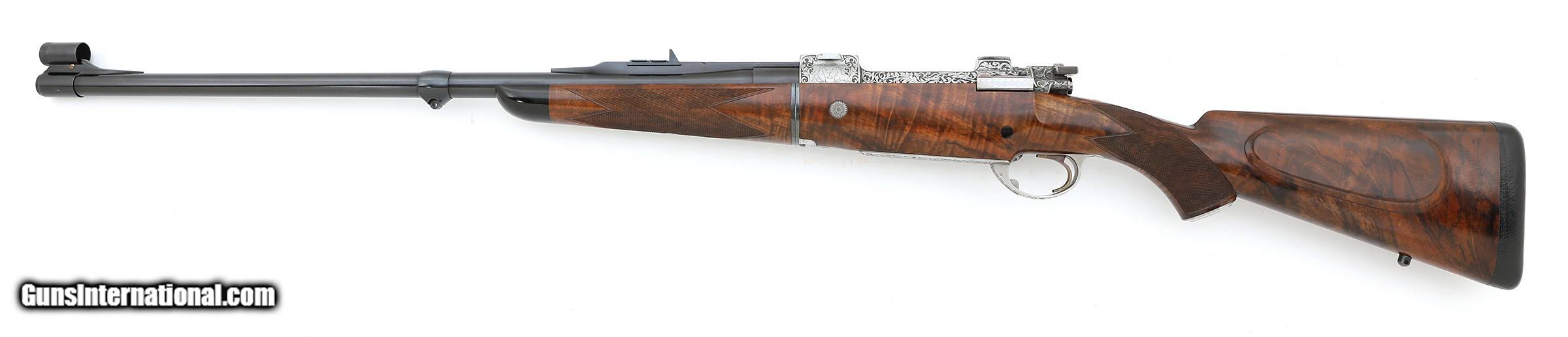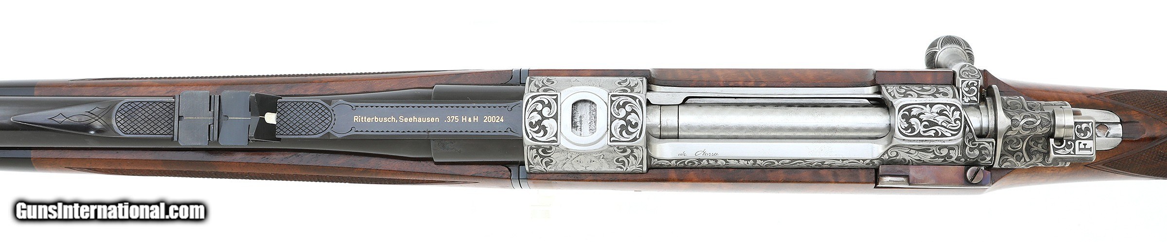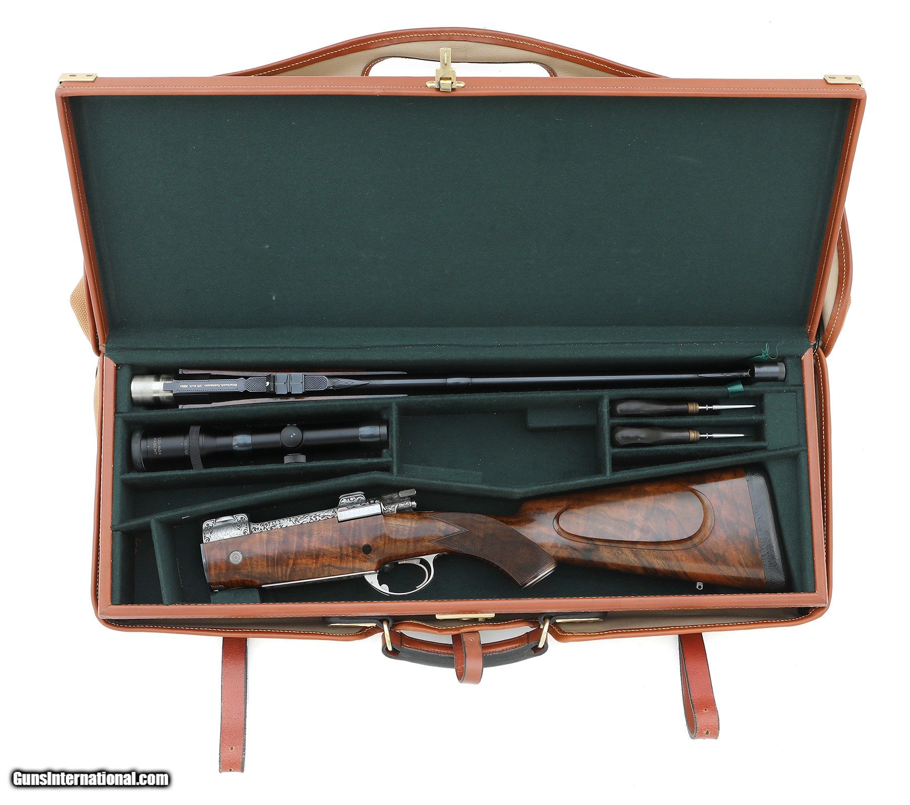Description: A fabulous very little used, and rarely seen Ritterbusch take down 375 H&H magnum.Extrodonary Dassa engraving on a double square bridge magnum Mauser 98 based action with solid side wall. Quality on a par with Hartmann & Weiss and Waffen Jung. 25 inch barrel with a quarter rib express sight with two folding leafs. Front hooded sight with pop up low light moon sight. Scoped with a Swarovski 1.25 - 4 X 24 Habicht. LOP 14 1/2 inches to a leather covered pad. Weight without scope 10 lbs. 12 oz, with scope 11 lbs. 15.6 oz. Cased in a Westley Richards leather case with canvas outer cover.Additional photos on request. SOLD |
