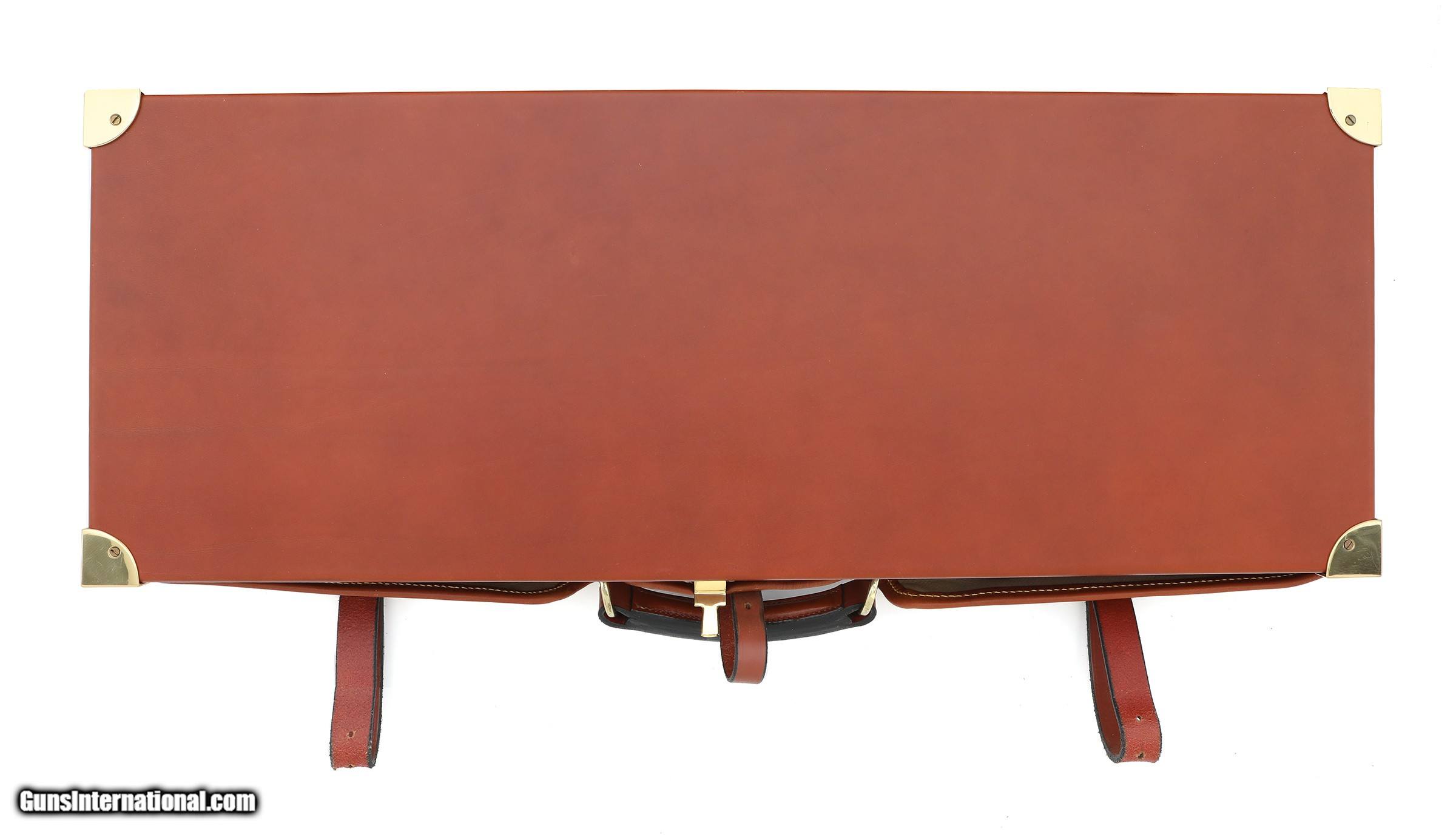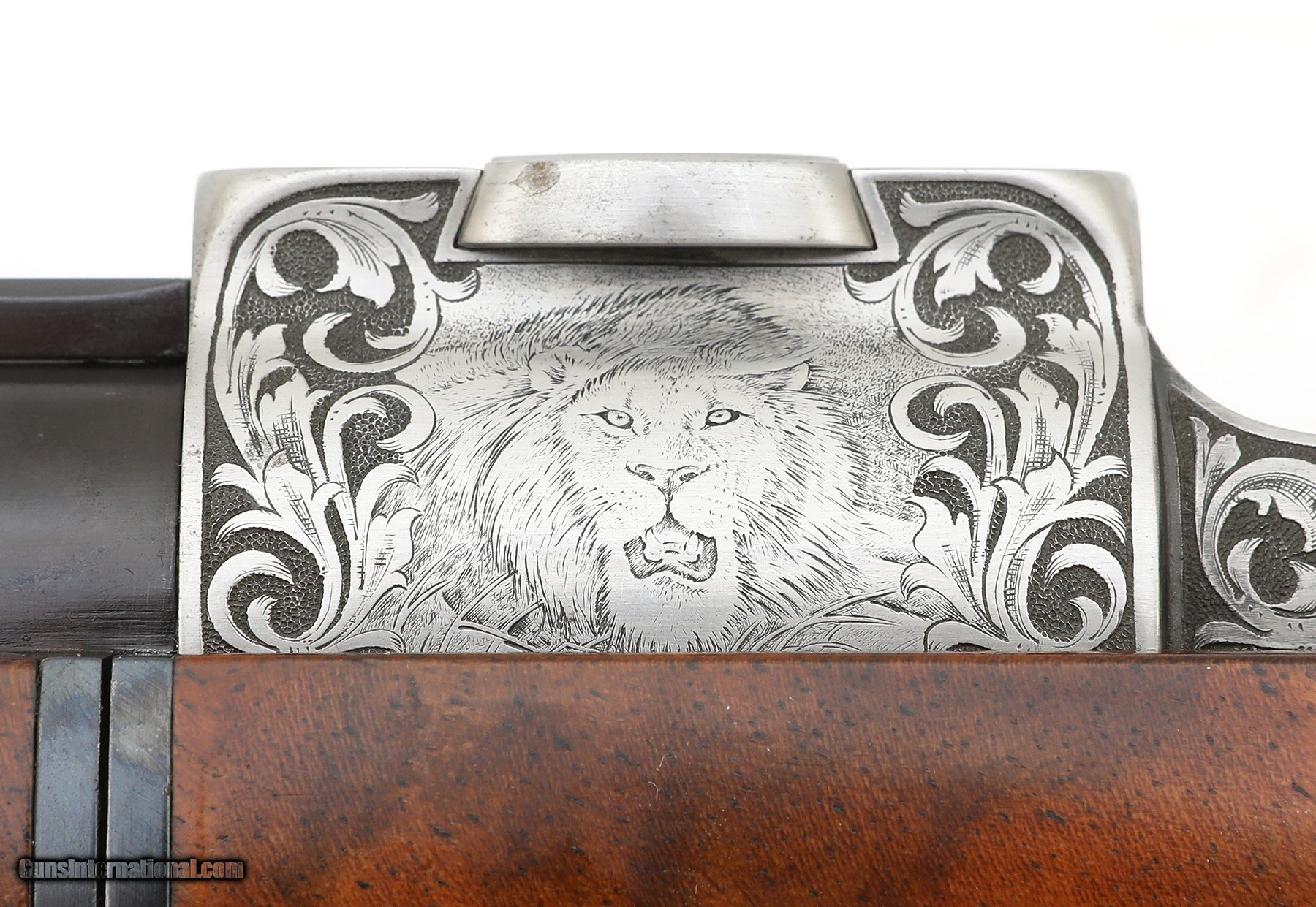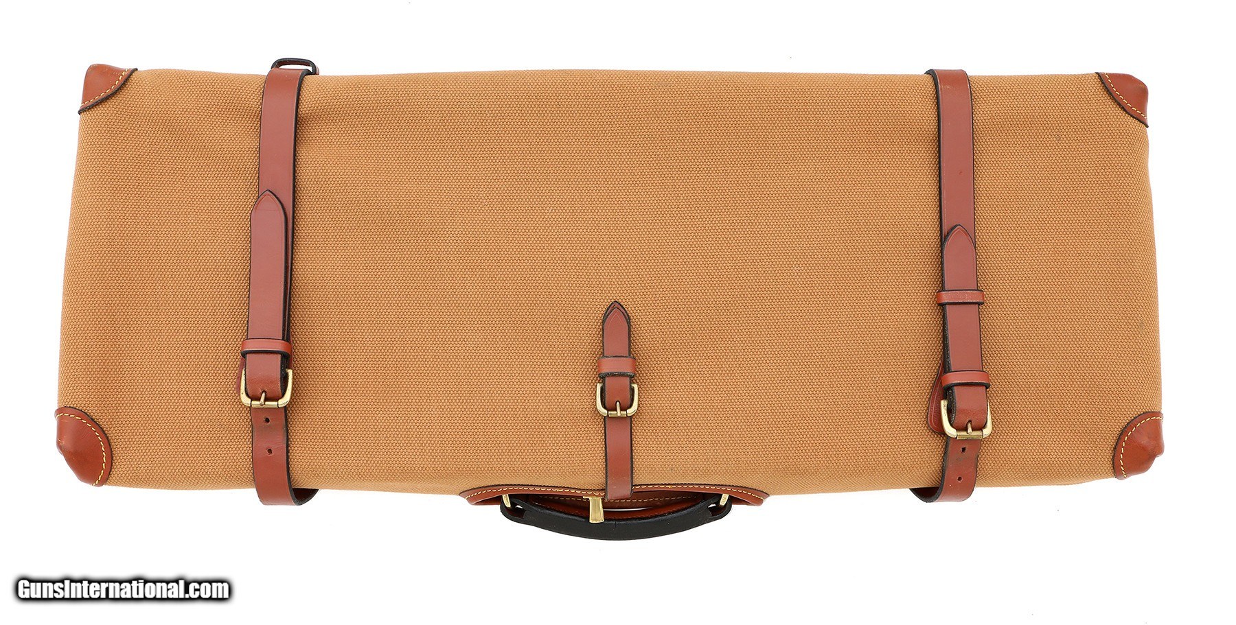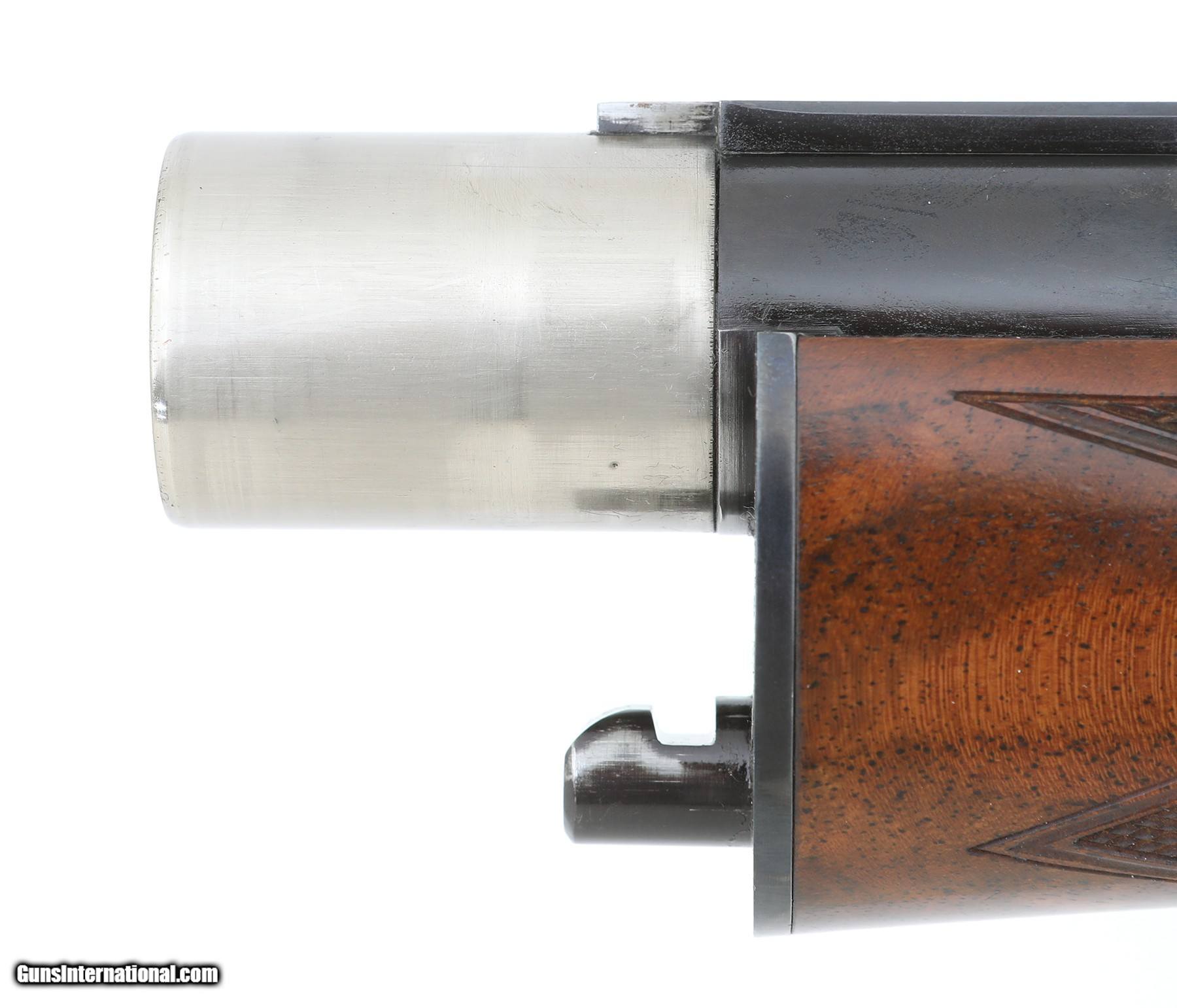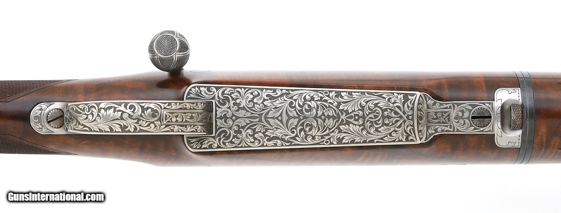 Description: A fabulous very little used, and rarely seen Ritterbusch take down 375 H&H magnum.Extrodonary Dassa engraving on a double square bridge magnum Mauser 98 based action with solid side wall. Quality on a par with Hartmann & Weiss and Waffen Jung. 25 inch barrel with a quarter rib express sight with two folding leafs. Front hooded sight with pop up low light moon sight. Scoped with a Swarovski 1.25 - 4 X 24 Habicht. LOP 14 1/2 inches to a leather covered pad. Weight without scope 10 lbs. 12 oz, with scope 11 lbs. 15.6 oz. Cased in a Westley Richards leather case with canvas outer cover.Additional photos on request. SOLD |