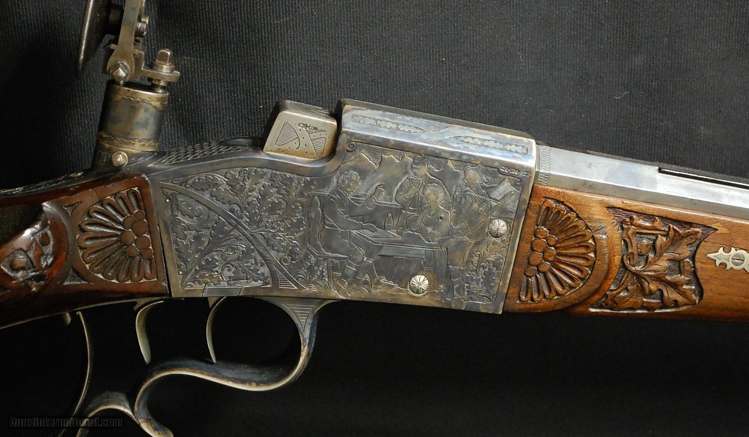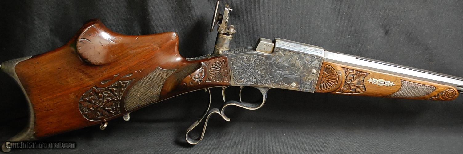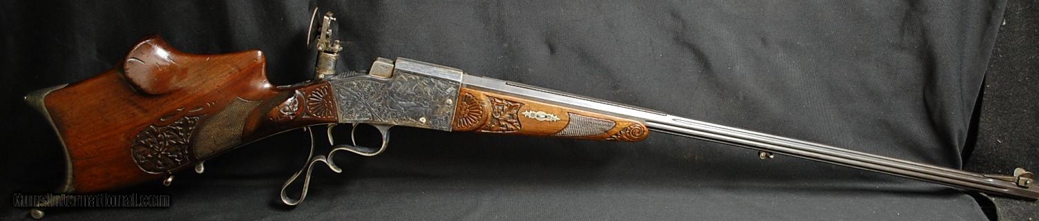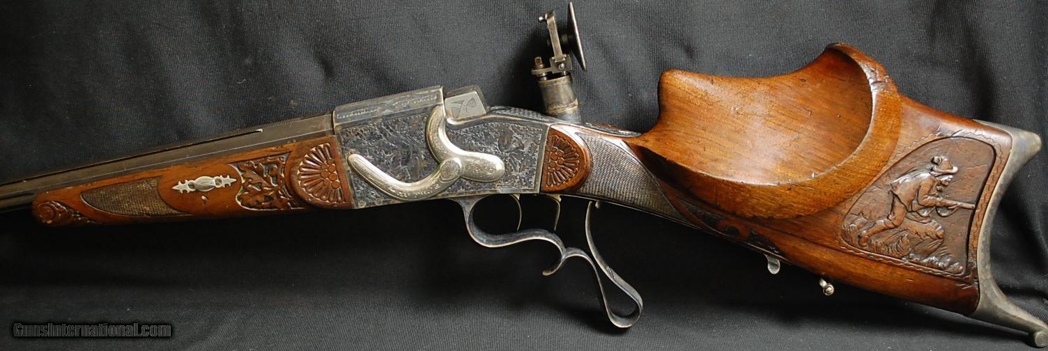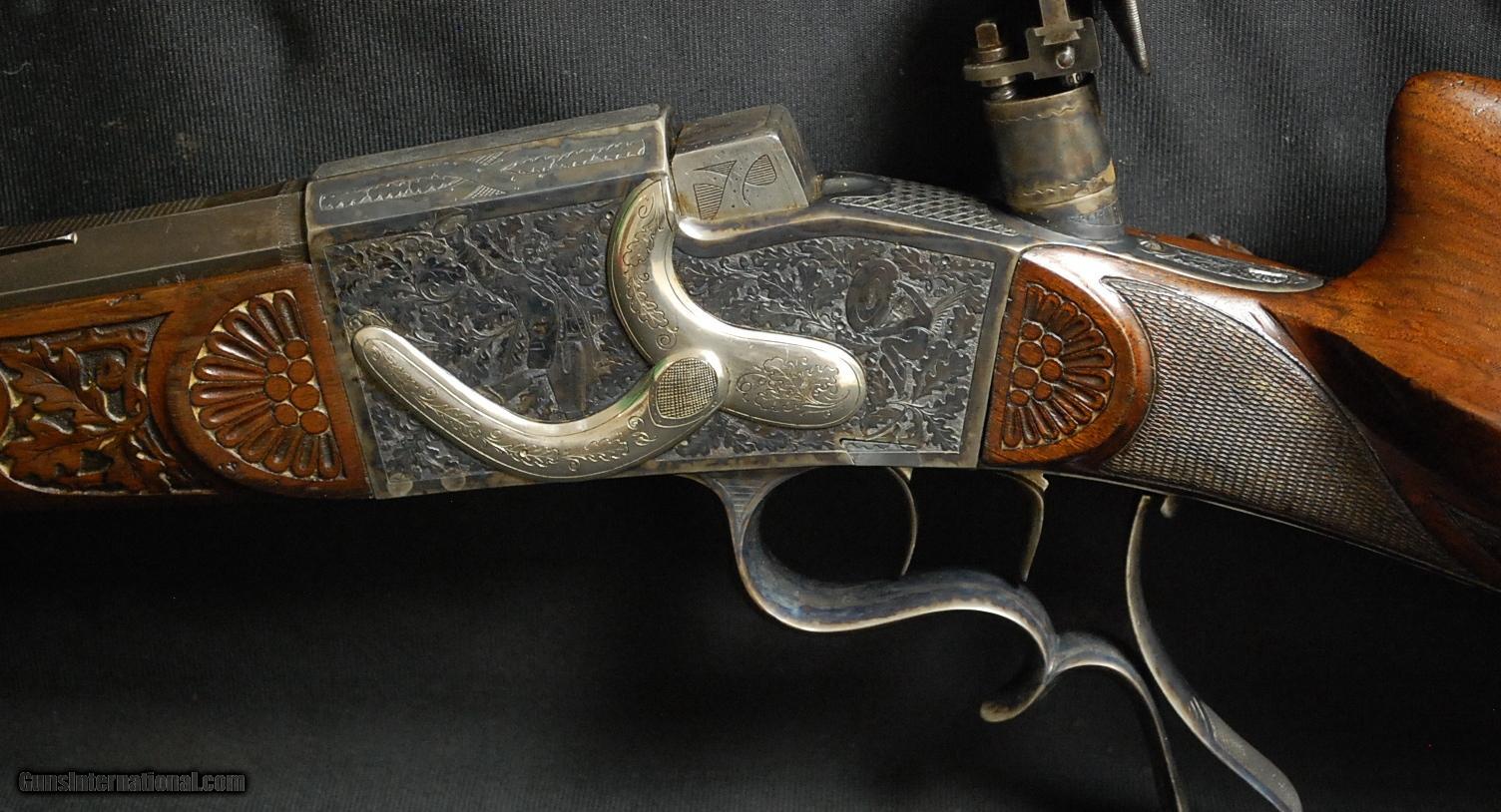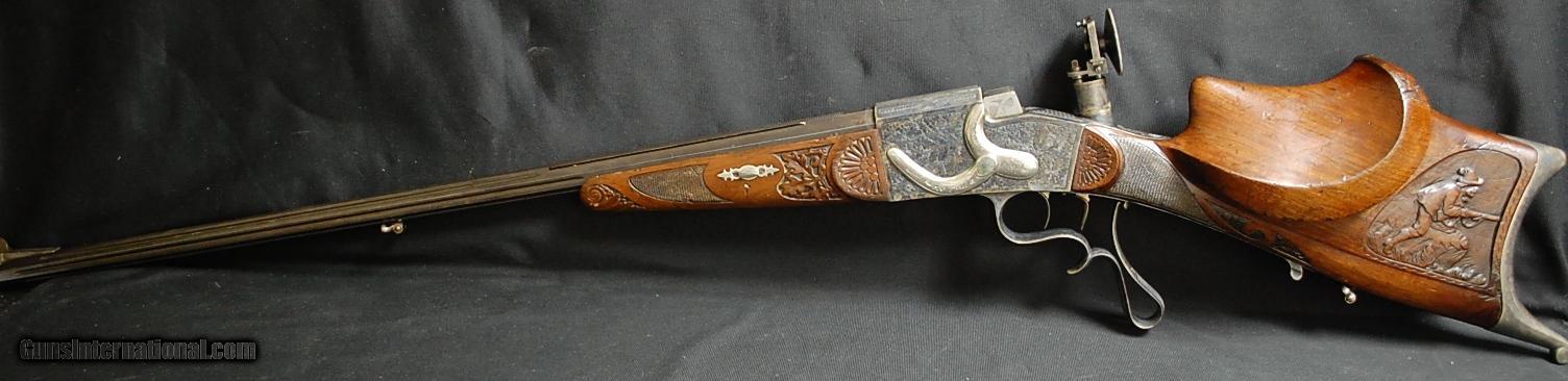 Description: Schuetzen Rifle System AYDT #1– 7.6 x 46, 32” fluted barrel, file cut ramped front sight with wings, the top of the barrel is matted throughout the length of the barrel, case colored removable trigger group falling block action, double set triggers with extended trigger guard tang, aperture rear sight on an engraved pedestal with multiple adjustments and a 1 3/4" disc, the frame is profusely engraved throughout, beautiful carving on the stock, a spectacular example.