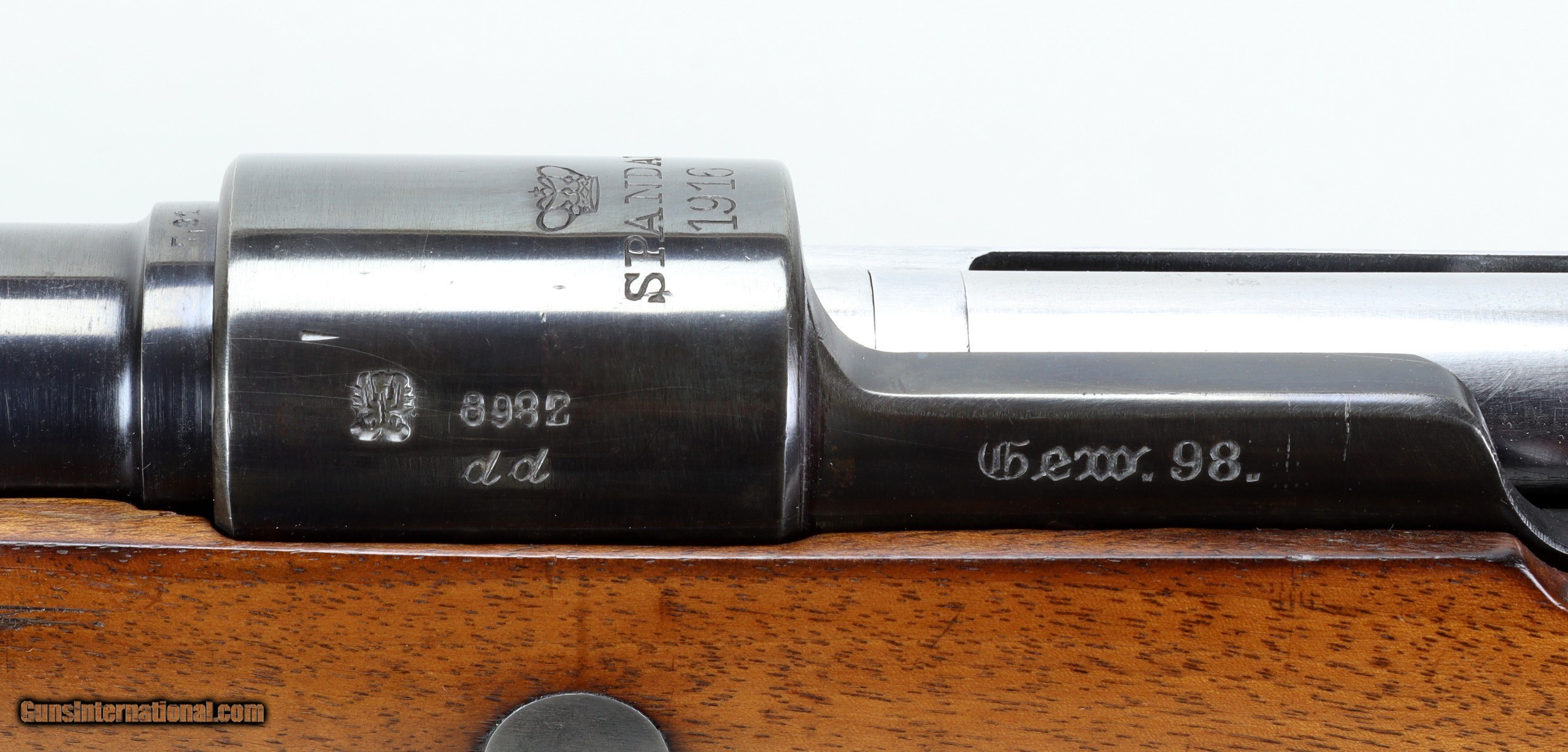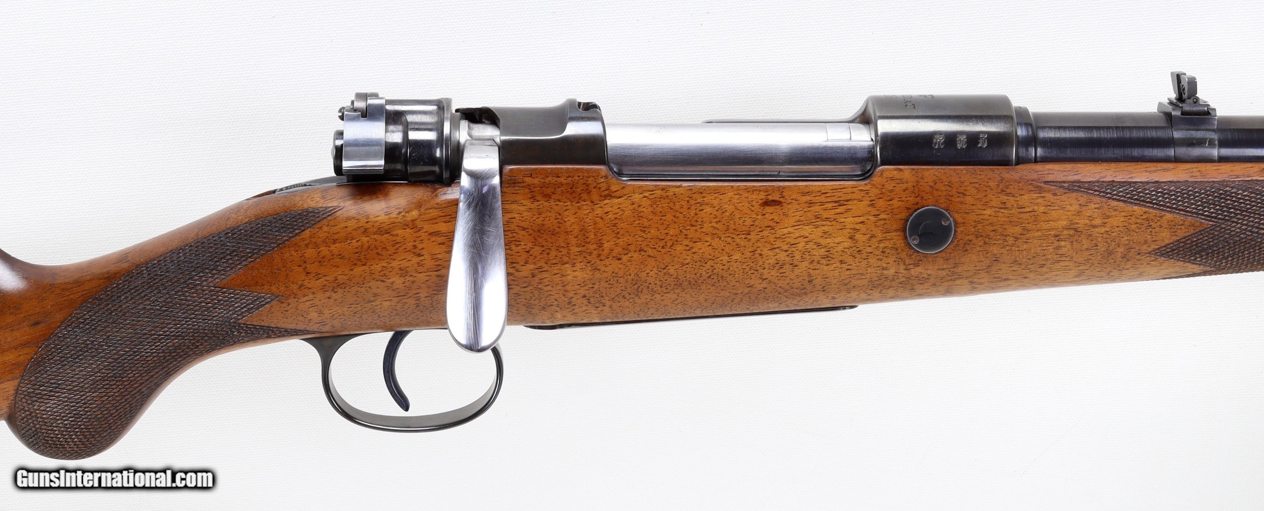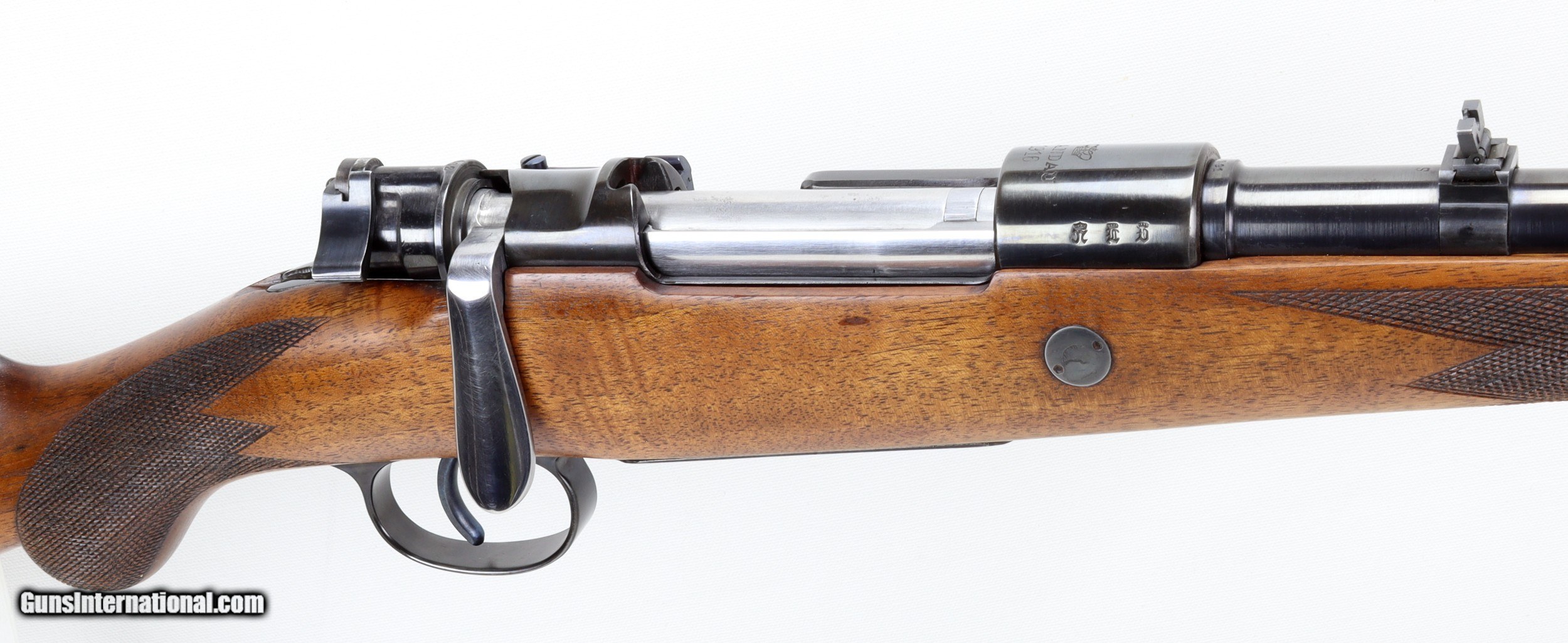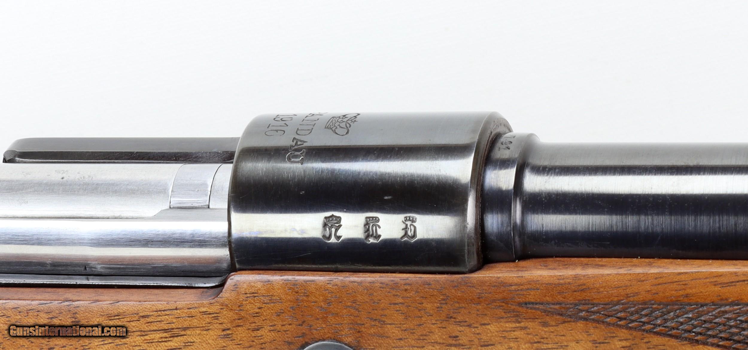 Description: Spandau GEW98 Bolt Action Mannlicher Sporter Rifle in 8x57JS. SN #8982. Mfg. in 1916. A RARE SPANDAU ARMORY CUSTOM MANNLICHER RIFLE. LOP 12 3/4". 20" Barrel with an EXCELLENT Bore with STRONG RIFLING. The Full Mannlicher Checkered Round Knob Pistol Grip Stock and Forend are in EXCELLENT condition for their age as is the Blued Metal. ALL MATCHING NUMBERS. German Imperial Proof marks. Flip up Rear Sight. Sling Swivels. Custom Bolt Handle. Steel Buttplate. Includes 1 Box of Sellier & Bellot 8x57JS Ammo (.323 Bore) Weight: 6.8 lbs. Trigger Pull: 5 1/2 lbs. More photos available upon request. Ships to Lower 48 W/ Insurance $50.00. SOLD PENDING RECEIPT OF FUNDS SOLD Curio/Relic: Yes Rifle Caliber: 8x57mm JS Manufacturer: Spandau Model: GEW98 Serial Number: 8982dd Barrel Length: 20 Condition: VG to Excellent Metal Condition: VG to Excellent Wood Condition: VG to Excellent Bore Condition: Excellent For Age Action: Bolt Butt Pad: Steel LOP: 12 3/4 Finish: Blue Weight: 6.8 lbs. Manufacture Date: 1916 |