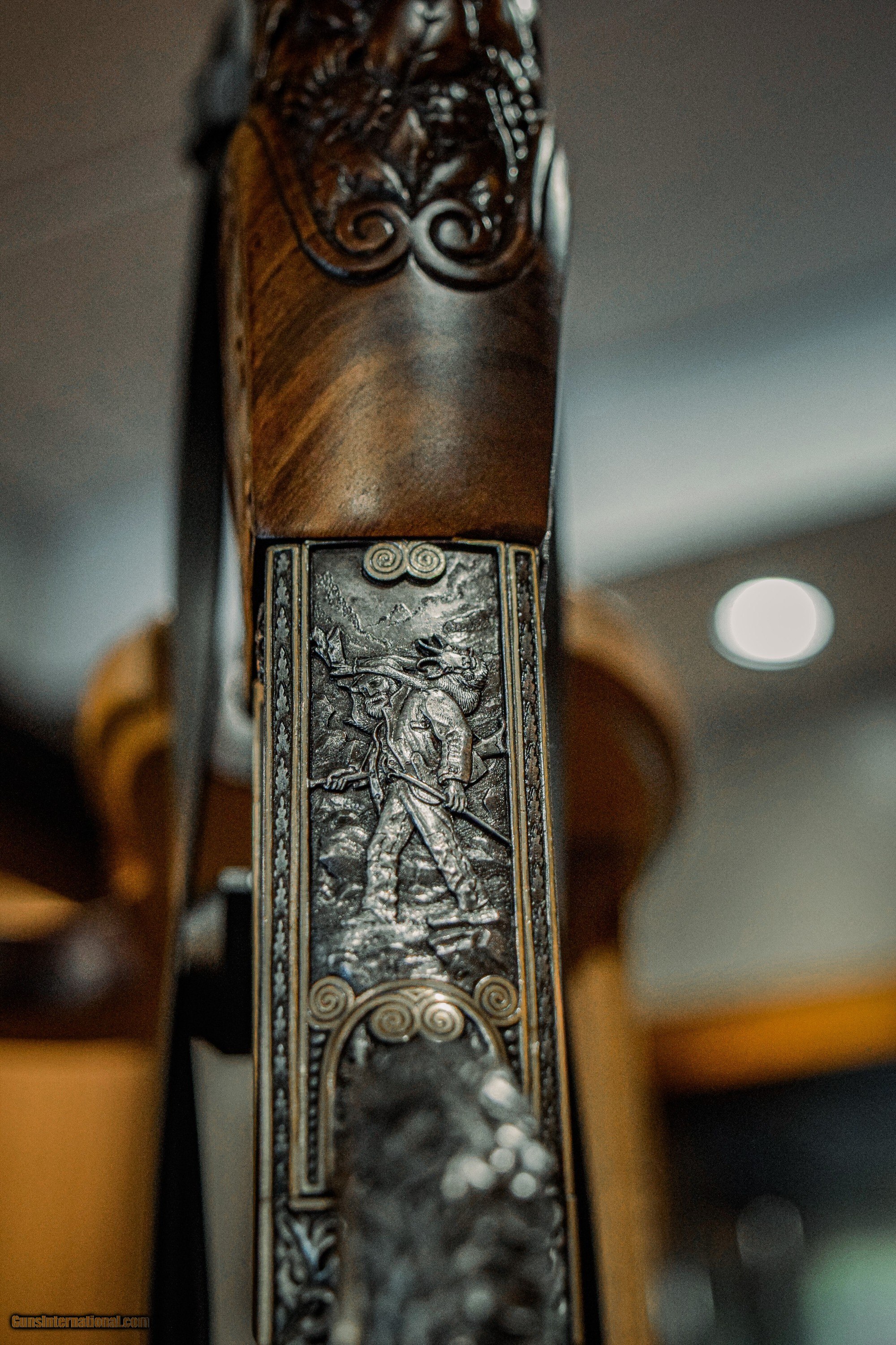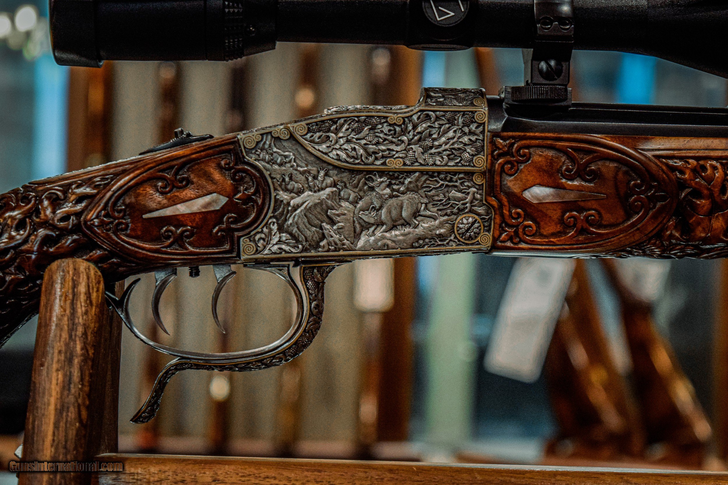 Description: This ornate piece is highly precise! Equipped with a 25.5" barrel, engraved stock, and receiver of the Alpine Ibex, Zeiss Diavari Scope, and a blued finish. Without a doubt, the Stogner-Engraved Rifle is a great addition to any collection. STÖGNER-ENGRAVED NR 500/86 Underlever .270 Win. Rifle