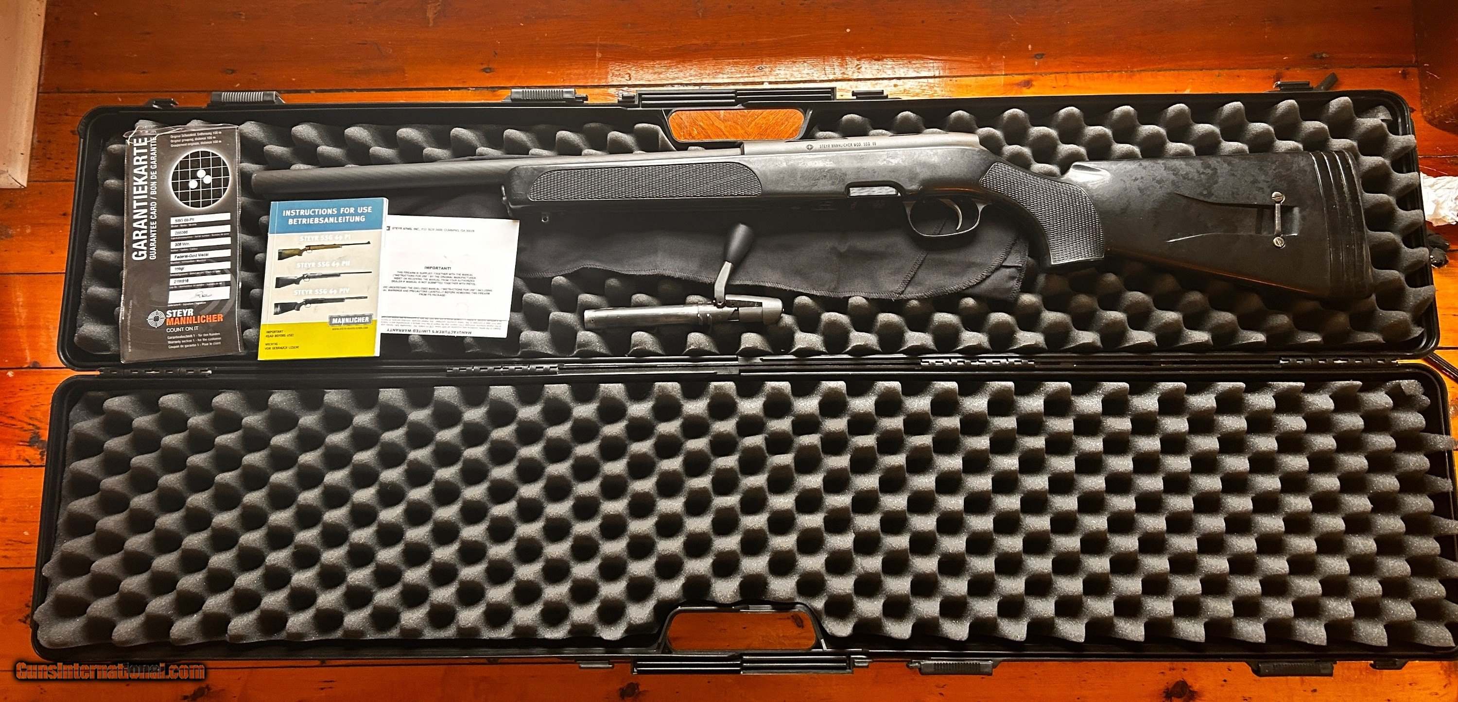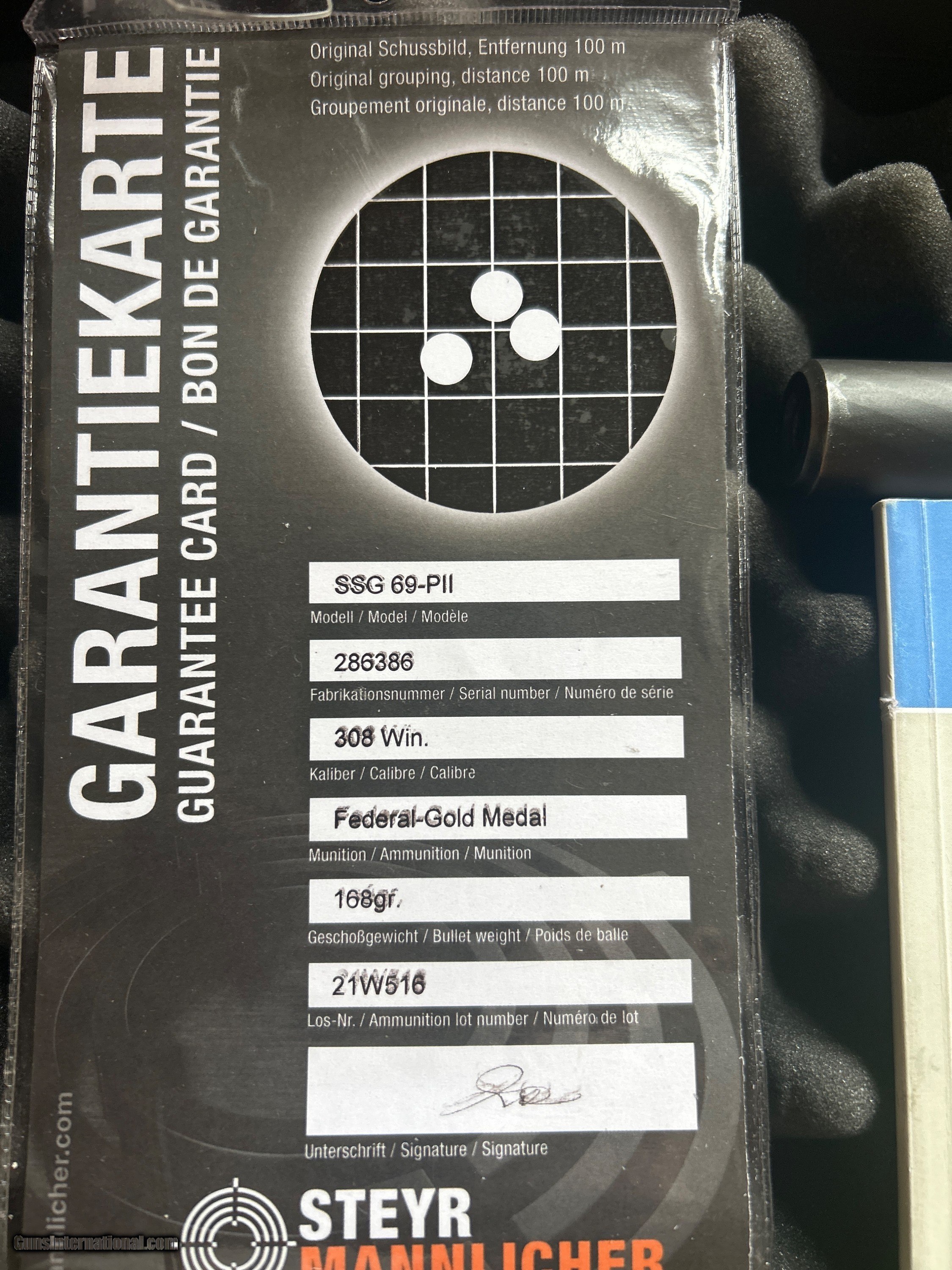Description: The legendary Steyr SSG 69, this one is a P II K (Kurz, German for "short") chambered in .308 Winchester. Made in Austria in September, 2008. 20" heavy contour barrel with crowned muzzle is mirror bright. Shiny chamber, tactical bolt handle. Sharp checkering on adjustable synthetic stock, with adjustable bipod stud on factory rail. Dovetailed receiver accept Steyr QD scope rings. Single adjustable match trigger. Small nick on barrel, everything else is like new. One factory mag included. These rifles are no longer made. Ships in factory hard case with test target, owners manual, warranty card, cloth scabbard. Professionally packed and shipped to your FFL via USPS. NO TRADES Rifle Caliber: .308 Winchester Price: $2,500.00 Shipping: $50.00 Contact Seller |