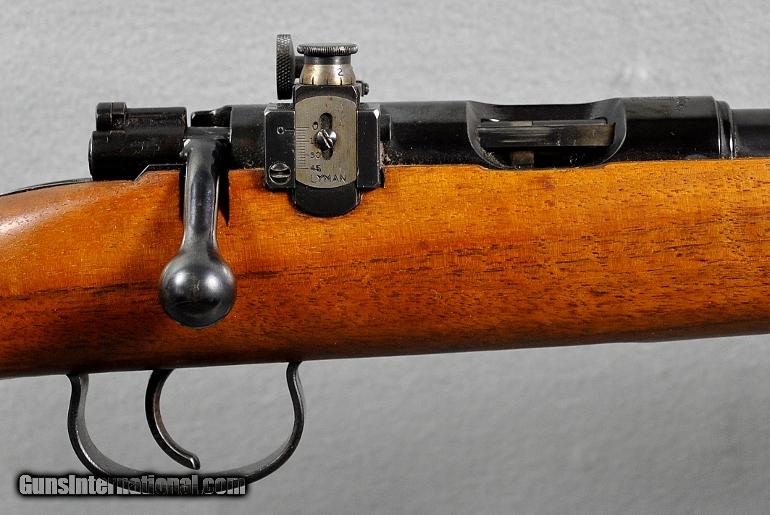Waffenstadt Suhl (Mfg.), single shot bolt action rifle, Deutches Sportmodell, caliber 5.4mm (.22 LR), s/n 10757, simulates military Mauser 98 model, receiver based somewhat on scaled down Mauser 98, Suhl crest on top front of receiver between maker's name, Lyman rear peep sight and blade front sight, 3/4 length stock with one barrel band, fake ramrod extension protruding from forearm,