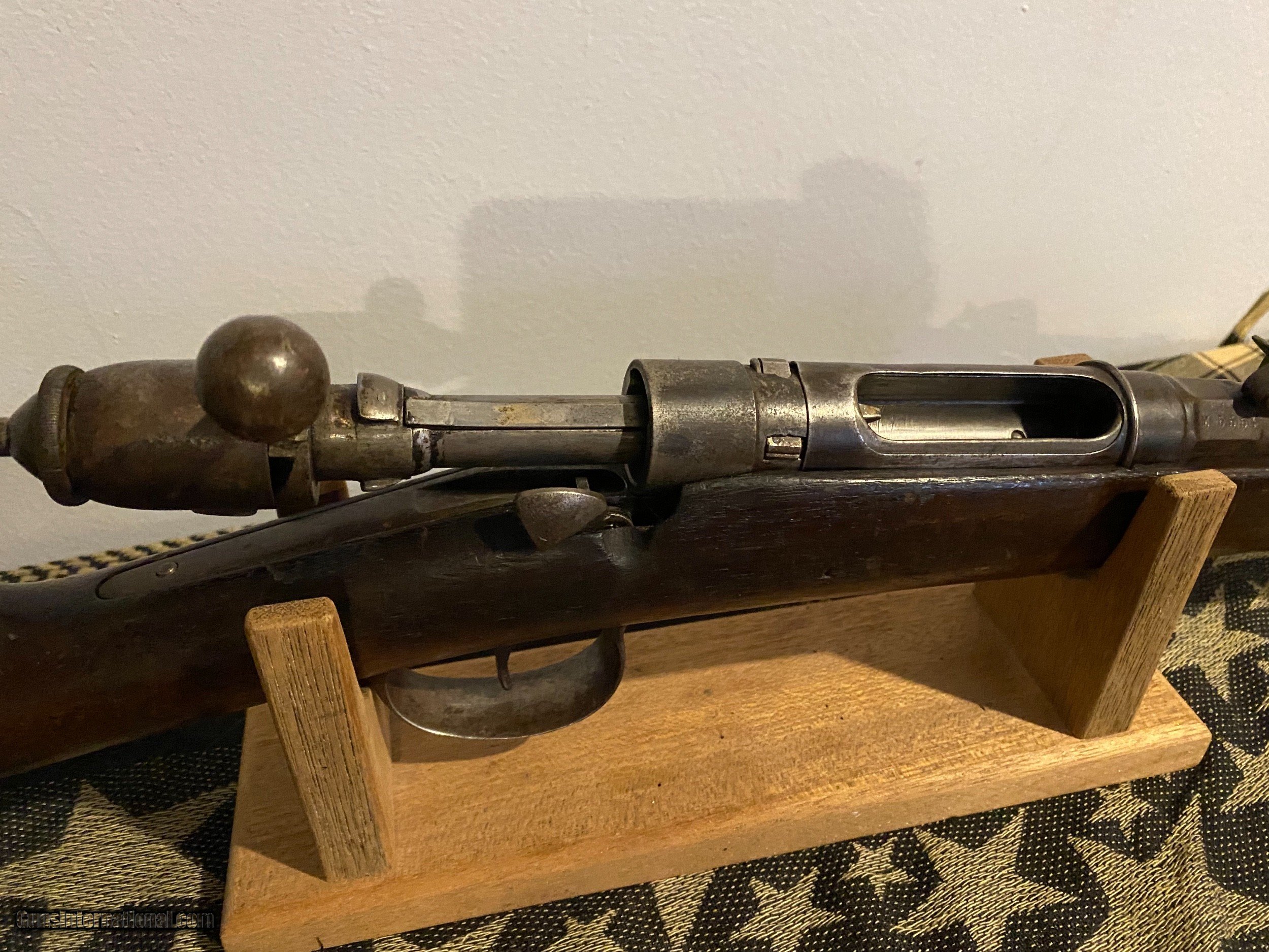 Description: 1882 stamped italian Vetterli-Vitali model 1870, single shot in 10.35x37rmm. Refurbished in 1905. Rifle is in beautiful condition and well kept. Stock has minor blemishes. Bore is in excellent condtion. Original barrel with blueing intact. Patina is present on barrel, action, buttplate, and trigger guard as well as barrel. Action is as smooth as butter. These rifles are very rarely seen in the cavalry model and unconverted to 6.5 carcano. SOLD Curio/Relic: Yes Antique: Yes Rifle Caliber: 10.35x47mmR Manufacturer: RE Terni Model: 1870 Serial Number: M5554 Condition: good Metal Condition: minor patina Wood Condition: minor blemishes Bore Condition: excellent Manufacture Date: 1882 |