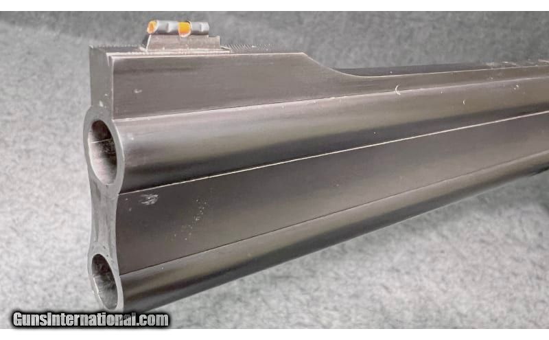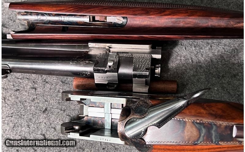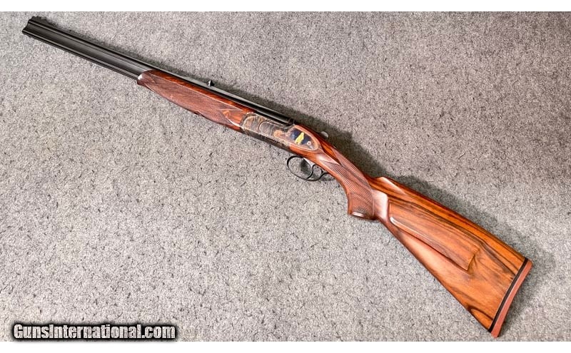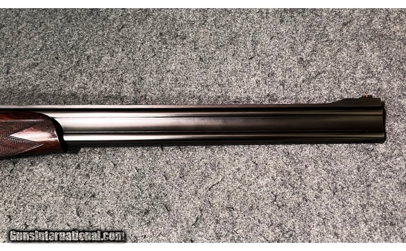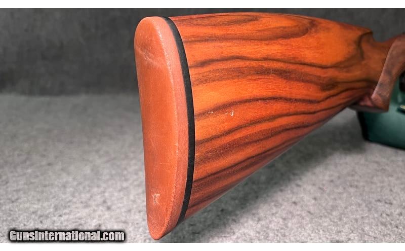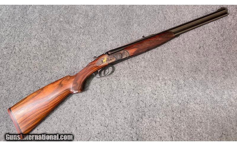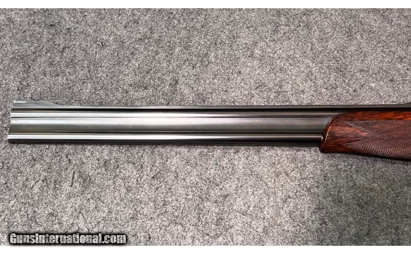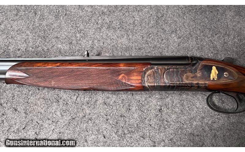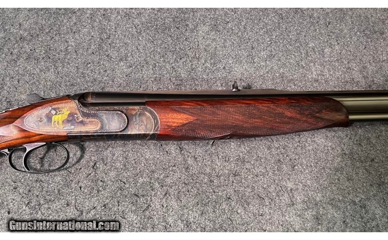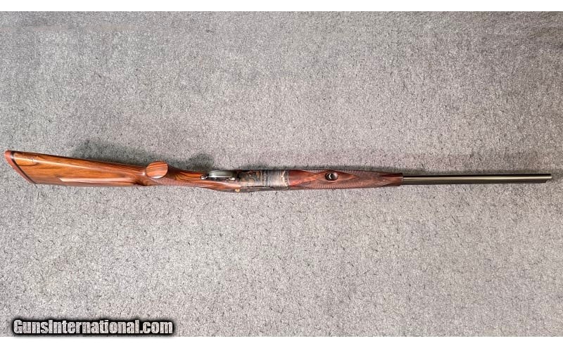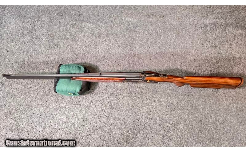 Description: This high-end double over/under rifle is a Renato Menegon Waldberg Model, chambered in 9.3X74R. It has 24" solid rib blued barrels, case-hardened receiver, checkered deluxe wood stocks, a single selective trigger, and red hard rubber butt pad. This gun is in overall very good condition showing only very minimal handling wear. It would be hard to improve upon this piece; it exhibits outstanding workmanship. 9.3x74R SOLD Metal Condition: "Bluing is in very good to excellent condition, with some small spots showing Wood Condition: "Wood is in very good condition, showing some handling wear and a few small dings throughout Bore Condition: Bore is bright and shiny with strong rifling intact Barrels: "24"" barrels with solid rib, partially textured Triggers: Single selectable smooth curved trigger Stock Dimensions: "14"" LOP, overall length 41"" Fore End: Semi-Schnabel dark walnut diamond checkered fore arm Butt Pad: Red rubber butt pad with black spacer Weight: 7lbs 12oz Sights: "Fixed fiber optic front sight, dovetailed V blade rear sight Item Location: Wichita, KS |