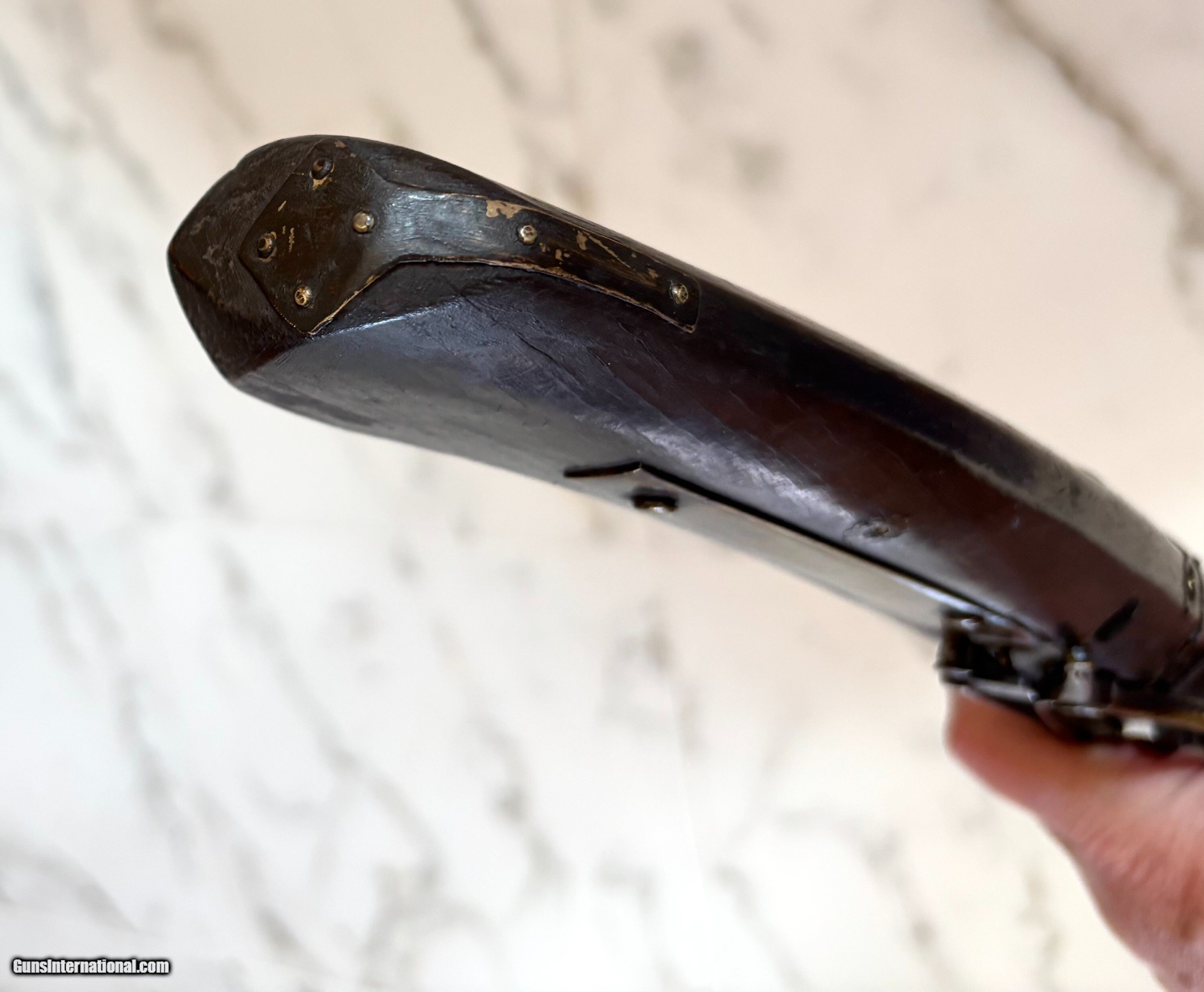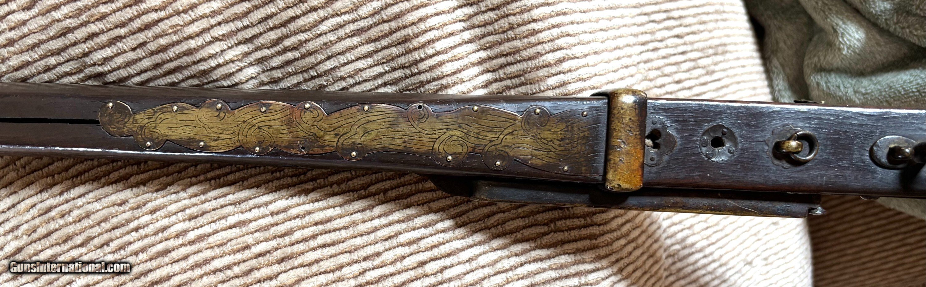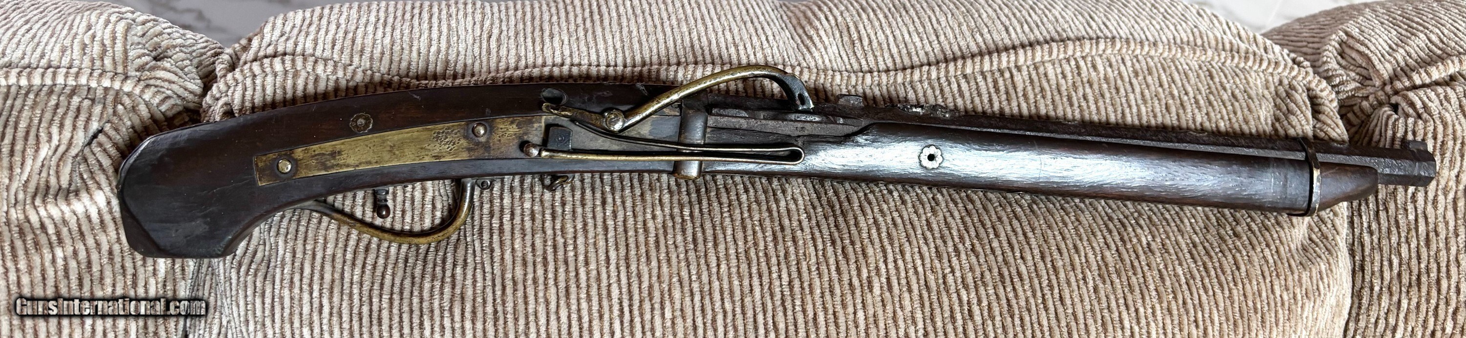 Description: This gun is in original configuration, it was never shortened from a rifle but built like that. Ive attached a listing that sold for $ 2500 of a virtually identical gun. The front sight and crown show consistent with the rest of the metal patina. The gun shows heavy wear, especialy on the barrel but features nice brass and silver inlays. Overall lenght 25". Surprisingly, the hammer/ trigger mechanism work No license needed to buy Antique: Yes Price: $1,499.00 Contact Seller |