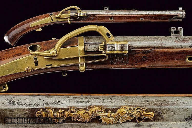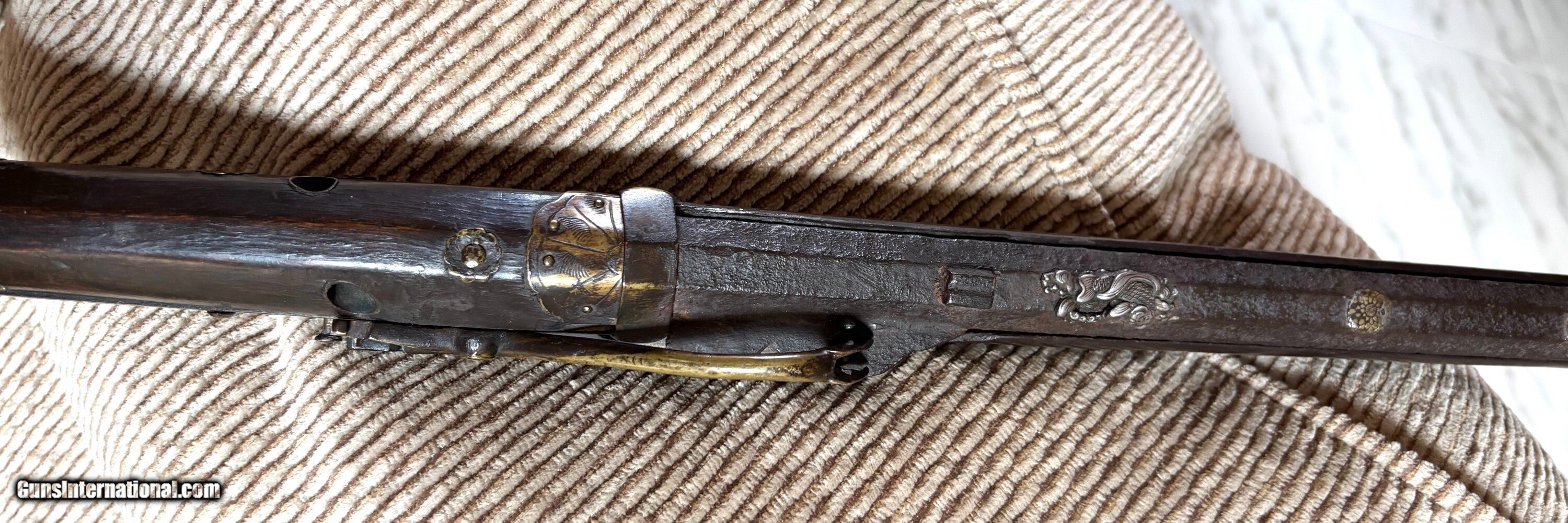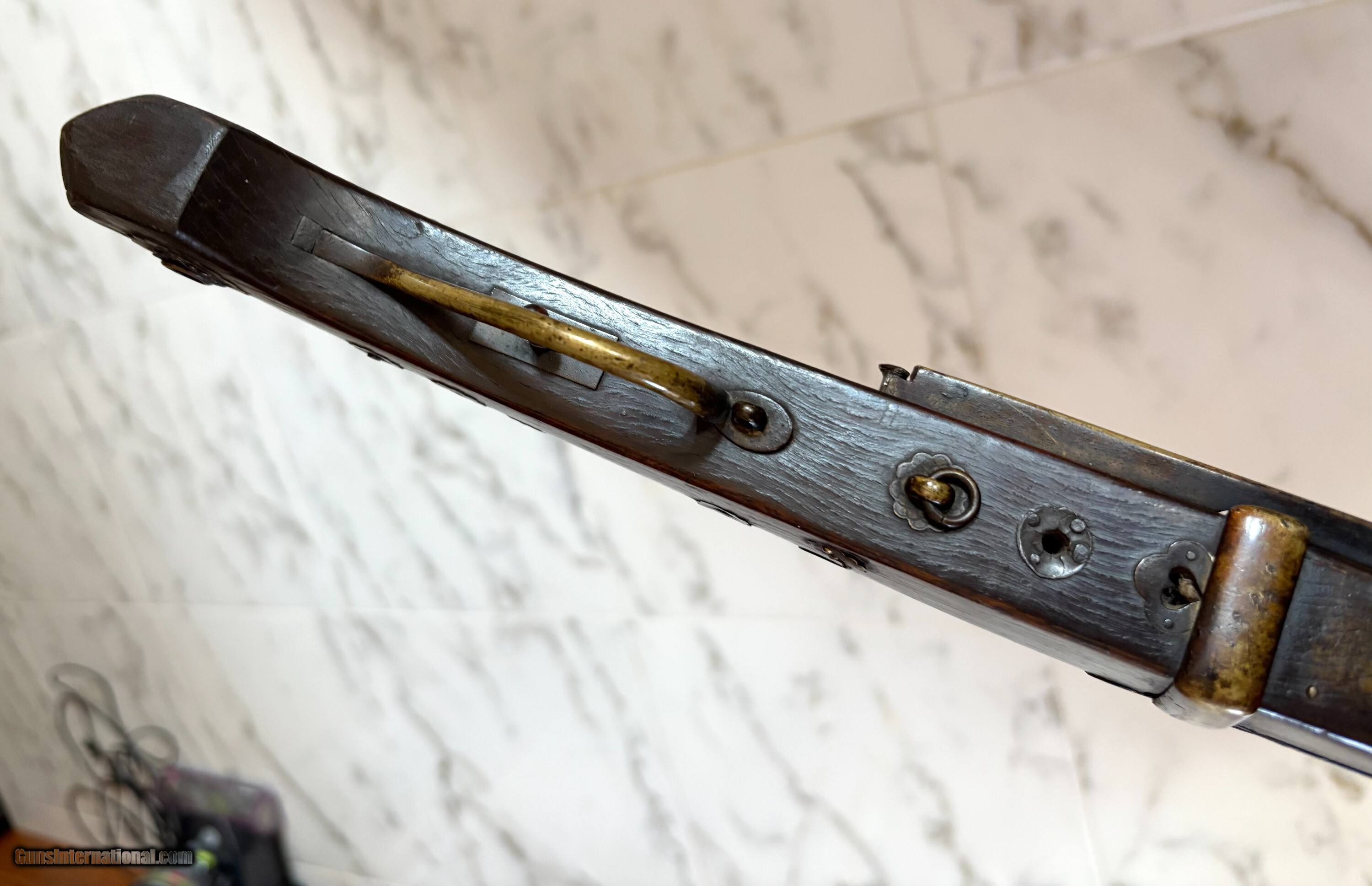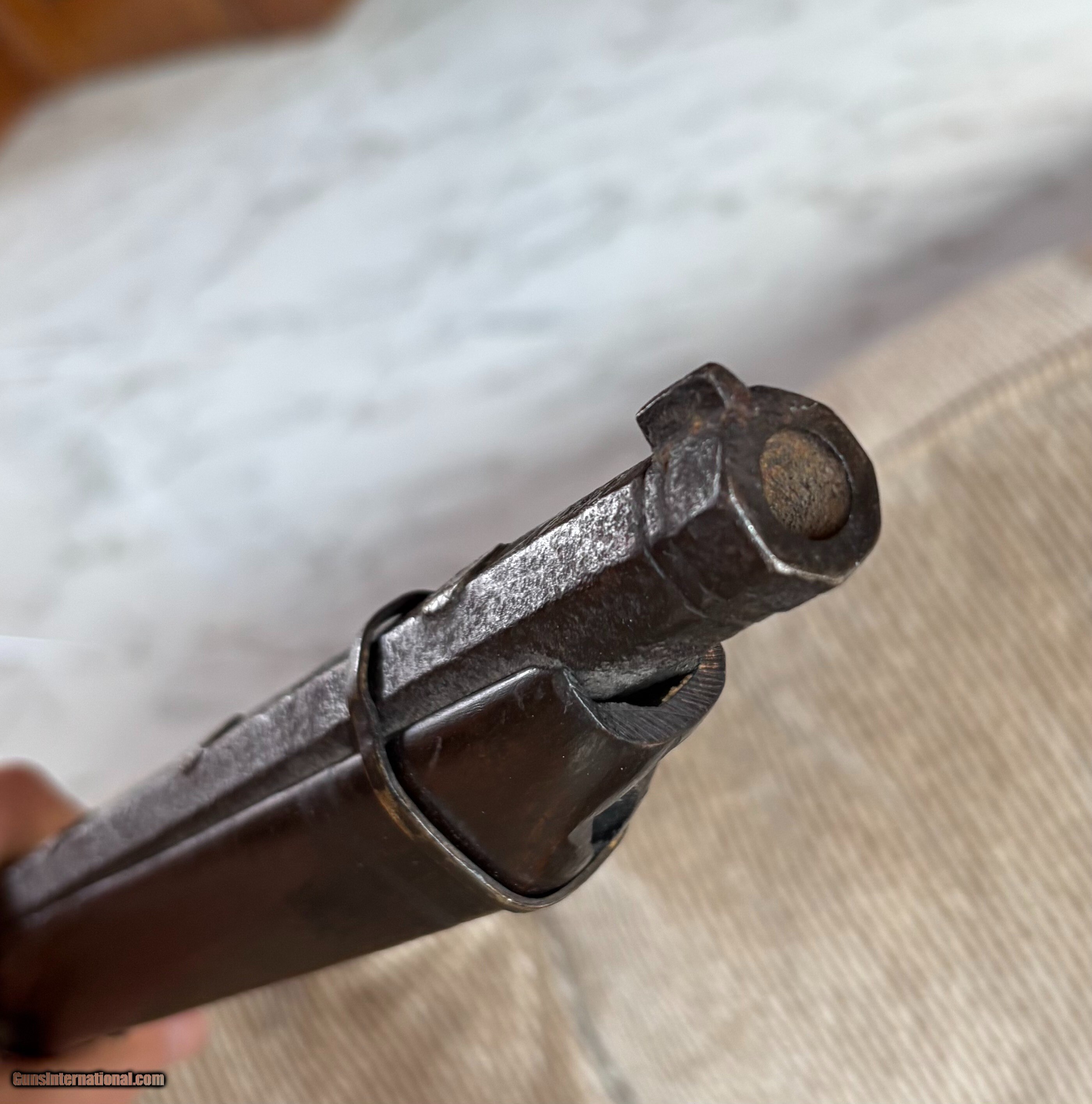 Description: This gun is in original configuration, it was never shortened from a rifle but built like that. Ive attached a listing that sold for $ 2500 of a virtually identical gun. The front sight and crown show consistent with the rest of the metal patina. The gun shows heavy wear, especialy on the barrel but features nice brass and silver inlays. Overall lenght 25". Surprisingly, the hammer/ trigger mechanism work No license needed to buy Antique: Yes Price: $1,499.00 Contact Seller |
