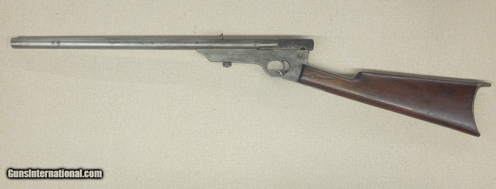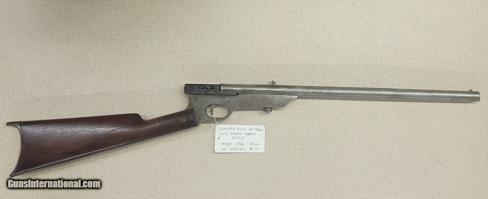 Description: Guns Listing ID: 492351 Available - this neat old Quackenbush Safety rifle. Chambered for .22 Short (only), it‚‚s a very unique item! The Quackenbush rifle, invented by industrialist Henry M. Quackenbush, is a cleverly made \"Boys Safety‚‚ rifle\" sold in the 1893–1920 period. The ‚‚monoblock\" action works by snapping it open sideways, loading the chamber, closing the block and manually cocking the striker. There is no manual safety. This one is the take down version. It has a Shutzen style butt plate on a hardwood stock. The bore is so-so with visible rifling. The original blued finish is mostly faded away but there is no active rust. We have test fired and cleaned this rifle and function was entirely corre SOLD Curio/Relic: Yes Manufacturer: H.M. QUACKENBUSH Model: Boys Safety Rifle Caliber Info: .22 SHORT Condition: Used - Non-Certified Barrels: 18 BARREL Finish: PLUM |
