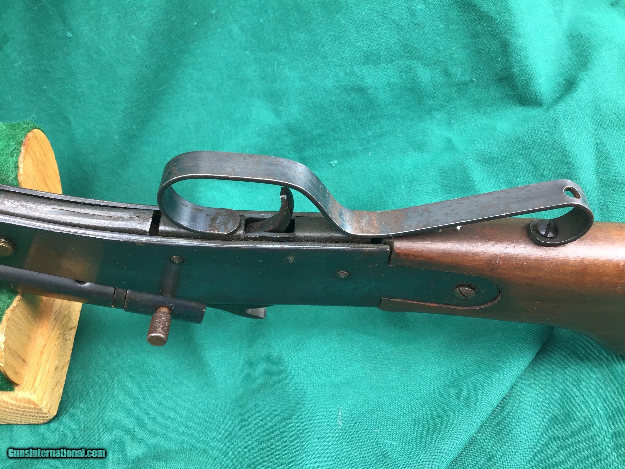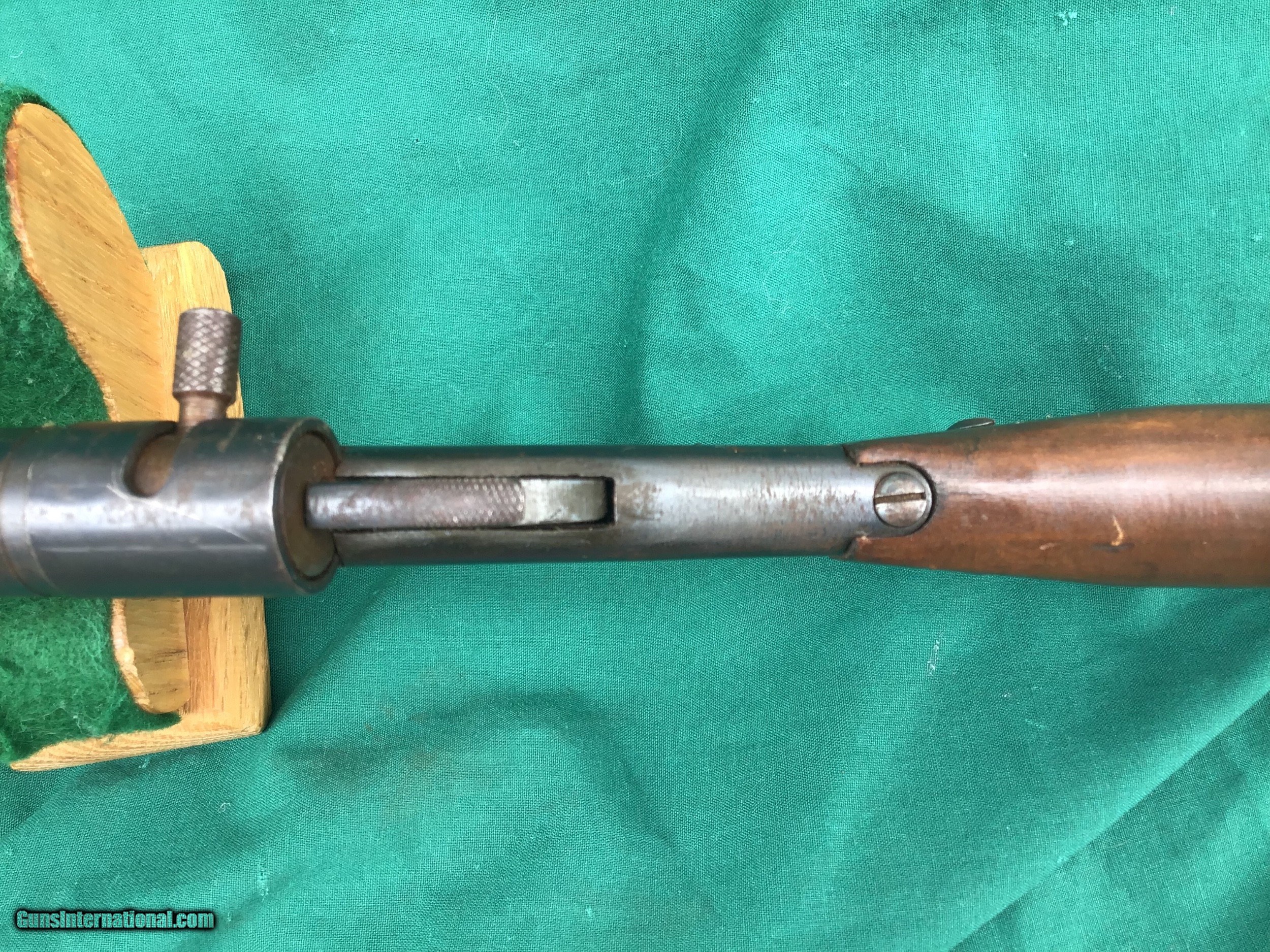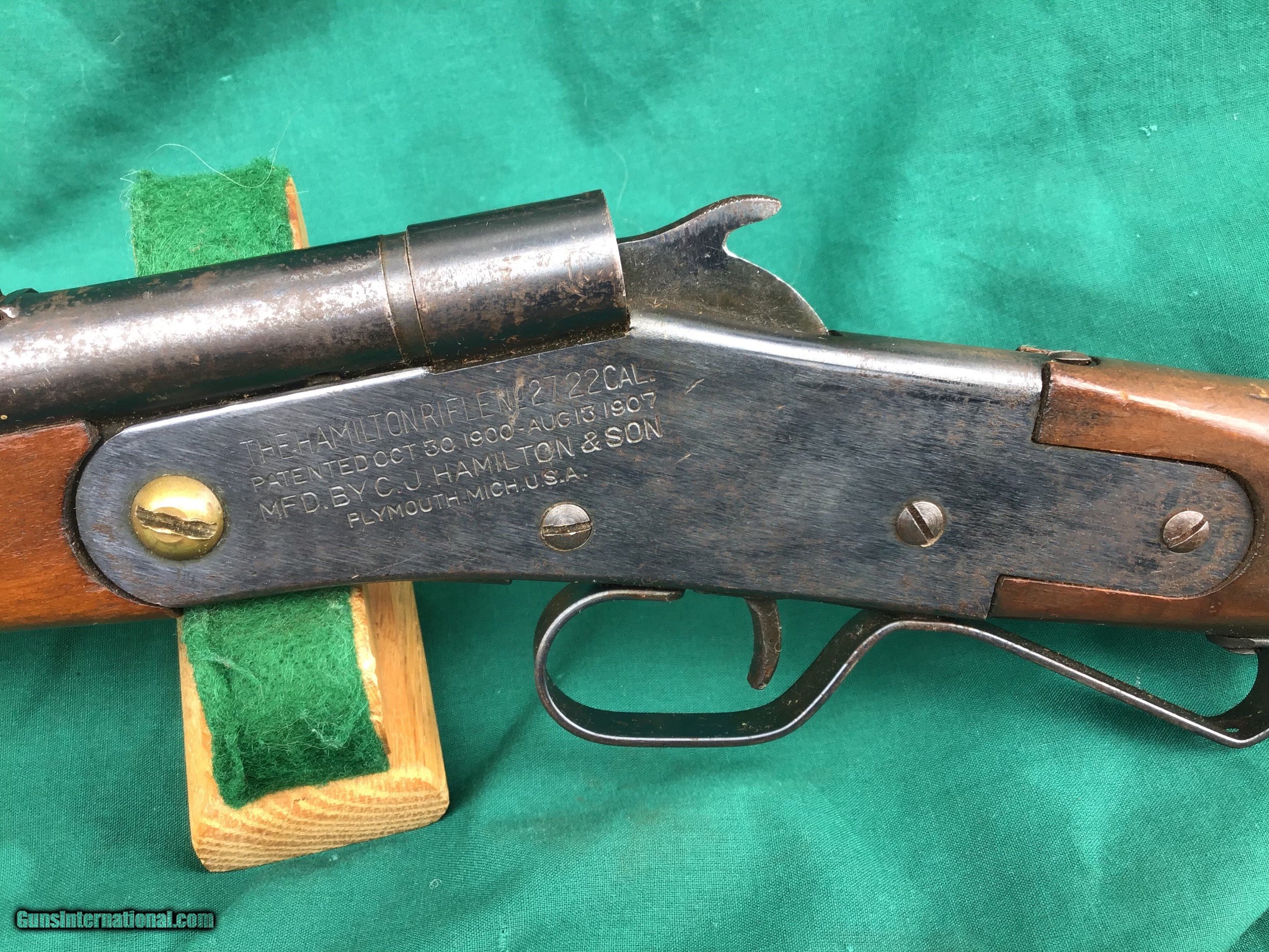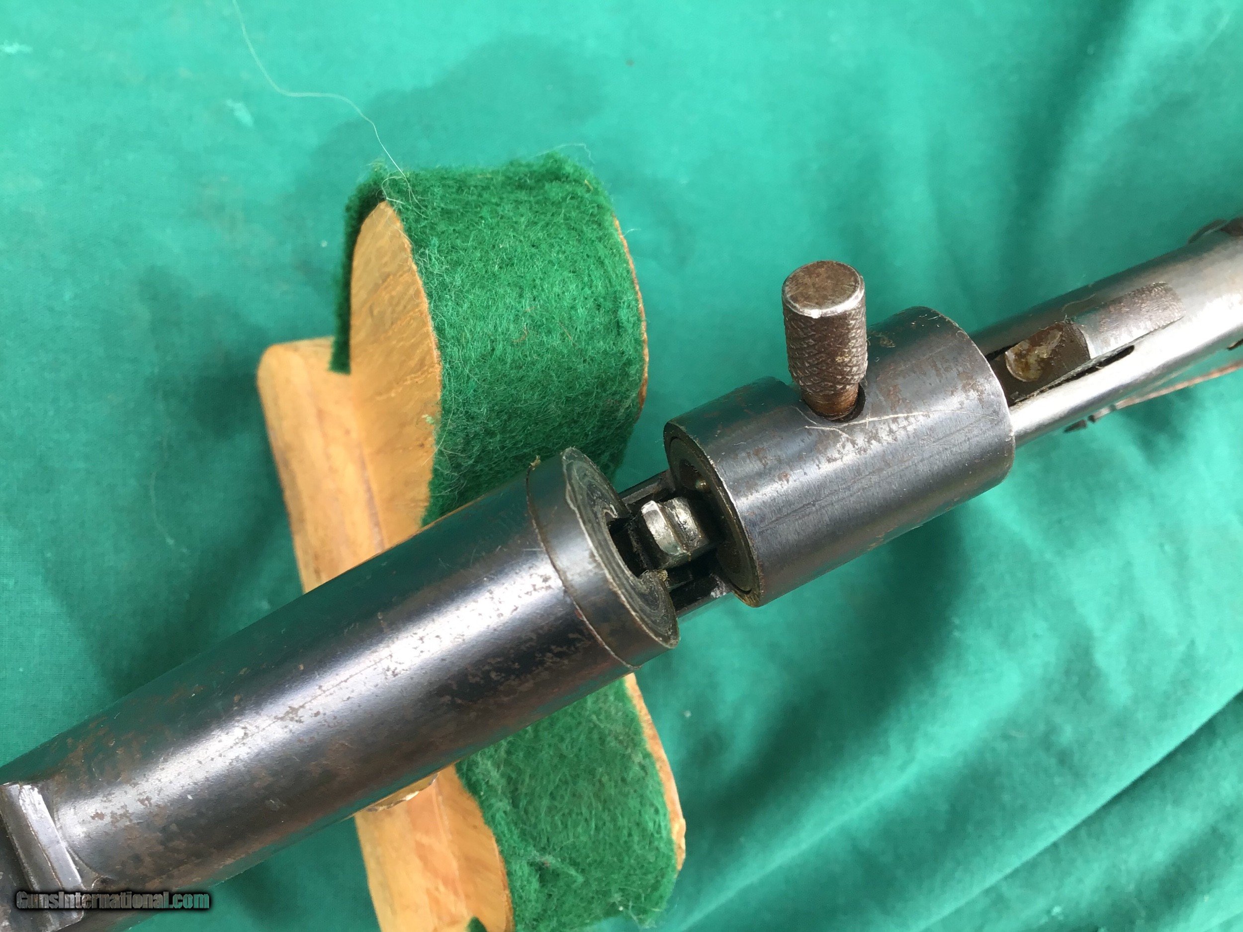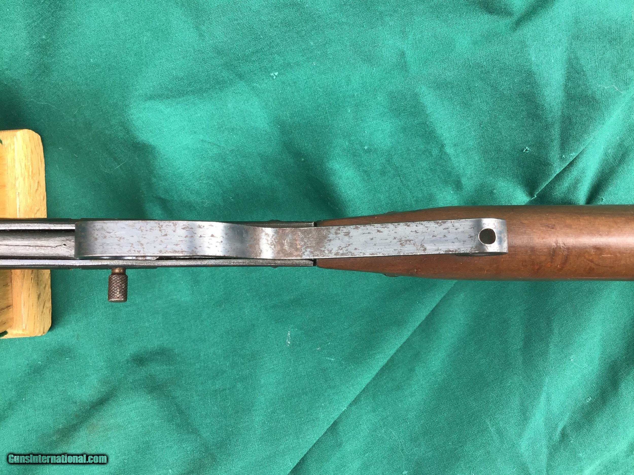 Description: Sold .......This is probably one of the best Hamilton Model 27 that I’ve seen in a very long time. .22 caliber with 16” barrel. The bore is very nice and I will rate a 7 on a scale from 1 to 10. I will rate the overall finish 85 to 90% original blue with brown patina mixing in throughout. Great markings. Both forend and buttstock are in good condition showing normal handling marks you would expect to see from a boys rifle. The only negative thing I can say is that the takedown screw was obvious lost sometime in the past and replaced with a brass screw. It will be hard to find a better one. Must ship to a FFL or Curio and Relics license holder. This firearm as with any other should be checked first by a gunsmith before any attempt is made to fire / operate it. Please feel free to ask questions. SOLD Antique: Yes Manufacturer: Hamilton Model: 27 |