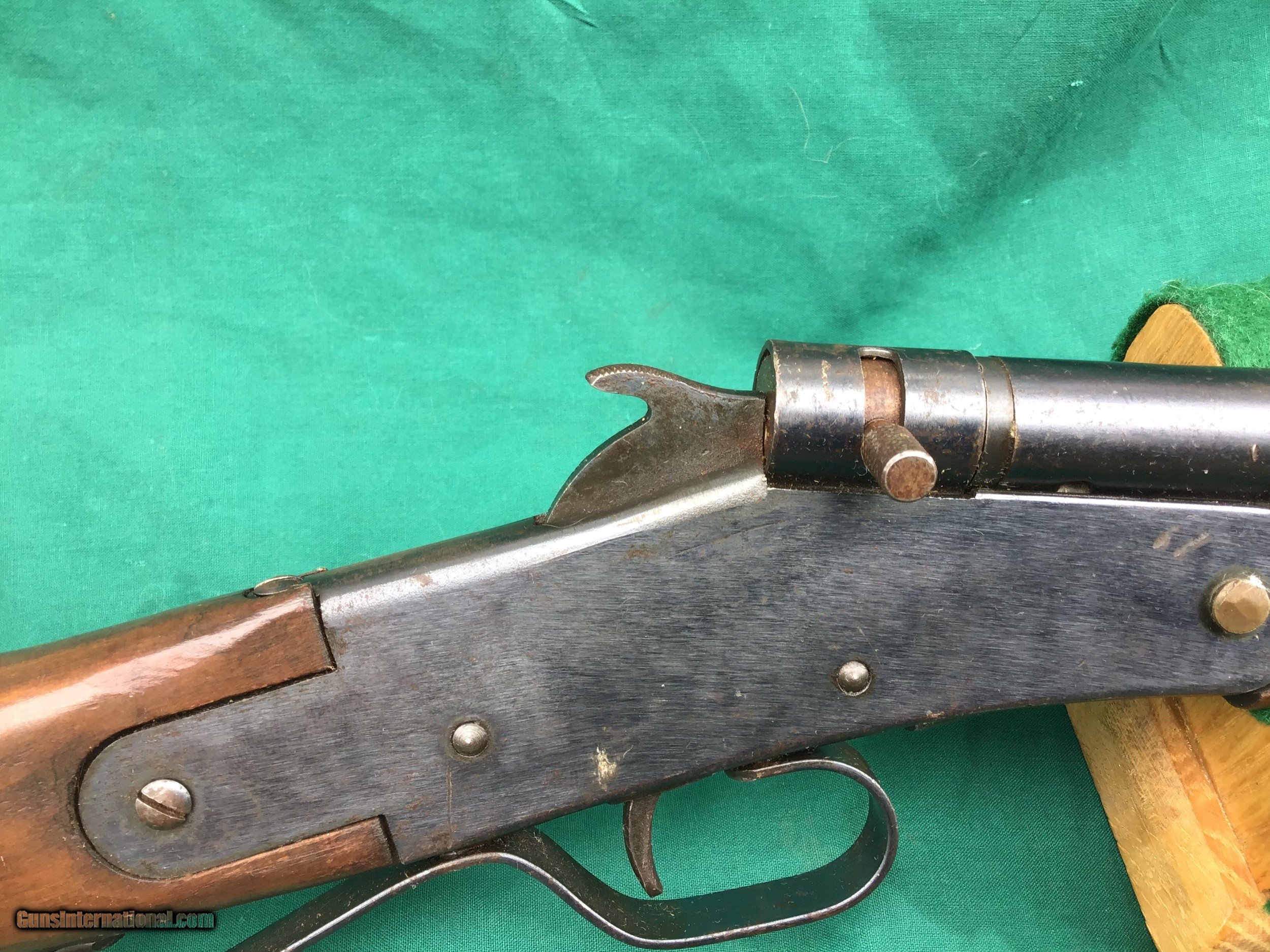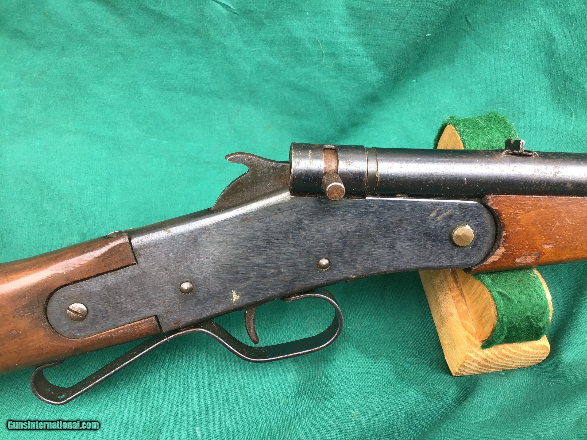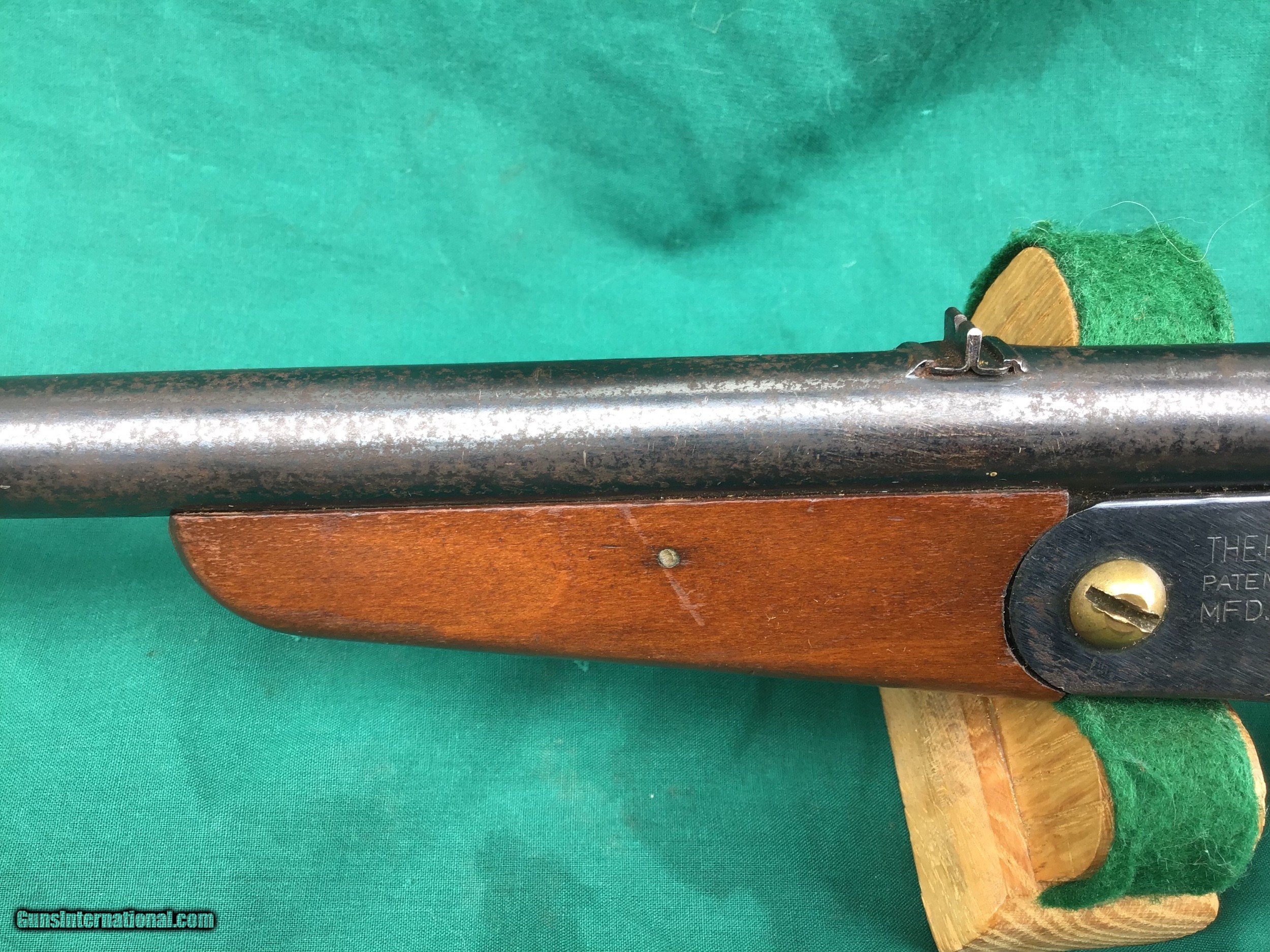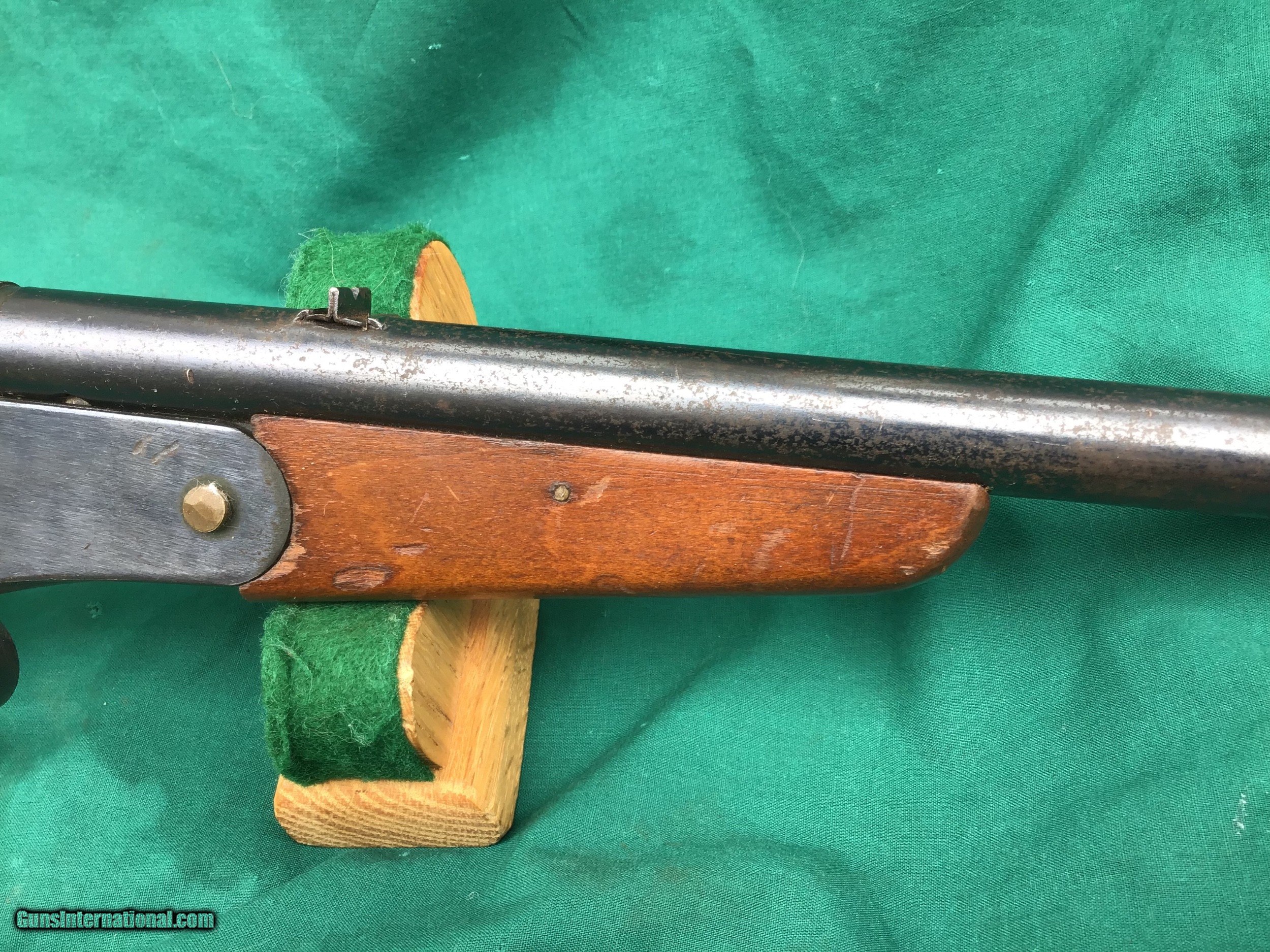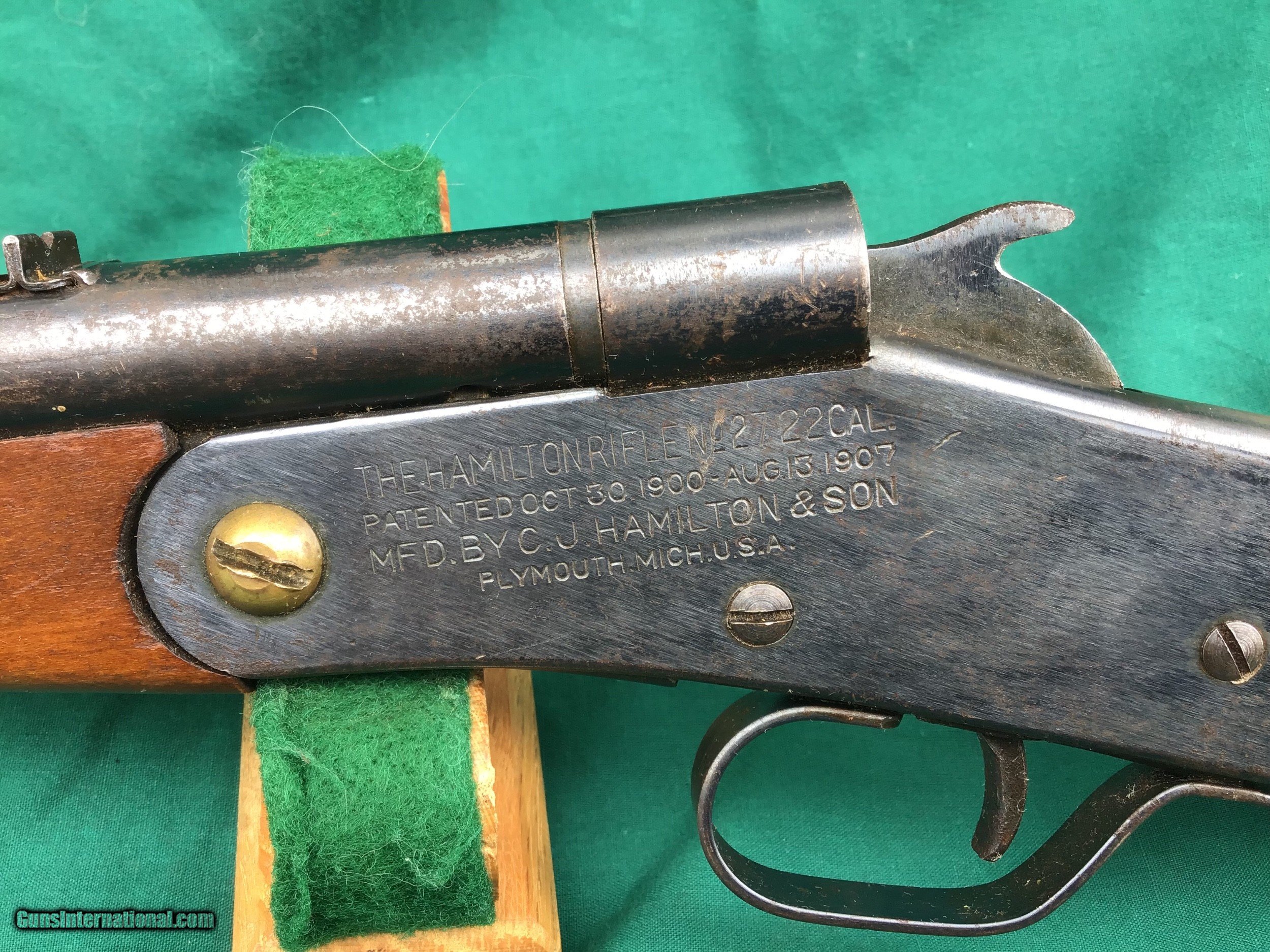 Description: Sold .......This is probably one of the best Hamilton Model 27 that I’ve seen in a very long time. .22 caliber with 16” barrel. The bore is very nice and I will rate a 7 on a scale from 1 to 10. I will rate the overall finish 85 to 90% original blue with brown patina mixing in throughout. Great markings. Both forend and buttstock are in good condition showing normal handling marks you would expect to see from a boys rifle. The only negative thing I can say is that the takedown screw was obvious lost sometime in the past and replaced with a brass screw. It will be hard to find a better one. Must ship to a FFL or Curio and Relics license holder. This firearm as with any other should be checked first by a gunsmith before any attempt is made to fire / operate it. Please feel free to ask questions. SOLD Antique: Yes Manufacturer: Hamilton Model: 27 |