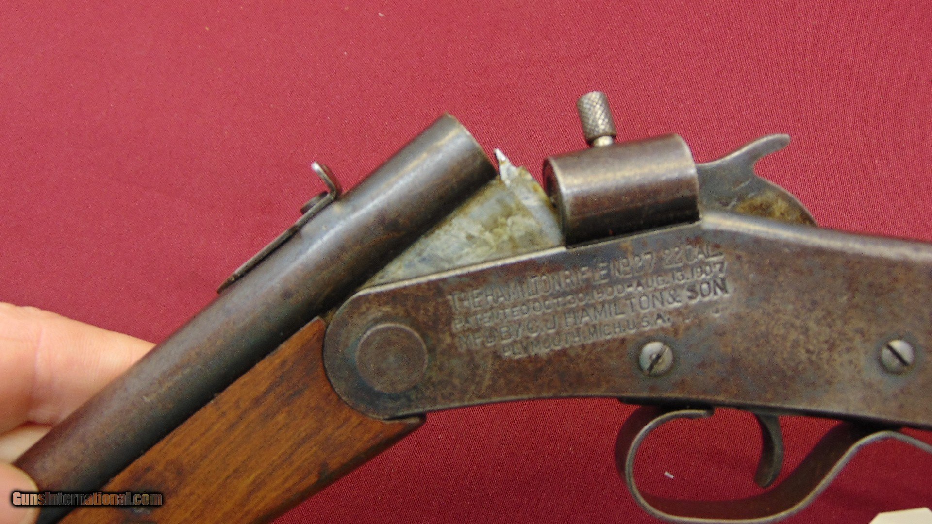Description: SOLD -- HAMILTON MODEL 27 BREAK ACTION SINGLE SHOT BOYS RIFLE 22 CALIBER C&R OR FFL LICENCE REQUIRED FOR SHIPPING.HAMILTON MODEL 27 BREAK ACTION BOYS RIFLE 22 CALIBER.NSN,LAST PATD DATE IS AUG,3RD 1907/C.J. HAMILTON & SON PLYMOUTH MICH.U.S.A. 15" BARREL WITH A GOOD BORE.GOOD SOLID WOOD.ORIGINAL BLUE TURNING A BLUE PLUM PATINA.NEAT LITTLE BOYS RIFLE. ADD 35.00 UPS GROUND SHIPPING FOR RIFLES ADD 35.00 UPS 2ND DAY AIR SHIPPING FOR HANDGUNS EASTERN BRANCH FIREARMS Questions e-mail or call Glen at Eastern Branch Firearms 207-215-5021 Fax number 207-588-7605 TERMS – PLEASE READ BEFORE I DO NOT HAVE A LAYAWAY OPTION ( I DO ACCEPT CREDIT CARDS ) -- I GET ALOT OF REQUEST FOR TRADES, I WOULD PERFER NOT TO DO TRADES ON MY INTERNET LISTINGS. LEGAL REQUIREMENT- Modern firearms must be transferred through a licensed FFL dealer in your area. to supply a signed copy of local dealer’s license before shipment will be made. A C&R License is acceptable for C&R firearms only (guns determined to be C&R’s by ATF and guns known to be at least 50 years old). California law will NOT allow shipment of C&R handguns direct to a C&R holder in the State of California, a 01 FFL LIC. dealer must be used. Antique firearms require to supply proof of age. Some areas still require an FFL transfer for antique & black powder firearms (New Jersey, NYC, etc.) Large capacity magazine restrictions: New Jersey - 15 round maximum for semi-automatic firearms only. California - 10 round maximum for all magazines. Maryland - 20 round maximum for all magazines. Massachusetts - over 10 rounds. Hawaii - 10 round maximum for all handgun magazines. PAYMENT OPTIONS- We accept money orders, cashier’s checks , bank checks. sorry no personal checks. We accept all major credit cards please add 3% to the ’s cash discount price.(Maine Residents to pay 5% sales tax) .Handguns and long guns do need to be shipped separate. PLEASE do not send payment via FED EX . USPS & UPS are fine. Thank you. We include a signed copy of our FFL with each firearm shipped SAFTY NOTICE- Buyer is solely responsible for determining that a used gun is safe to shoot. The firearms offered have not been test fired but have been given a visual inspection only for purposes. It is a requirement that every used firearm is inspected by a qualified gunsmith before firing. By , the buyer agrees to hold seller harmless against damages, injury, or death caused by defective merchandise. RETURN POLICY- All firearms come with a 3-day non firing , non messing with ( turning srews ,taking apart,removing parts, scoping. firing, cleaning or messing with in anyway) inspection/return privilege.Inspection is based on a visual review of the gun to confirm the gun is in the condition stated. In the case of a return, buyer pays all shipping charges & if paid for with a credit card buyer absorbs the 3% credit card charges . So please ask questions BEFORE you bid. Thanks for Looking and Good Luck!! U.S. sales only, no exports…this includes antiques. I will ship to third party for exporting- SOLD Curio/Relic: Yes |