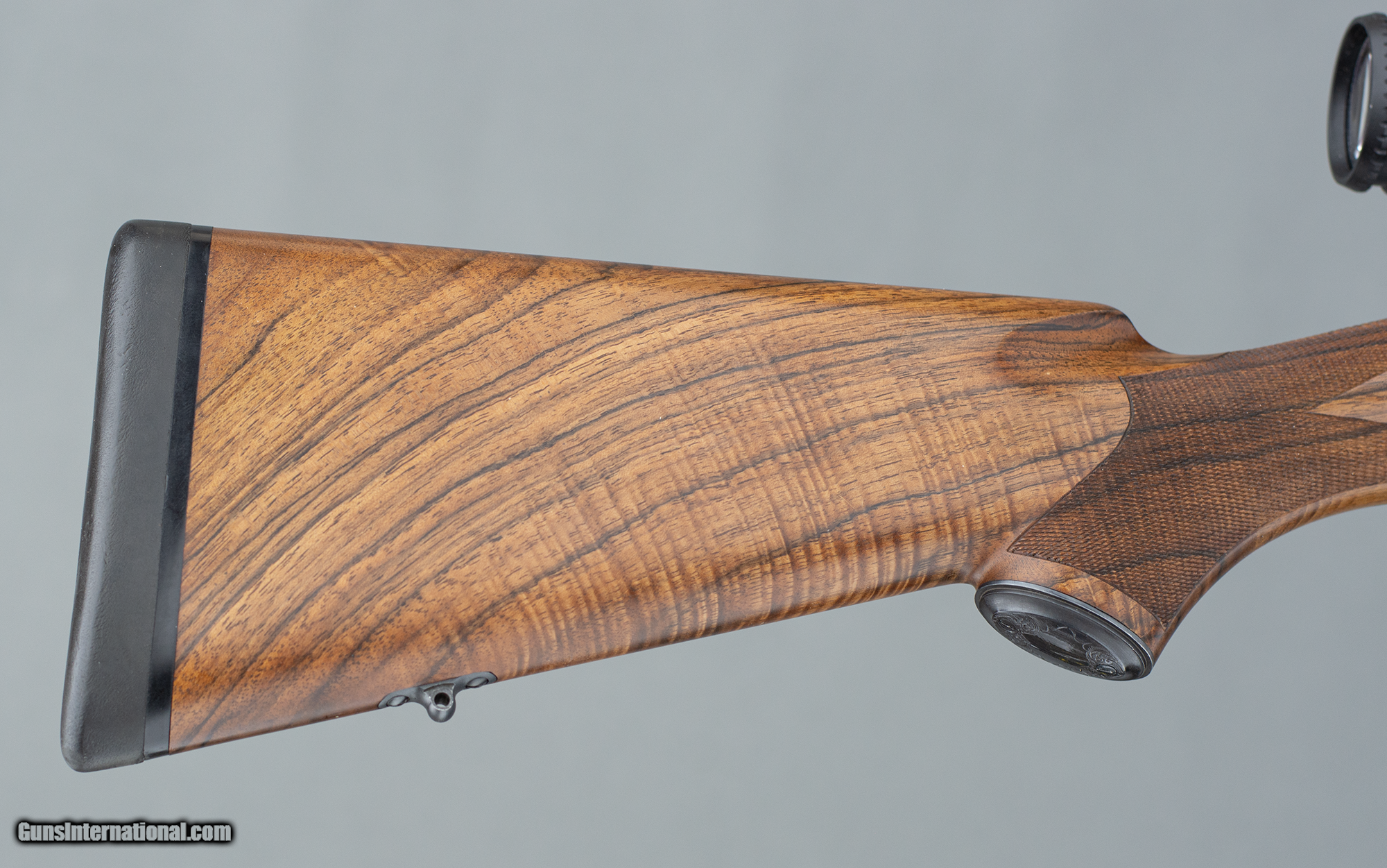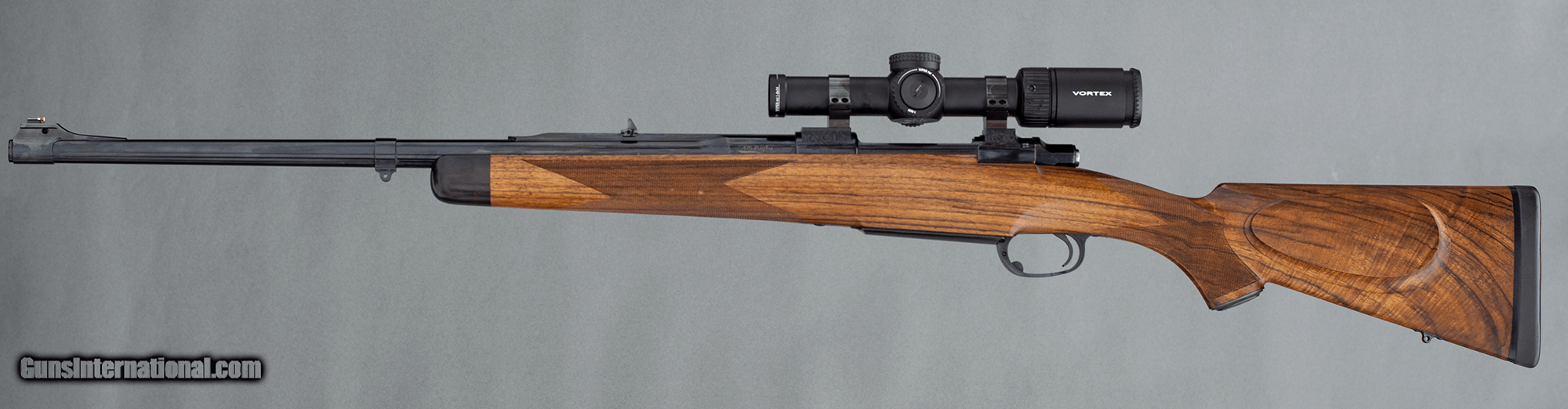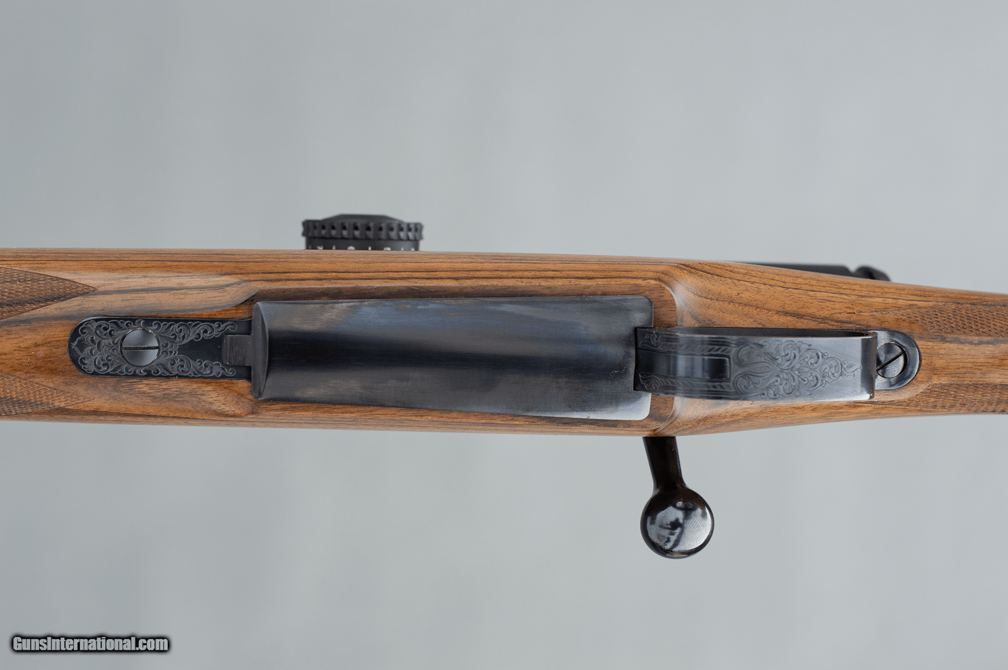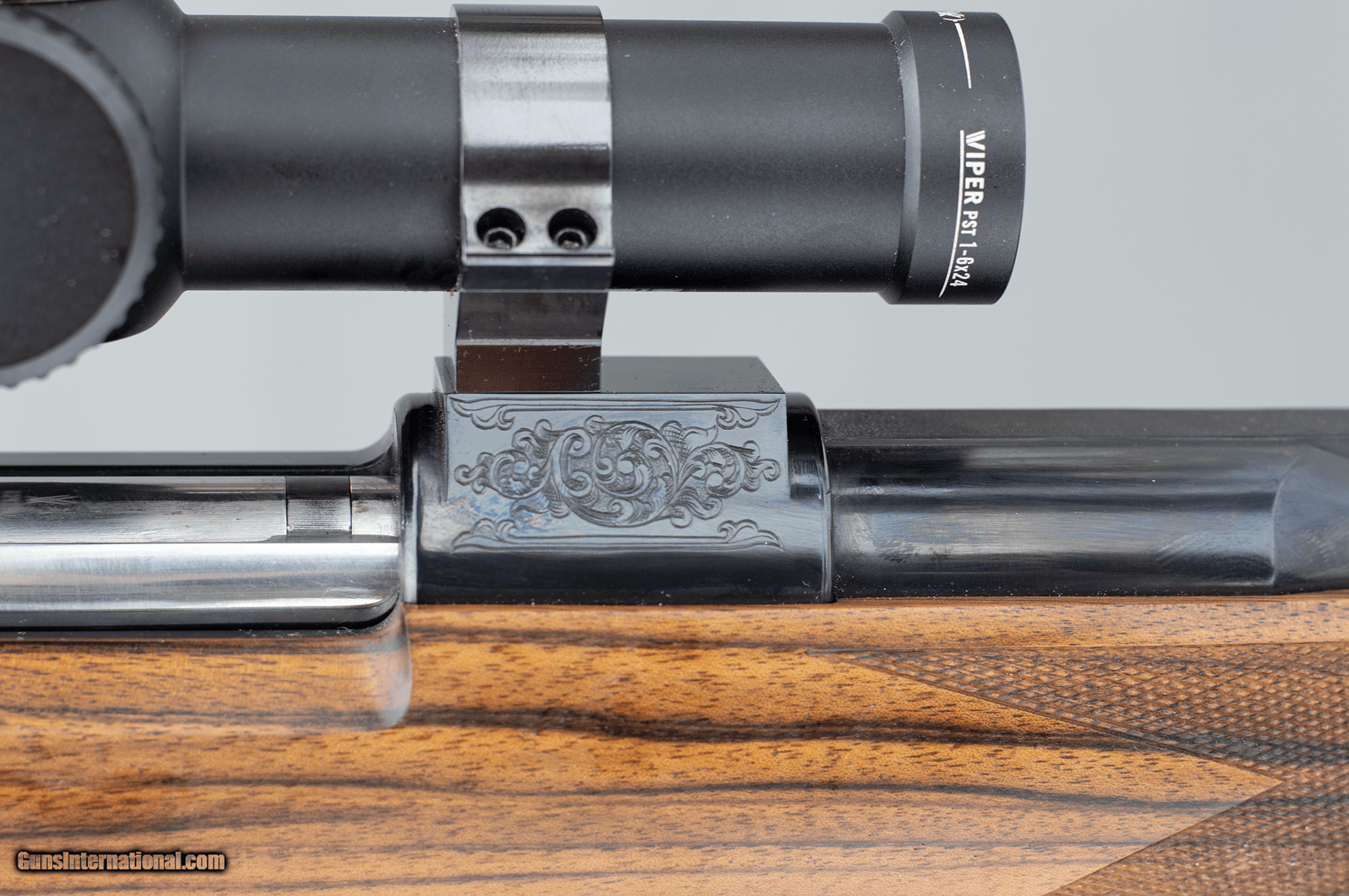 Description: Built on a Granite Mountain Arms action, this .416 Rigby was a collaboration between Granite Mountain Arms doing the metal work and stockmaker Robert Szweda. Engraving by Mark Swanson. The Krieger barrel features an integral quarter rib with a single express sight with a gold line. The Masterpiece front sight has a flip up ivory beed sight insert. Nice piece of English walnut with a good amount of fiddleback figuring in the butt. The Vortex PST 1-6x24 is included along with the Granite Mountain Arms fixed rings. SOLD Rifle Caliber: .416 Rigby Manufacturer: Granite Mountain Arms |