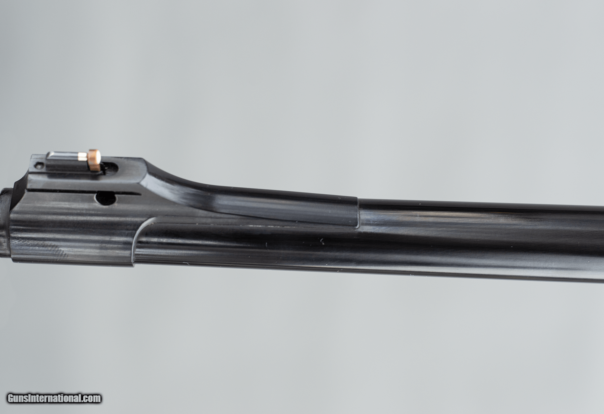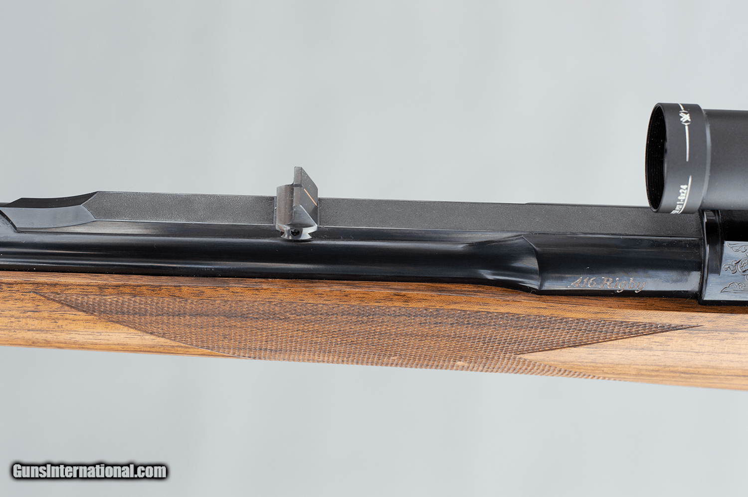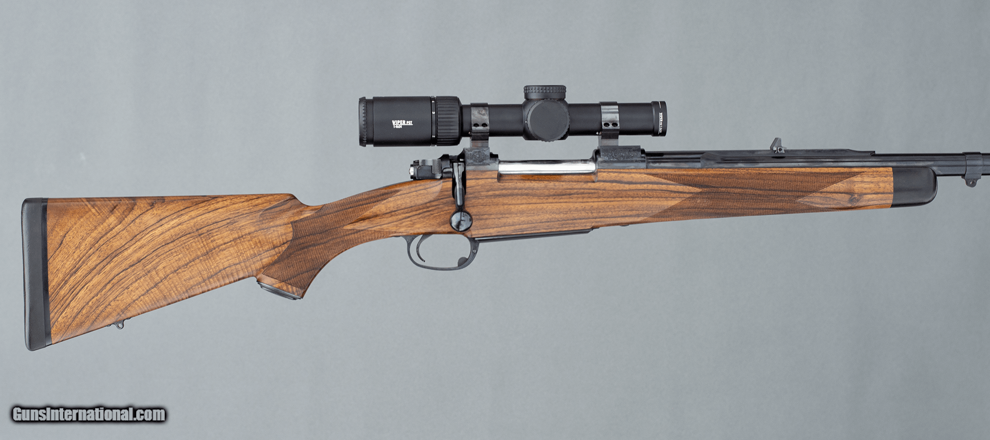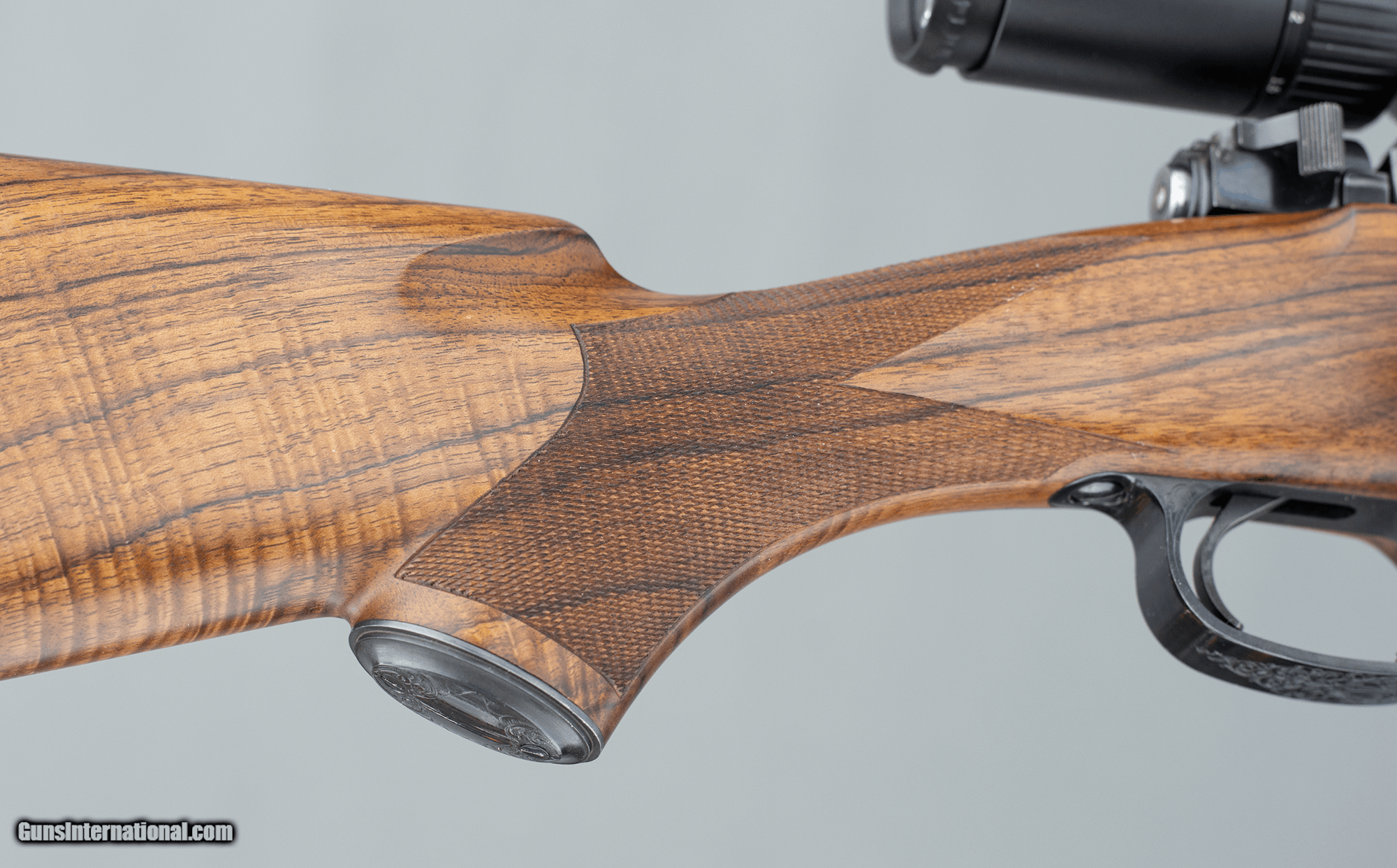 Description: Built on a Granite Mountain Arms action, this .416 Rigby was a collaboration between Granite Mountain Arms doing the metal work and stockmaker Robert Szweda. Engraving by Mark Swanson. The Krieger barrel features an integral quarter rib with a single express sight with a gold line. The Masterpiece front sight has a flip up ivory beed sight insert. Nice piece of English walnut with a good amount of fiddleback figuring in the butt. The Vortex PST 1-6x24 is included along with the Granite Mountain Arms fixed rings. SOLD Rifle Caliber: .416 Rigby Manufacturer: Granite Mountain Arms |