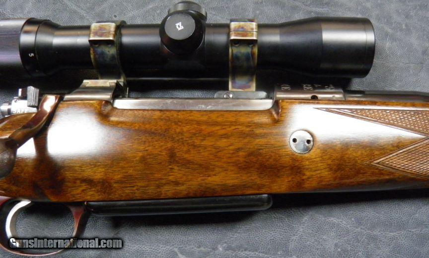 Description: J. RIGBY & CO, .416 RIGBY FULL-STOCKED BOLT-MAGAZINE SPORTING RIFLE, 22 1/8in. nitro barrel engraved in gothic script 'J. RIGBY & CO. LONDON. ENGLAND.', block-mounted open sights with two folding leaf sights, gold-inlaid sight lines and marked '100', '200' and '300', block-mounted bead fore-sight with fold-over protector hood, receiver ring engraved in bold type 'RIGBY'S SPECIAL 416 BORE FOR BIG GAME', receiver mounted with a Docter 1,2-5x32 M spherical scope in colour-hardened quick-detach mounts, rings engraved 'J. RIGBY & CO. LONDON.', and 'CAL .416 RIGBY', solid side wall engraved 'J. RIGBY & CO. LONDON. ENGLAND.', colour-hardened recoil block, hinged floorplate with push button release and gold-inlaid with the calibre designation in a flowing banner, bolt handle with chequered panels, full length pistolgrip stock with cheekpiece, steel fore-end finial and pistolgrip-cap, sling eyes, 14 3/4in. pull including 3/8in. rubber recoil pad SOLD |