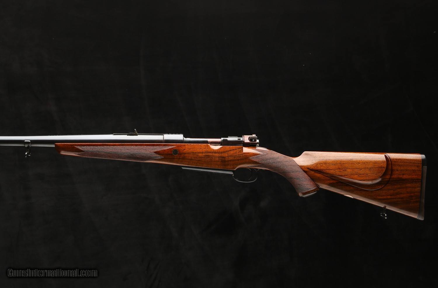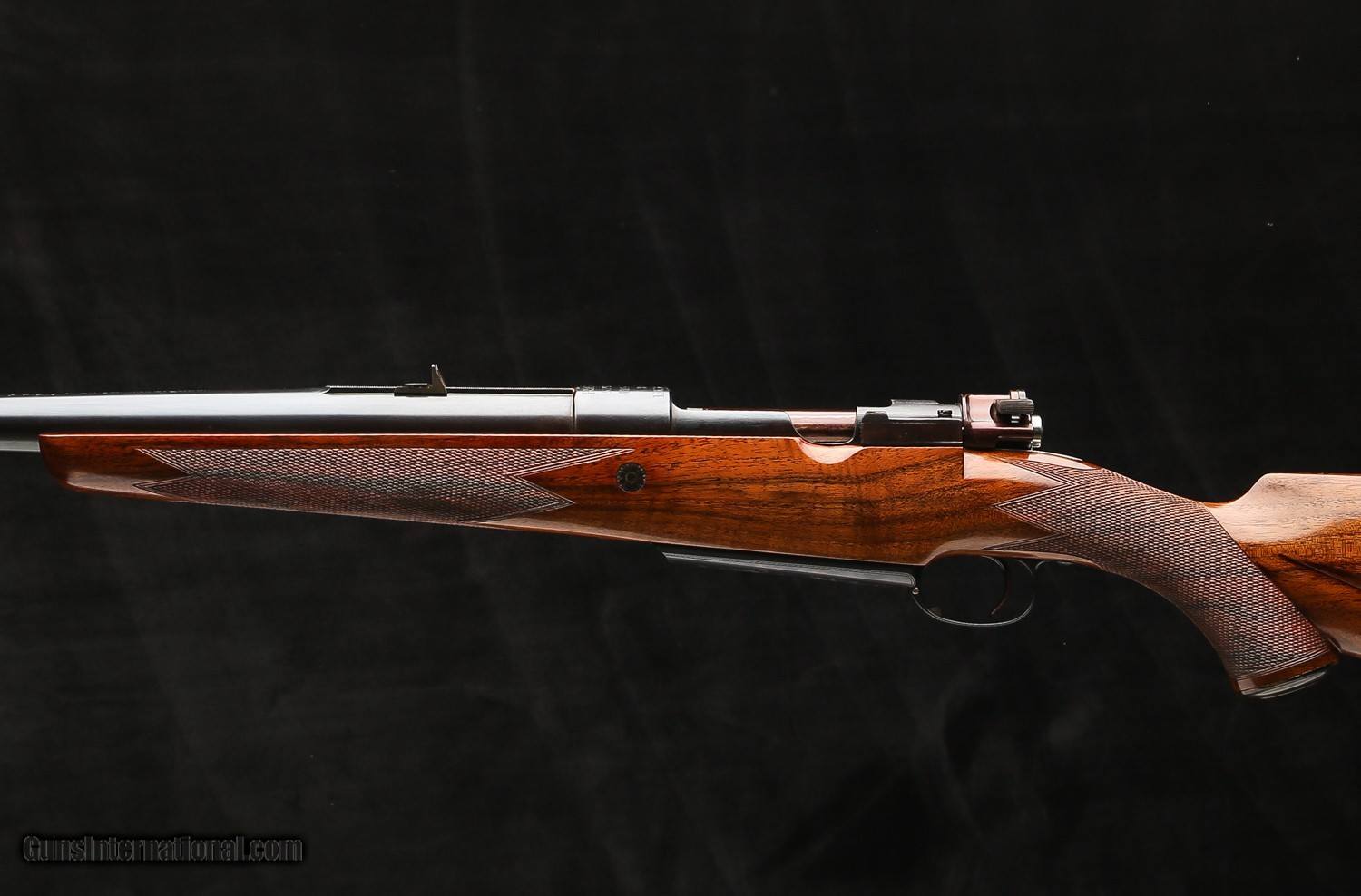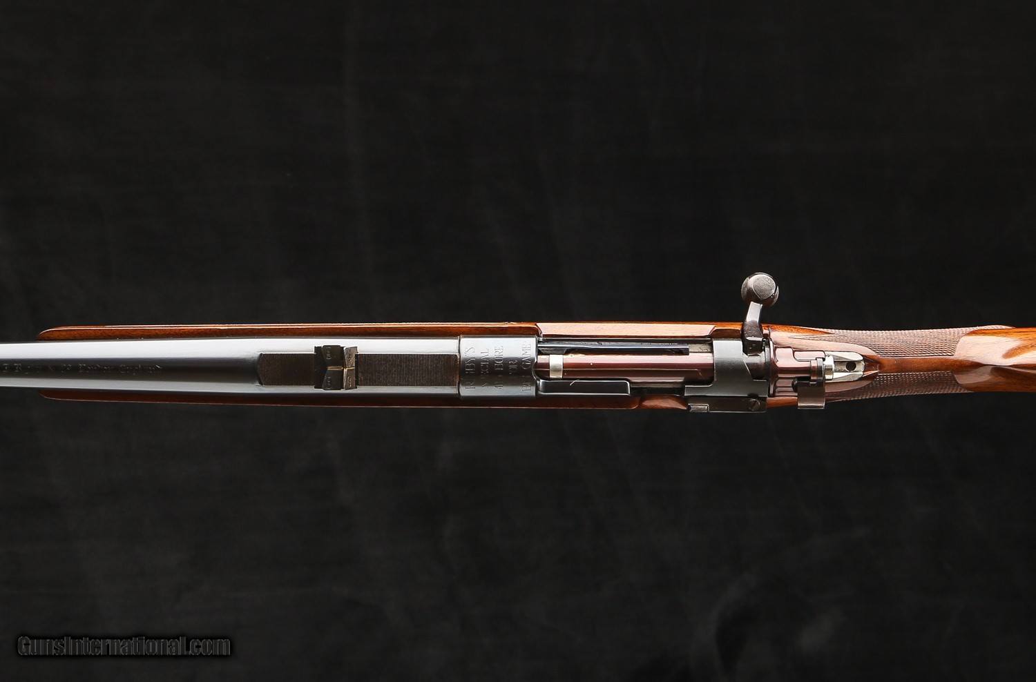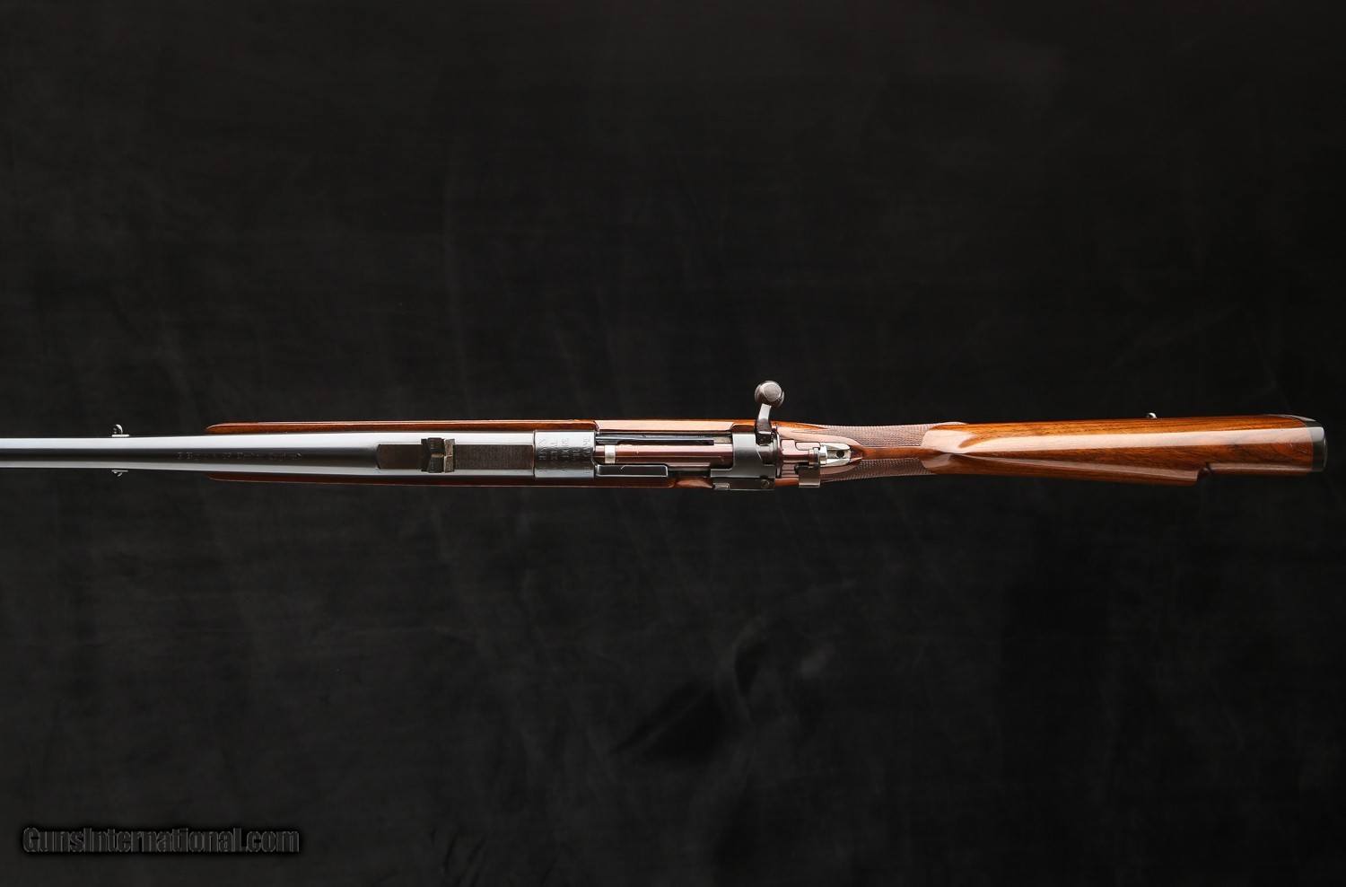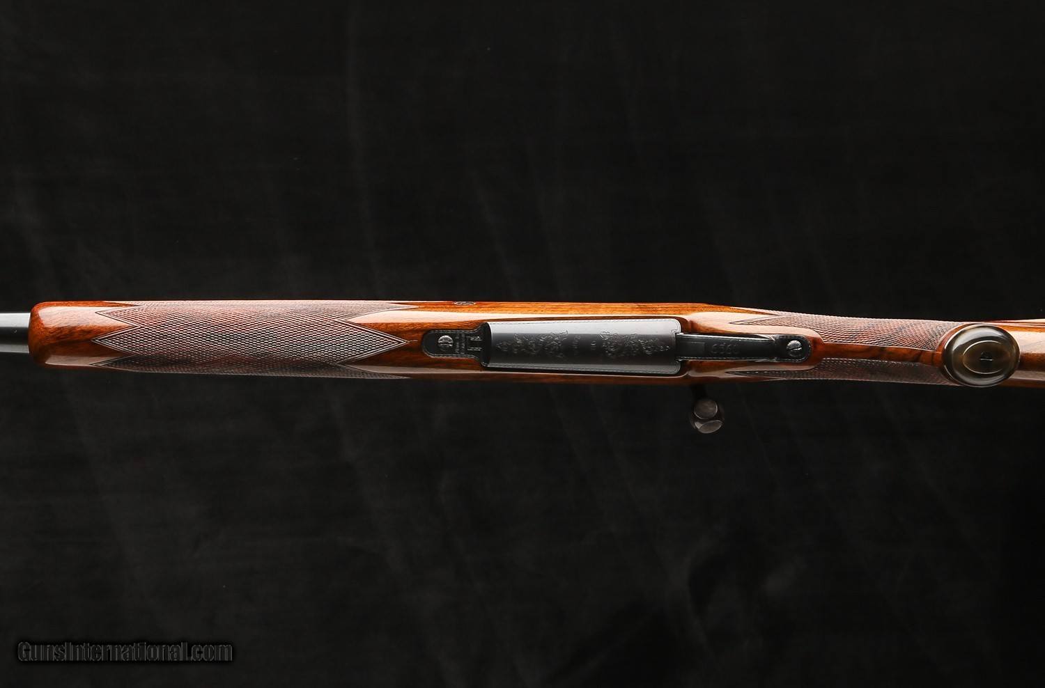 Based on an original Oberndorf standard length Mauser action with a single stage Mauser trigger, tradtional flag safety that is marked “SAFE” in gold, a 5-panel checkered bolt knob, Nitre blued extractor and bolt release, and a drop belly magazine that holds 4 rounds down. The one-piece bottom metal has a straddle floor plate w/ an inside-the-bow release and is engraved in a traditional scroll around “Rigby .416” in the center of the floorplate.