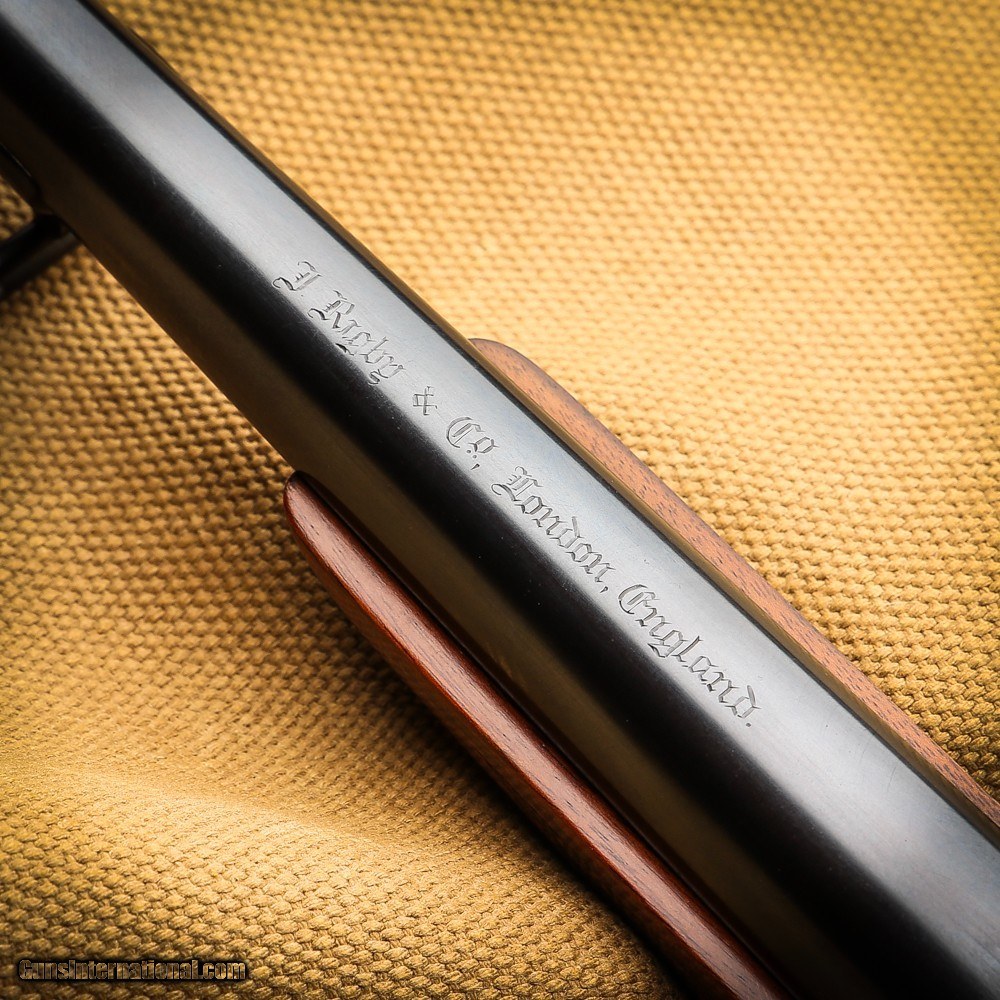 The 22” barrel has Rigby’s pattern quarter rib that is hand filed and has 1 standing/1 folding leaf Express sights lined in gold and engraed w/ their respective distance (100, 200 yds). The ramp of the foresight is stippled and hand filed on the flat of the sight that has a single brass bead and a removeable sight hood. There is a sling swivel attached to the bottom of the barrel and engraved on top of the barrel in Old English script: J. Rigby & Co. London, England.