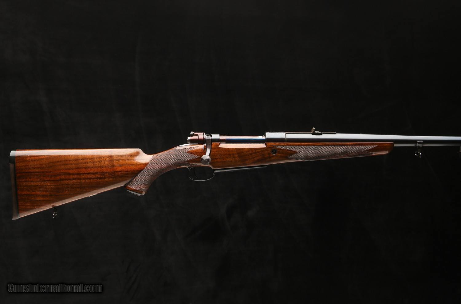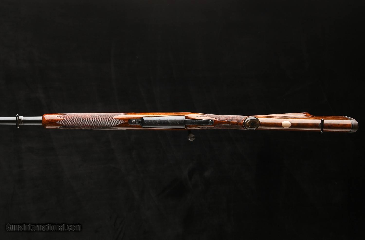 The rifle is stocked in a walnut stock w/ nice straight grain w/ a RH beaded cheekpiece, 14 ¾" LOP over a thin rubber pad that has a hard rubber heel plate to prevent snagging on one’s shirt when the rifle is shouldered and the standard pad used by Rigby’s during this period. The grip and forend are checekred in a 24 lpi point pattern w/ Mullered borders and there is a solid horn grip cap and a single recoil bar that is color hardened and engraved. The stock has a sling swivel along the toe line w/ a stock oval that remains blang.