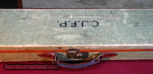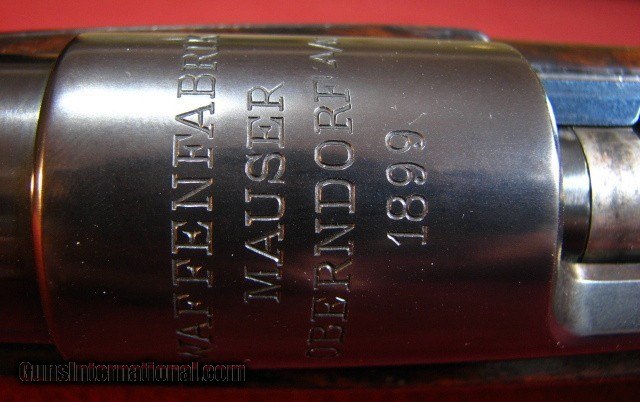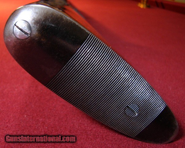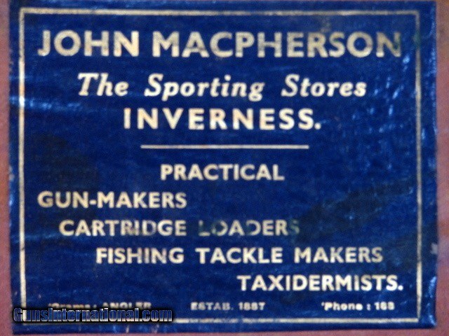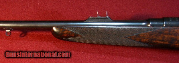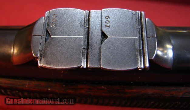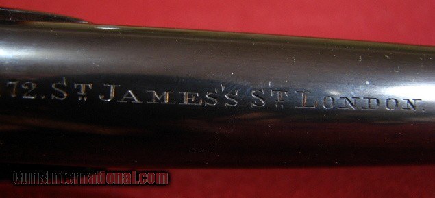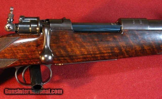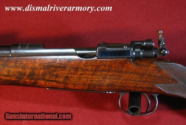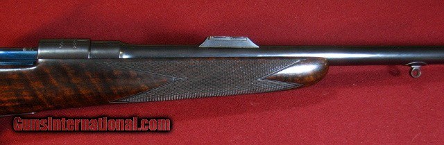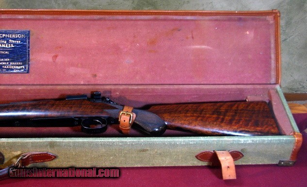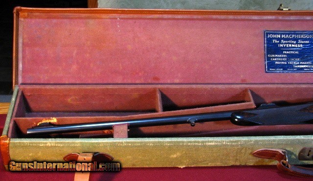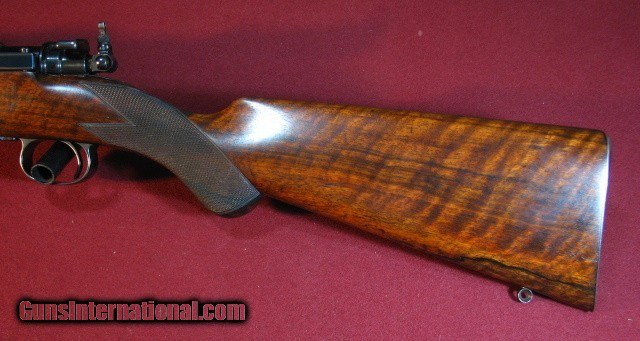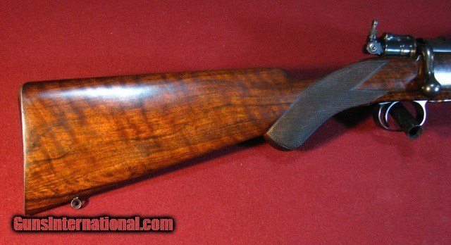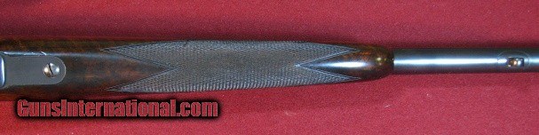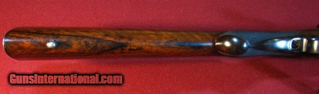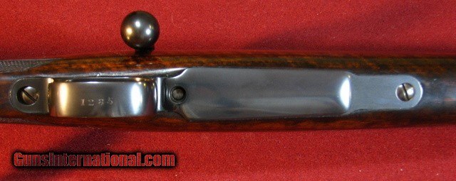 Description: John Rigby & Co. 72 St. James's St London .275 Rigby Mauser built in 1899 with a 26" barrel with an excellent bore which features an island front sight, sling eye, and two leaf island express rear sight. The action is a Pre-98 "Transitional" small ring action, the immediate precursor to the Gewehr 98. Of the 4,185 "Transitional" actions produced, most were destroyed in testing with a few made into Mauser sporting rifles and a few sold to Rigby for sporting rifle production. From 1898 until 1912 Rigby had exclusive rights to import and disribute Mauser sporting rifles, actions, barreled actions, and components in the British Empire. This action bears Mauser #653 and Rigby #1285. It has a pear shaped commercial style bolt knob, gold inlayed "SAFE" on the flag safety, and a cocking piece peep sight. Stocked in Rigby style with a sling eye on the buttstock, Prince of Wales grip, and striated steel buttplate. LOP is 14 1/4" Weight 7lb 4oz This historic piece remains in fine condition meticulously restored and cased by ACGG member Steve Bertram. It is cased in an English brass cornered canvas trunk case. With this gun in your hands you can smell the smoke of the African camp fire and hear the sounds of the savannah when you close your eyes. If only guns could talk! SOLD |