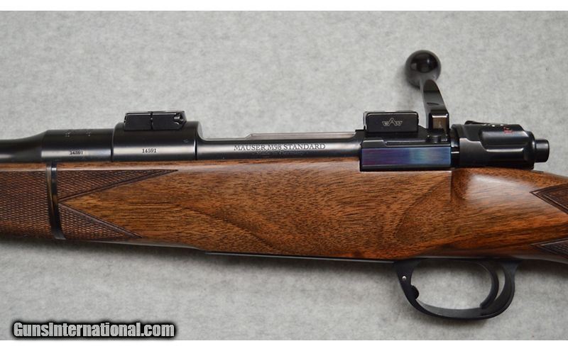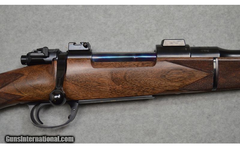 Description: John Rigby Mauser M98 Standard, Take-Down Highland Stalker "Adventurer" #3 of 12, chambered in .30-06 Springfield is in excellent like new condition. It has the serial number inlaid in gold on the trigger guard and "3 of 12" on the magazine floor plate. It has a deluxe Turkish walnut stock, traditional rounded grips with hand-finished checkering and a Rigby oil finish, and a black leather covered recoil pad. The "Adventurer" will feature a standard front foresight, a fixed 65-yard rear sight, and two folding leaf sights regulated to 150 and 250 yards. It includes a limited edition take-down canvas case and cleaning accessories as well as a standard hard case. SN: 14591 .30-06 Springfield SOLD Metal Condition: Excellent Wood Condition: Excellent Bore Condition: Clean and shiny Barrels: 22 Stock Dimensions: LOP 14 1/2 Fore End: Wooden with a checkered pattern Butt Pad: Black leather covered recoil pad Weight: 8lbs 4oz Item Location: Fort Worth, TX |