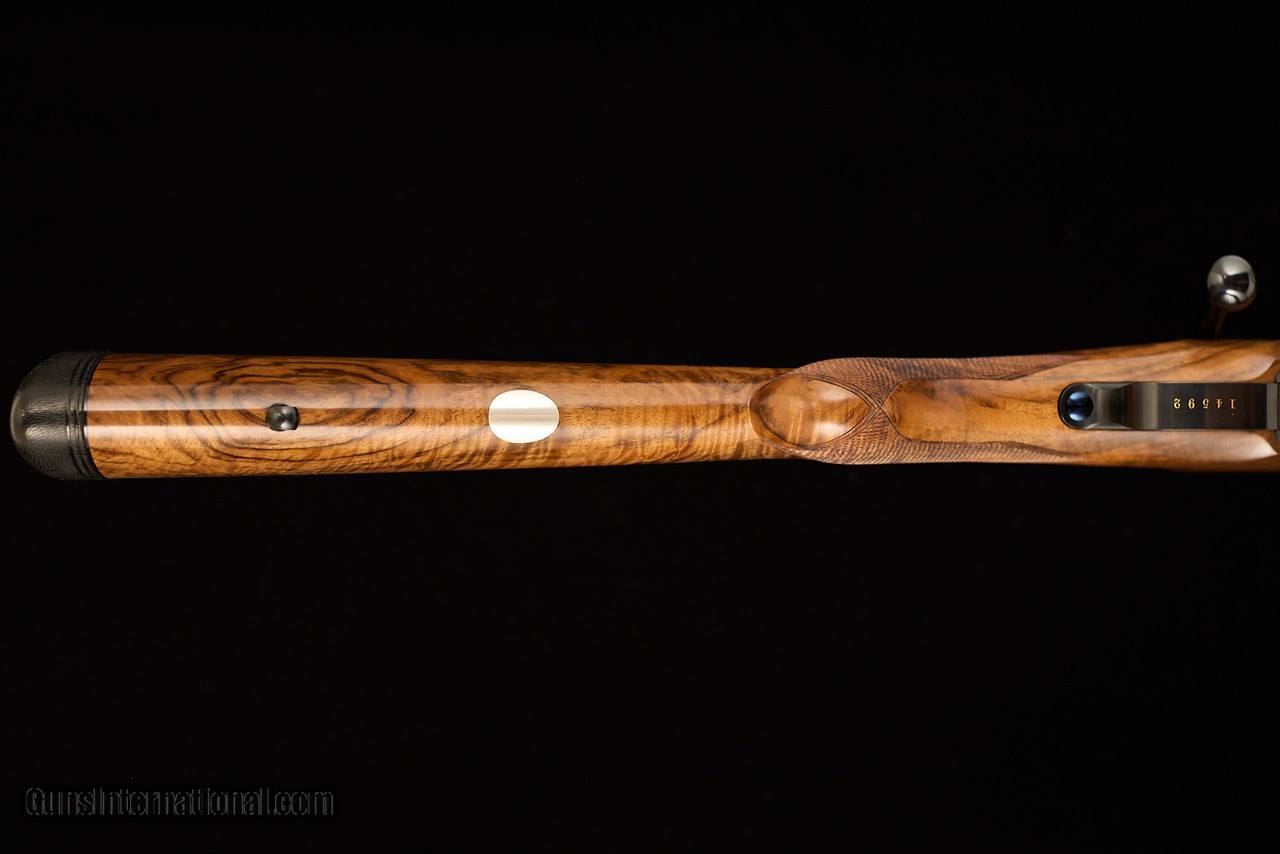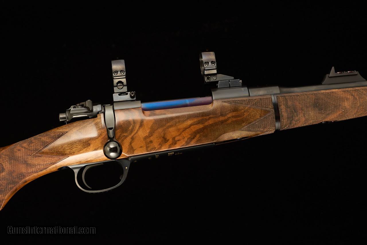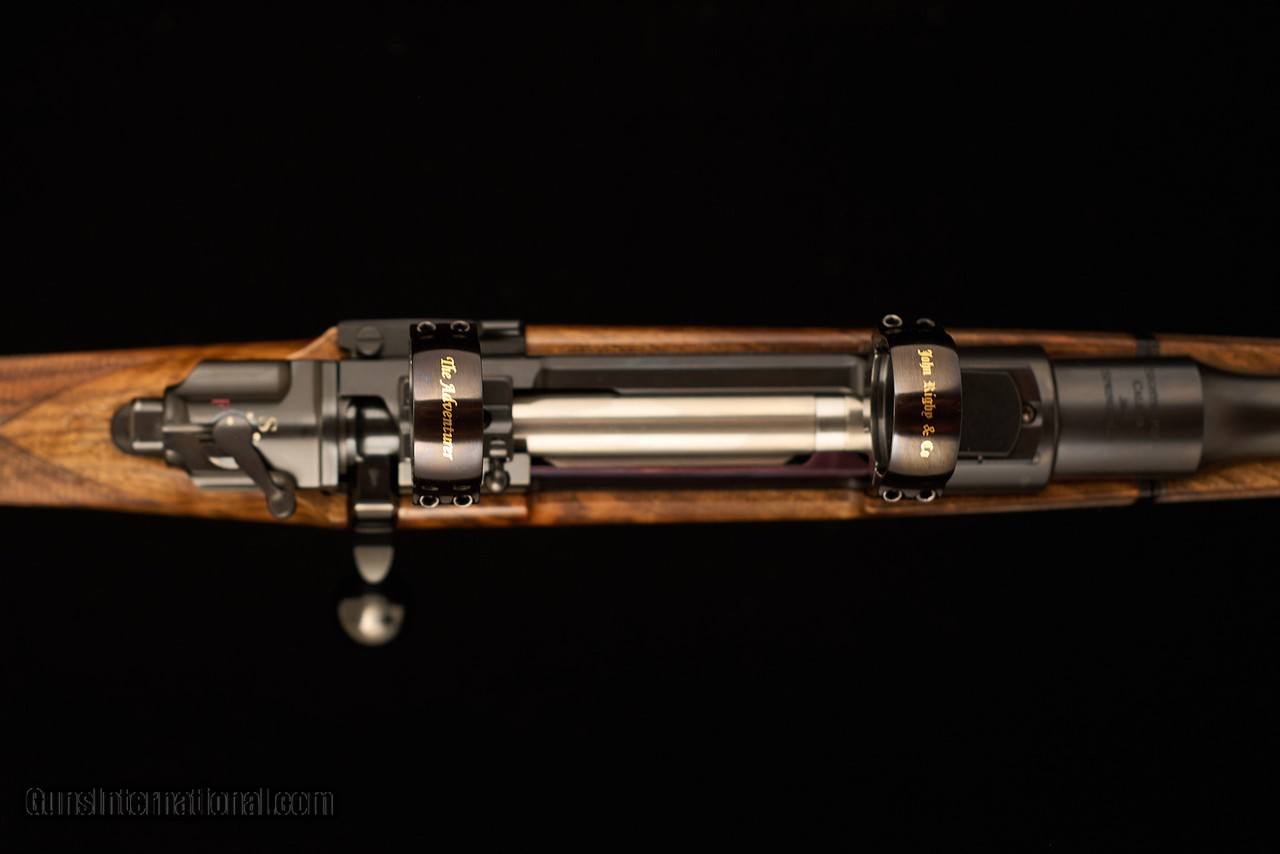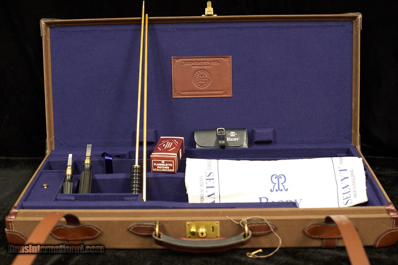 Description: Brand new Rigby Highland Stalker Adventurer takedown rifle, #4 in a series of twelve, chambered in .30-06. Complete in compact luxury travel case. The stock is of gorgeous Turkish walnut with semigloss oil finish over a silver stock oval and leather-wrapped recoil pad. The front and rear EAW swing-off scope rings are engraved "John Rigby & Co" and "The Adventurer" respectively, inlaid with 24k gold. The floorplate is engraved and 24k gold-inlaid with the double-R logo / Rigby / Adventurer / Cal 30-06 / 4 of 12. The serial number on trigger guard is 24k gold-inlaid in the traditional manner. Comes complete with the usual hard plastic Rigby-branded shipper case as well as the luxury takedown case. Manufacturer: J. Rigby & Co Caliber Info: 30-06 Springfield Barrels: 22 Action: Bolt-Action Triggers: Single Gauge: 30-06 Springfield LOP: 14 1/2 Weight: 8.09 Price: 39,995.00 Contact Seller |